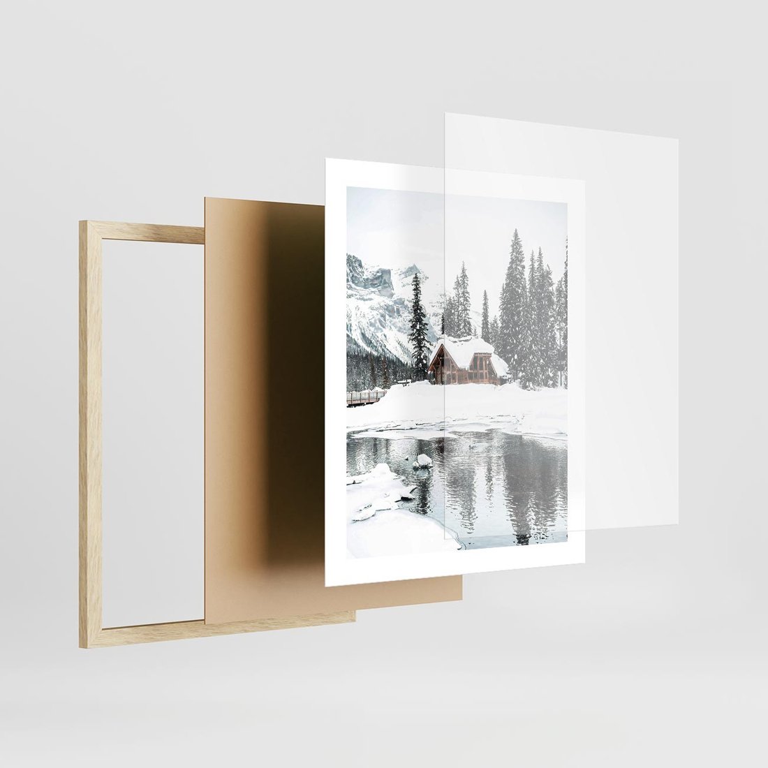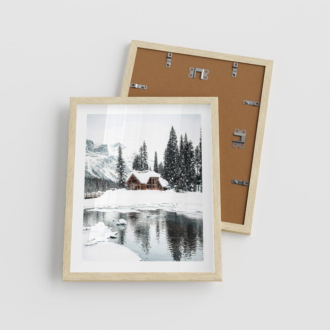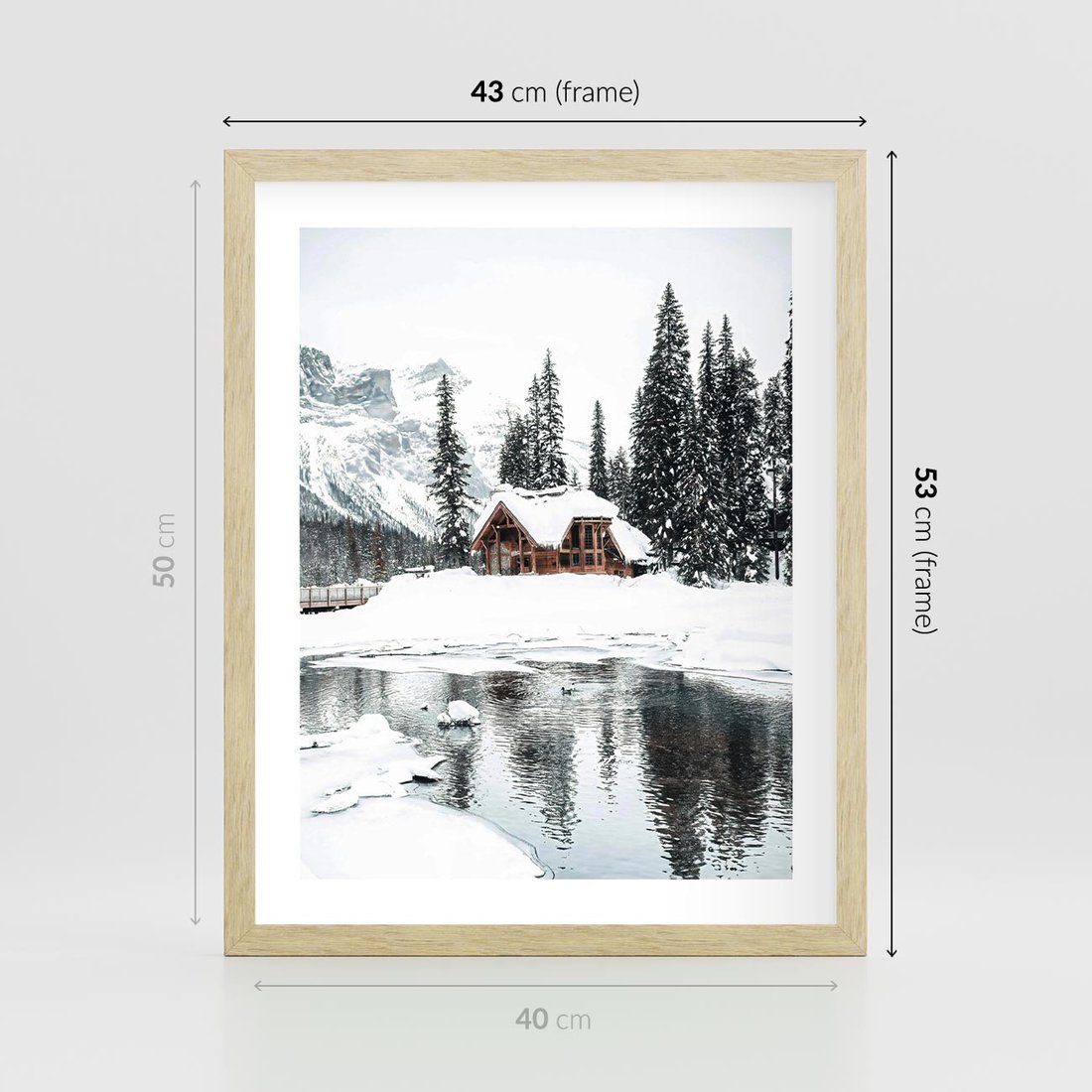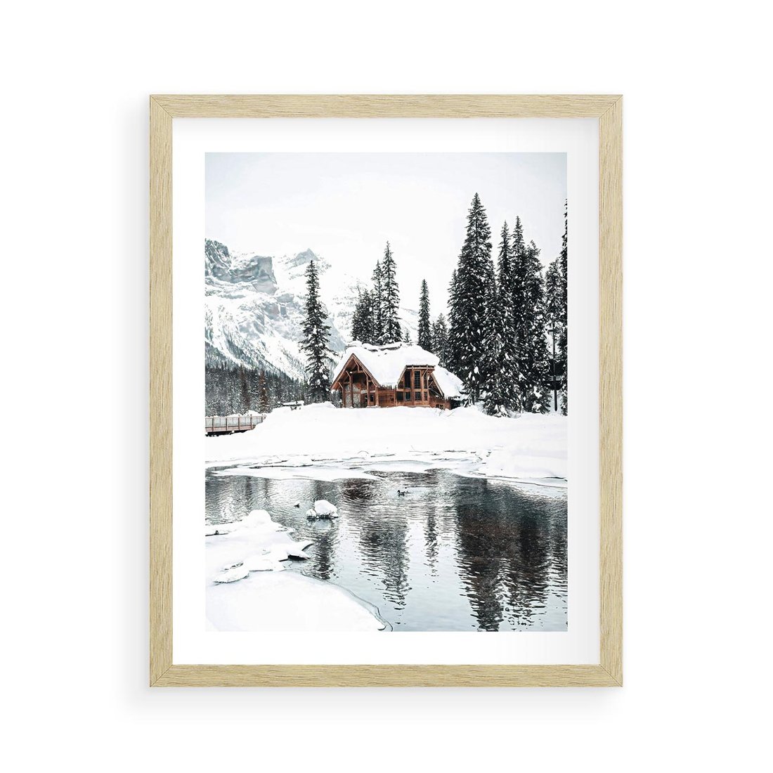 Plakat w ramie 40x50 - Urok Zimowego Krajobrazu - domek w górach, zima - rama drewno