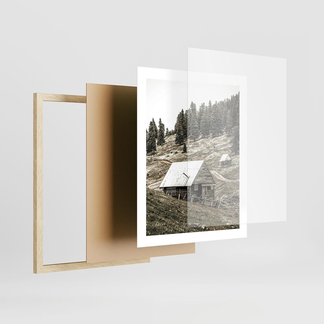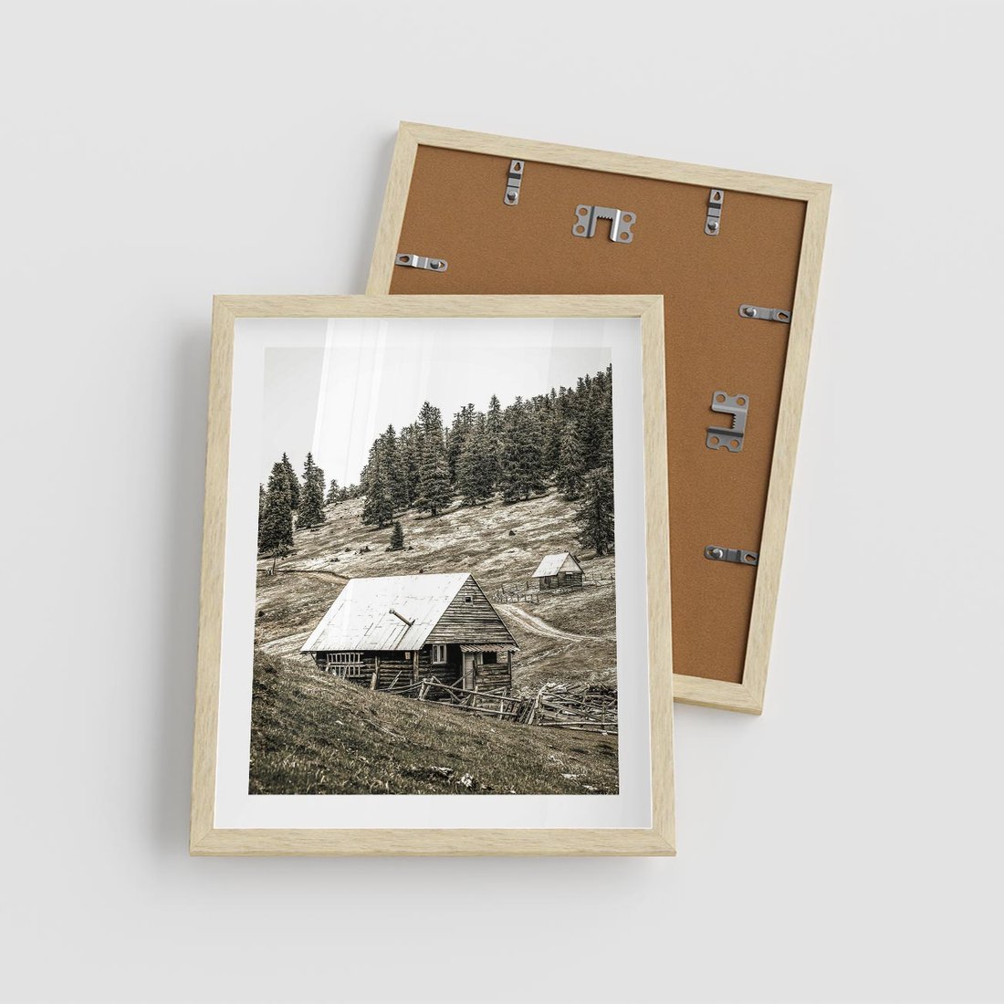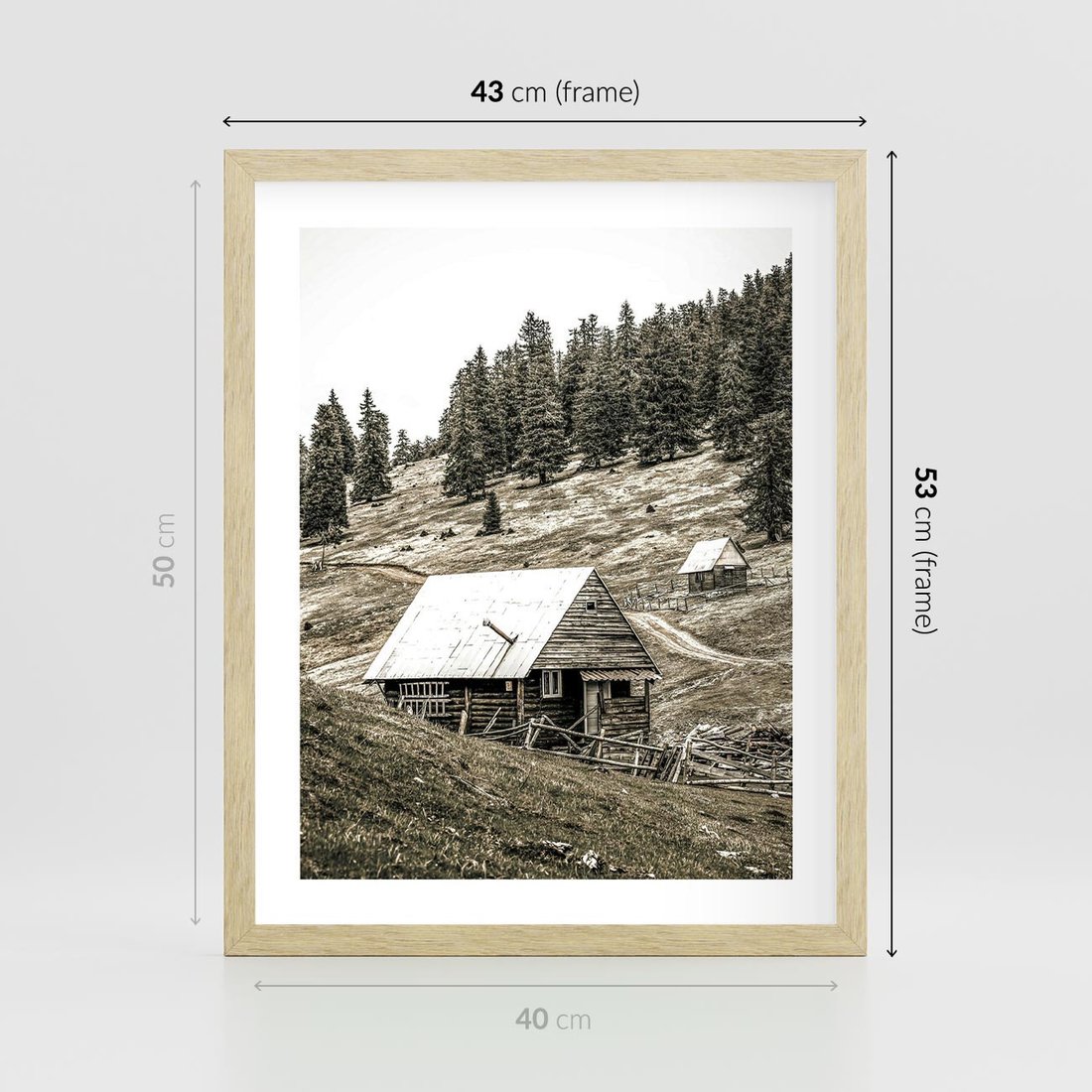 Plakat w ramie 40x50 - Ustronne Chatki w Górach - rustykalne domki w górach, sepia - rama drewno