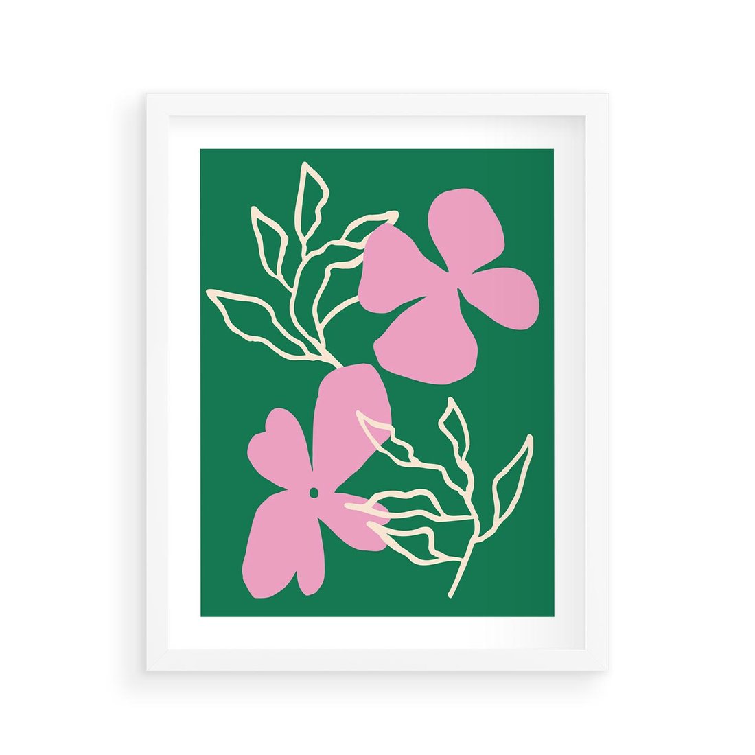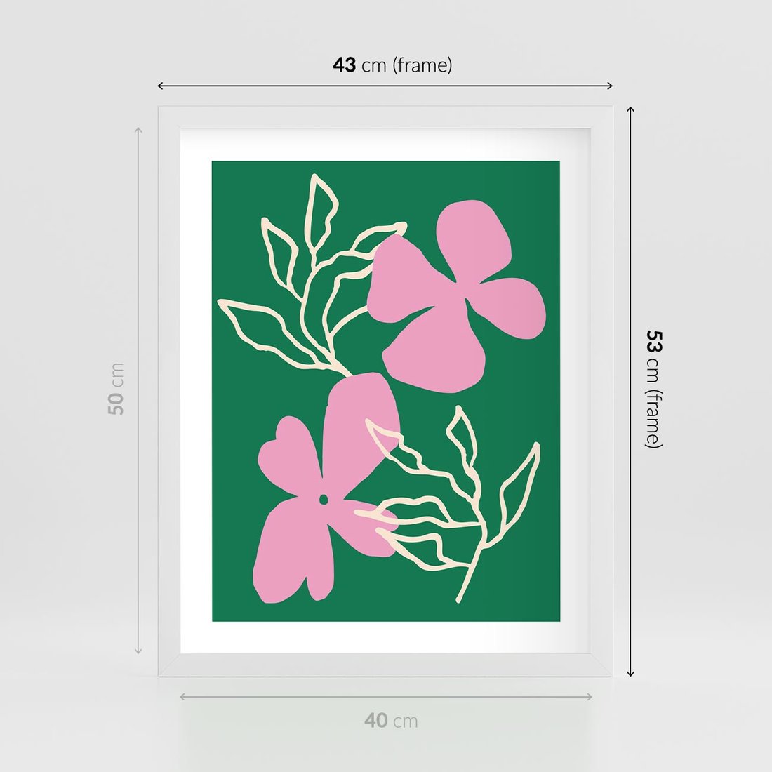 Ten abstrakcyjny plakat w boho stylu ukazuje intensywną zieleń i róż, z delikatnie wkomponowanymi kwiatowymi motywami. Idealnie pasuje do biura, dodając odrobinę natury i artystycznej energii, tworząc inspirujące otoczenie do pracy i twórczego myślenia.