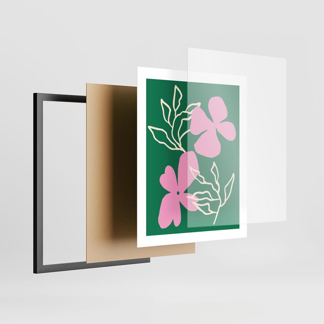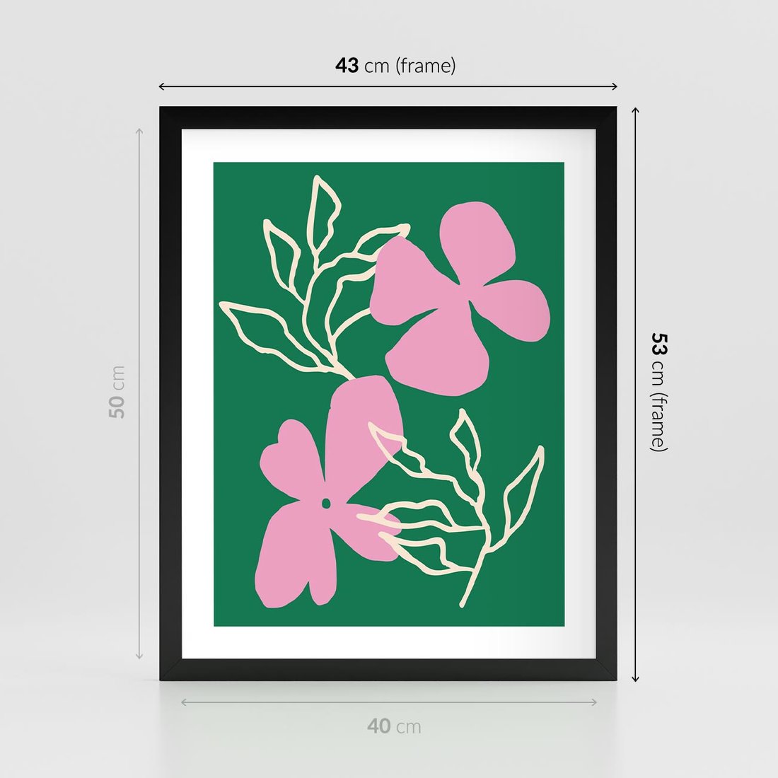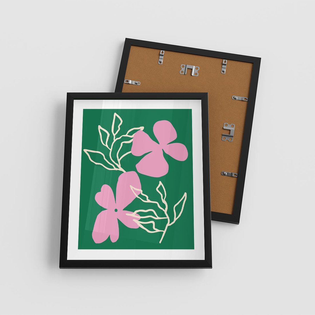 Ten abstrakcyjny plakat w boho stylu ukazuje intensywną zieleń i róż, z delikatnie wkomponowanymi kwiatowymi motywami. Idealnie pasuje do biura, dodając odrobinę natury i artystycznej energii, tworząc inspirujące otoczenie do pracy i twórczego myślenia.