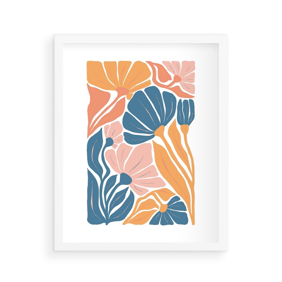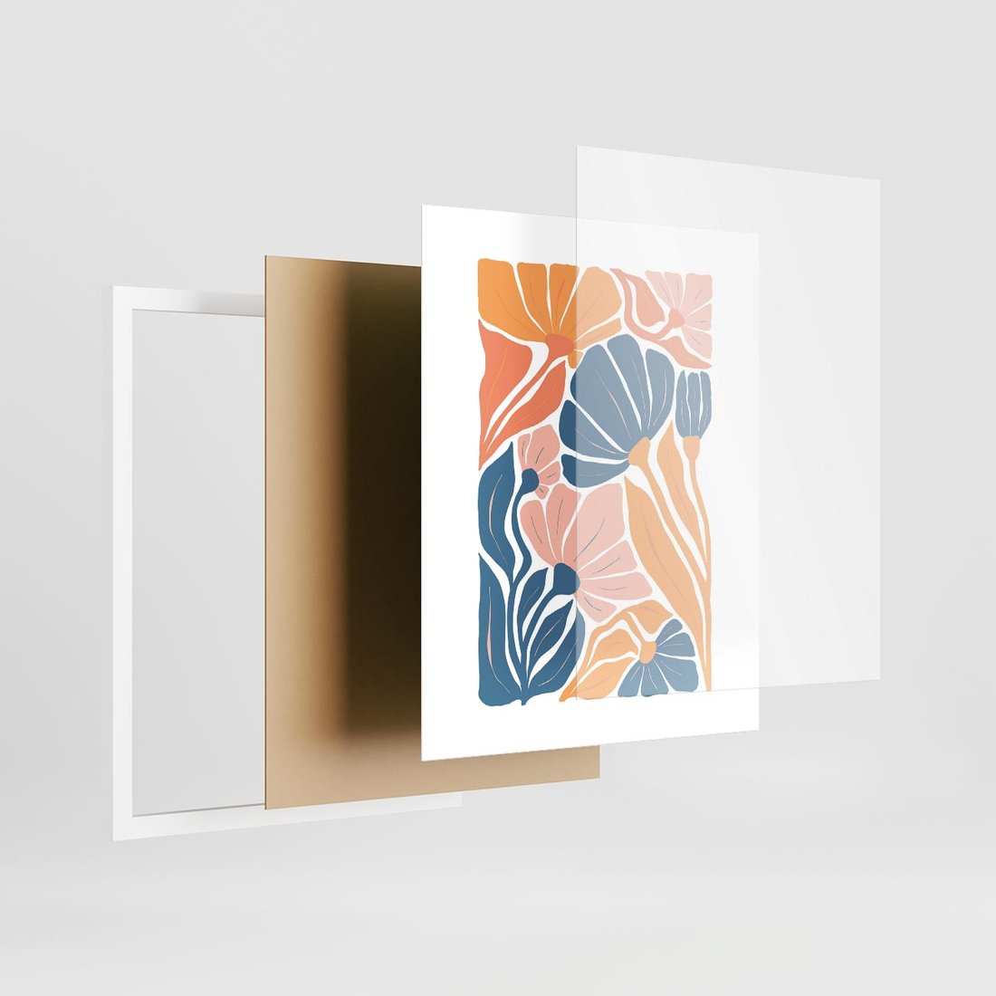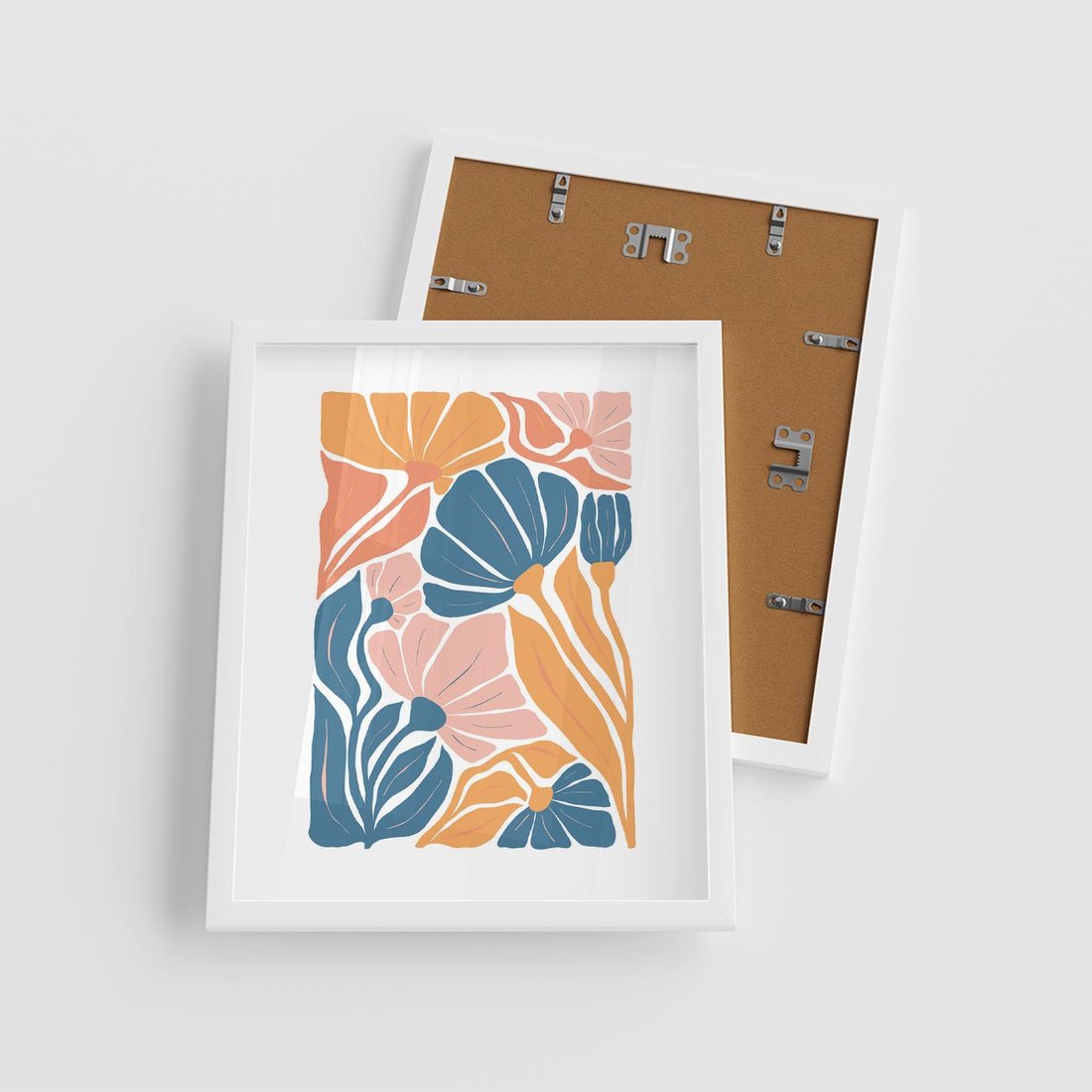 Ta nowoczesna grafika w pastelowych odcieniach niebieskiego, pomarańczowego i różowego ożywia przestrzeń kwiatowym urokiem. To dynamiczna kompozycja, która wnosi do wnętrza subtelne i radosne akcenty. Obraz ten jest wspaniałym sposobem na wprowadzenie kolorowej i nowoczesnej energii natury do Twojego otoczenia.