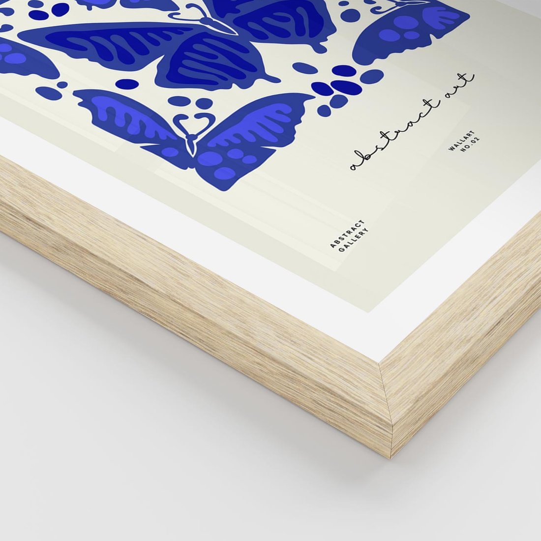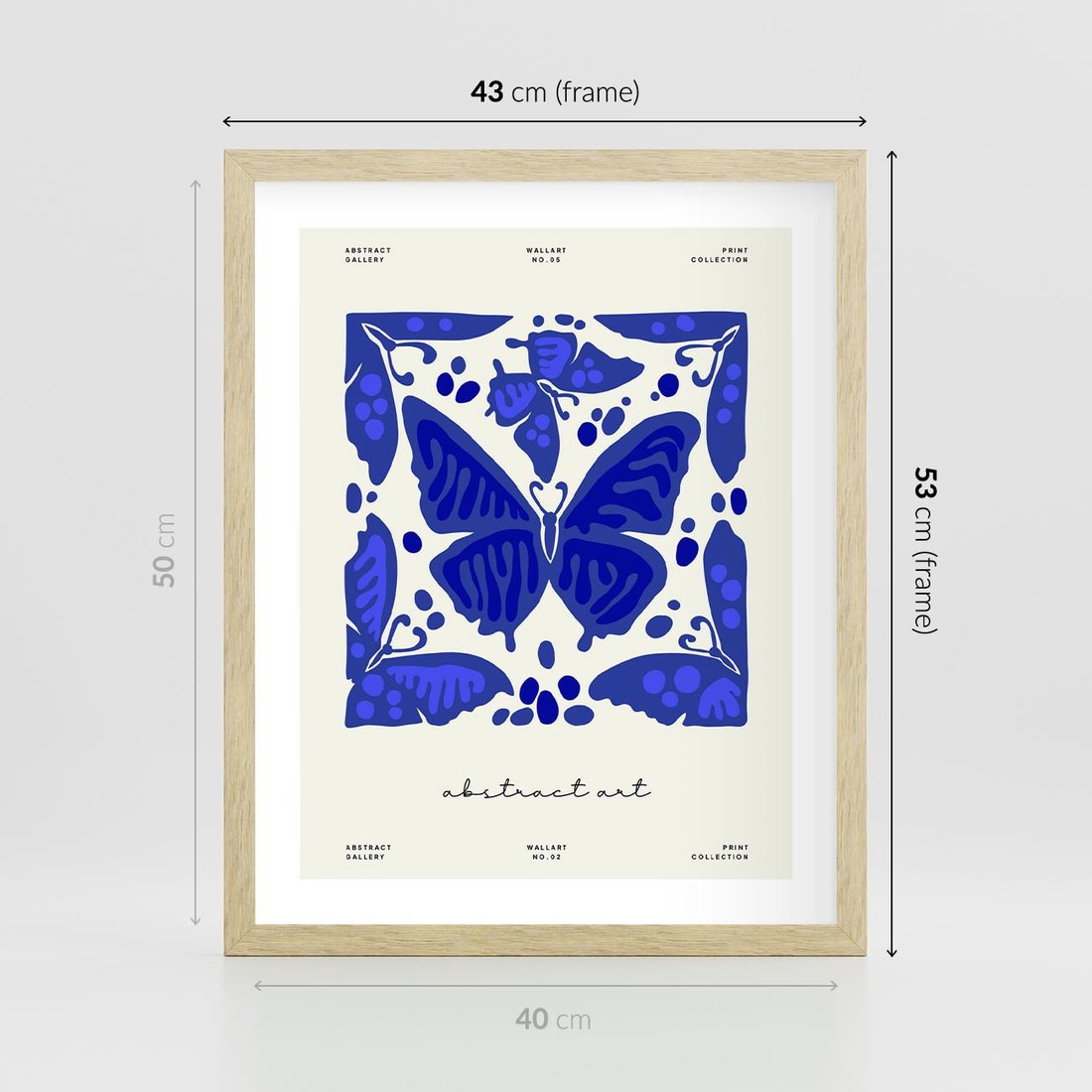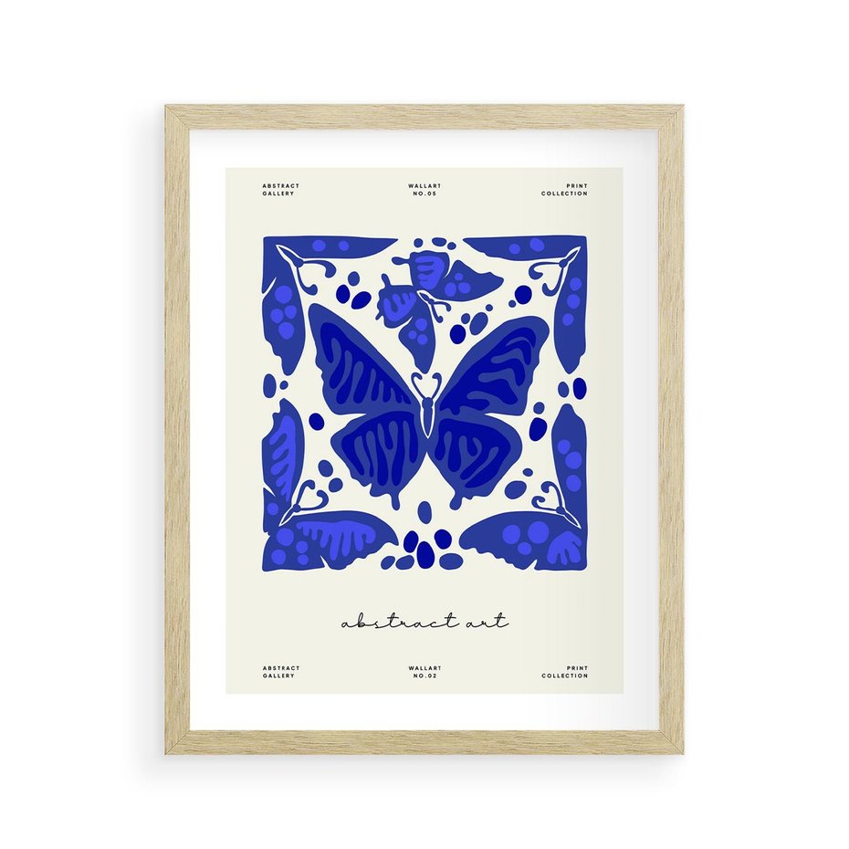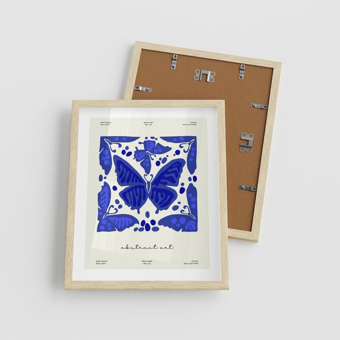 Ten nowoczesny plakat w odcieniach błękitu przedstawia abstrakcyjne motyle, tworząc hipnotyzującą kompozycję. Delikatność motywów kontrastuje z nowoczesnym stylem, tworząc unikalne wrażenie.