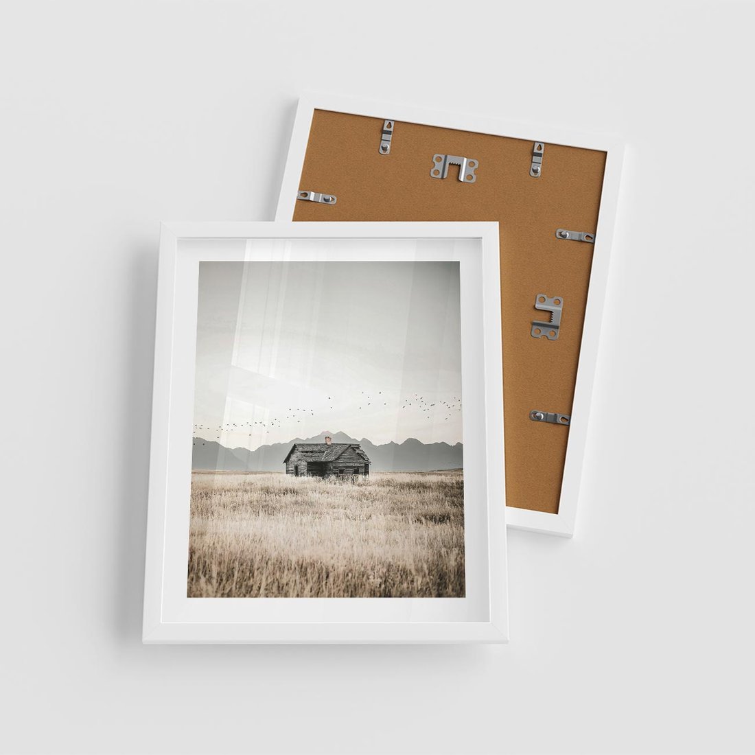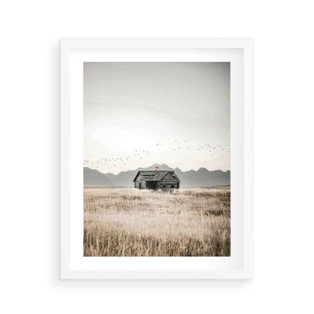 Plakat w ramie 40x50 - Wiejska Idylla - stary drewniany dom w polu suchej trawy, fotografia - rama biała