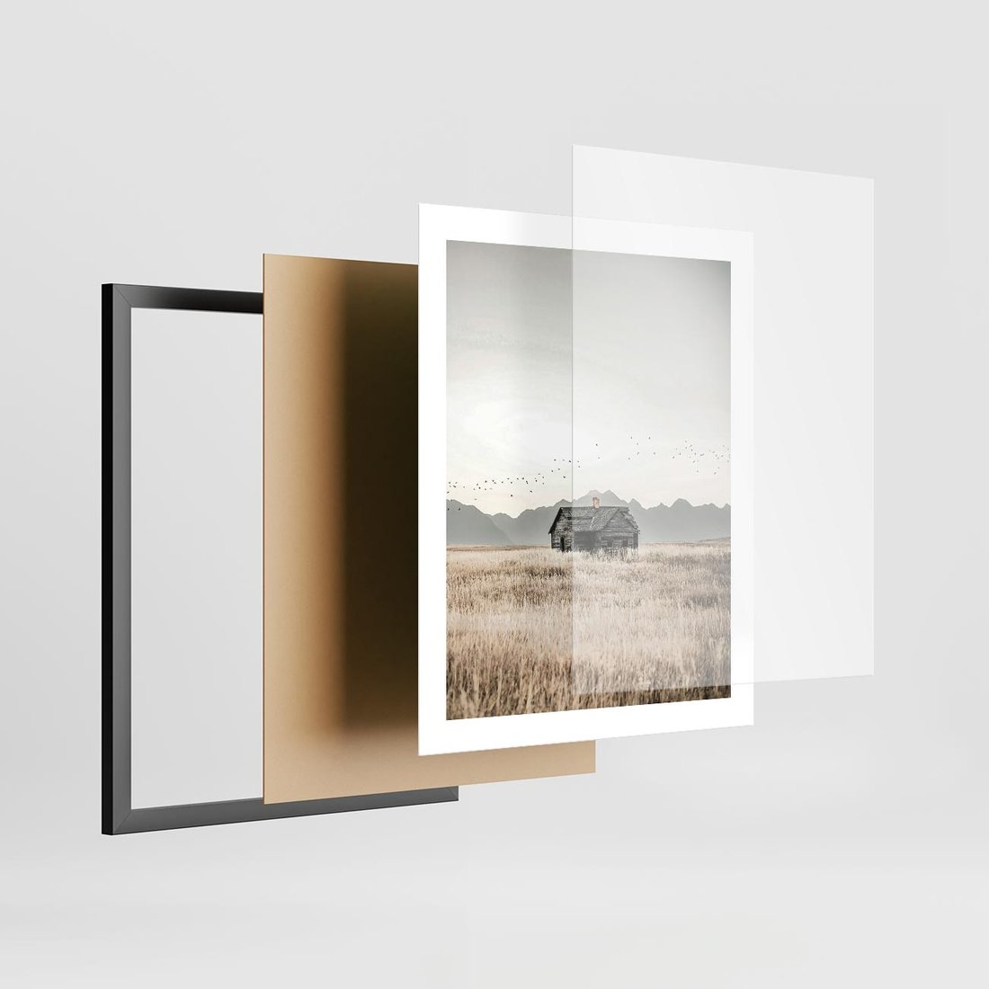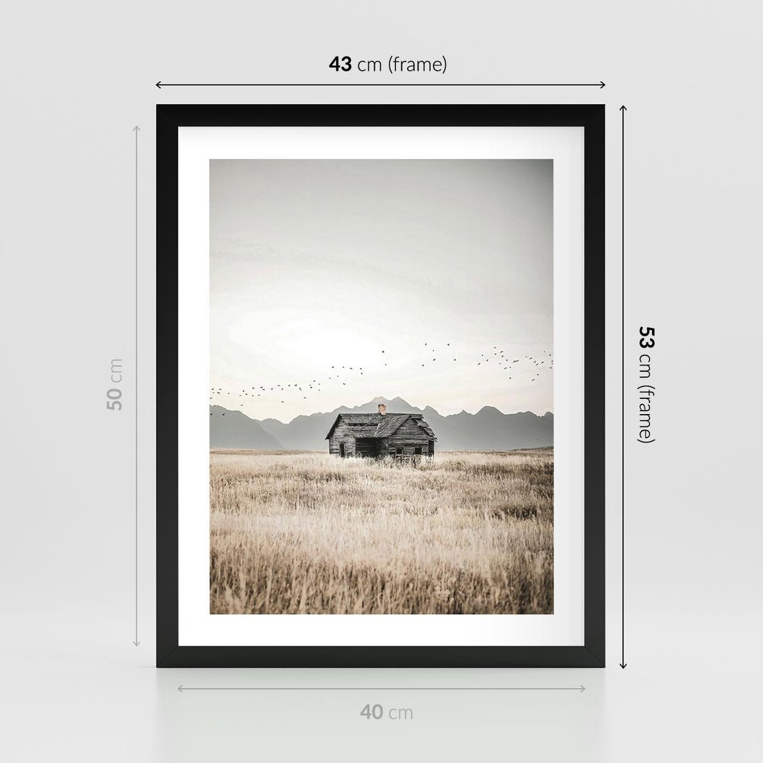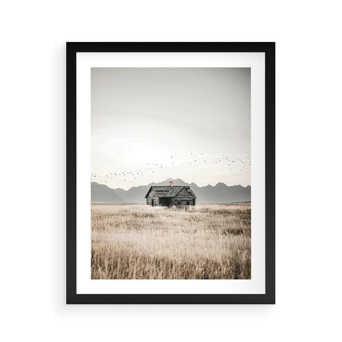 Plakat w ramie 40x50 - Wiejska Idylla - stary drewniany dom w polu suchej trawy, fotografia - rama czarna