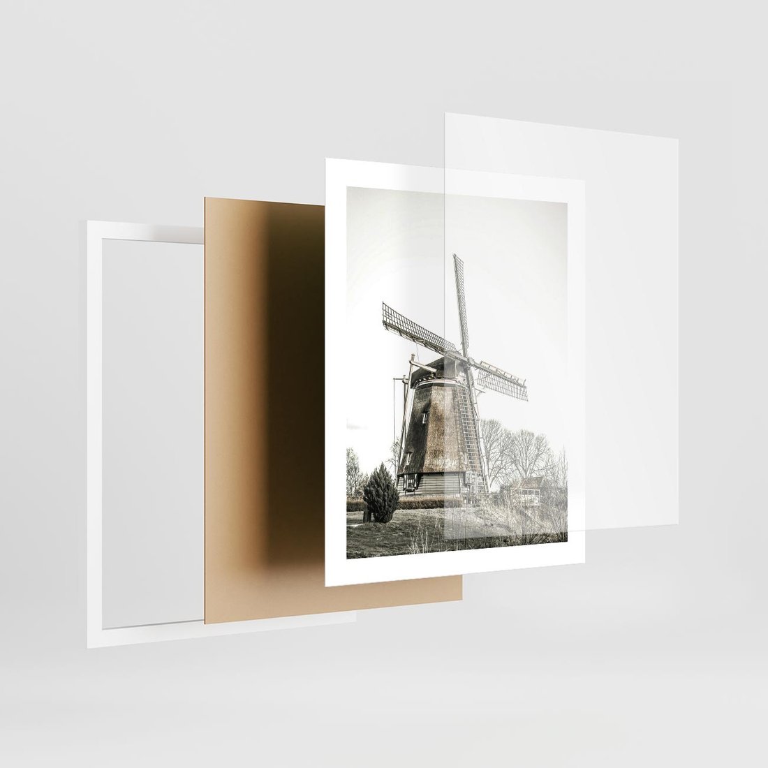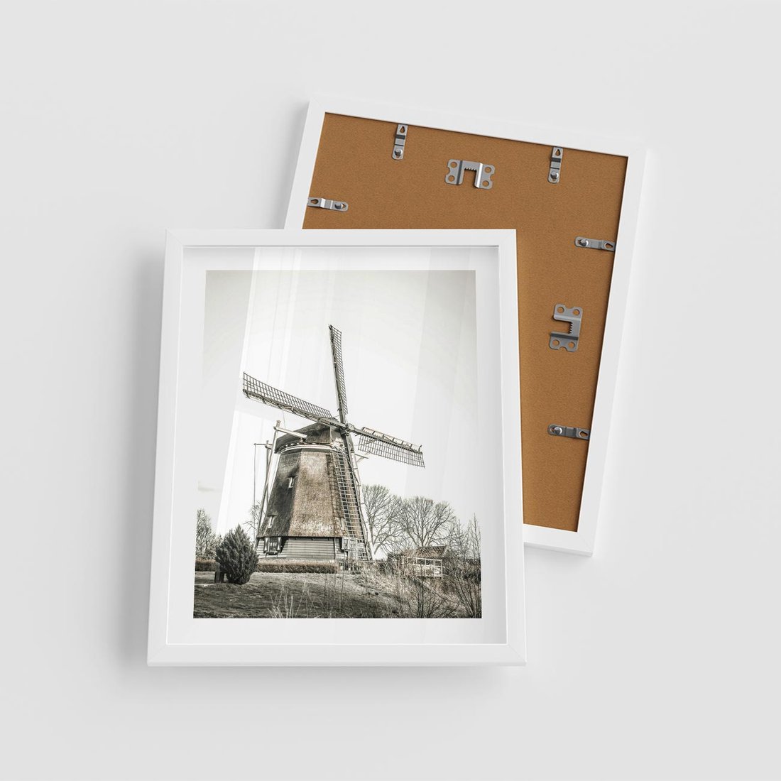 Obraz przedstawia wiejski krajobraz z wiatrakiem lub młynem w odcieniach sepii, co nadaje mu nostalgiczny i klasyczny charakter.
