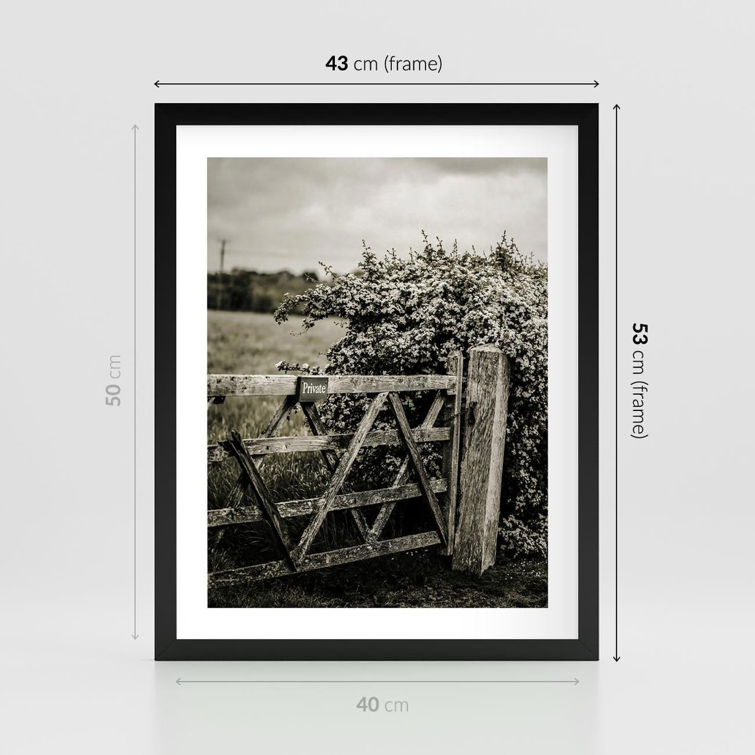 - Plakat w ramie 40x50 - Wiejski Urok: Stary Płot i Kwitnący Krzew