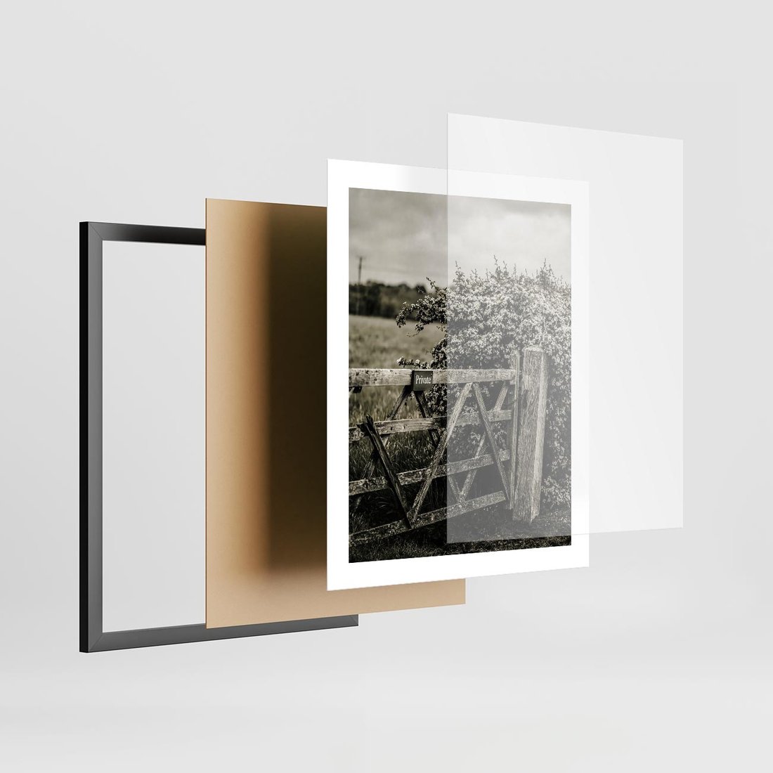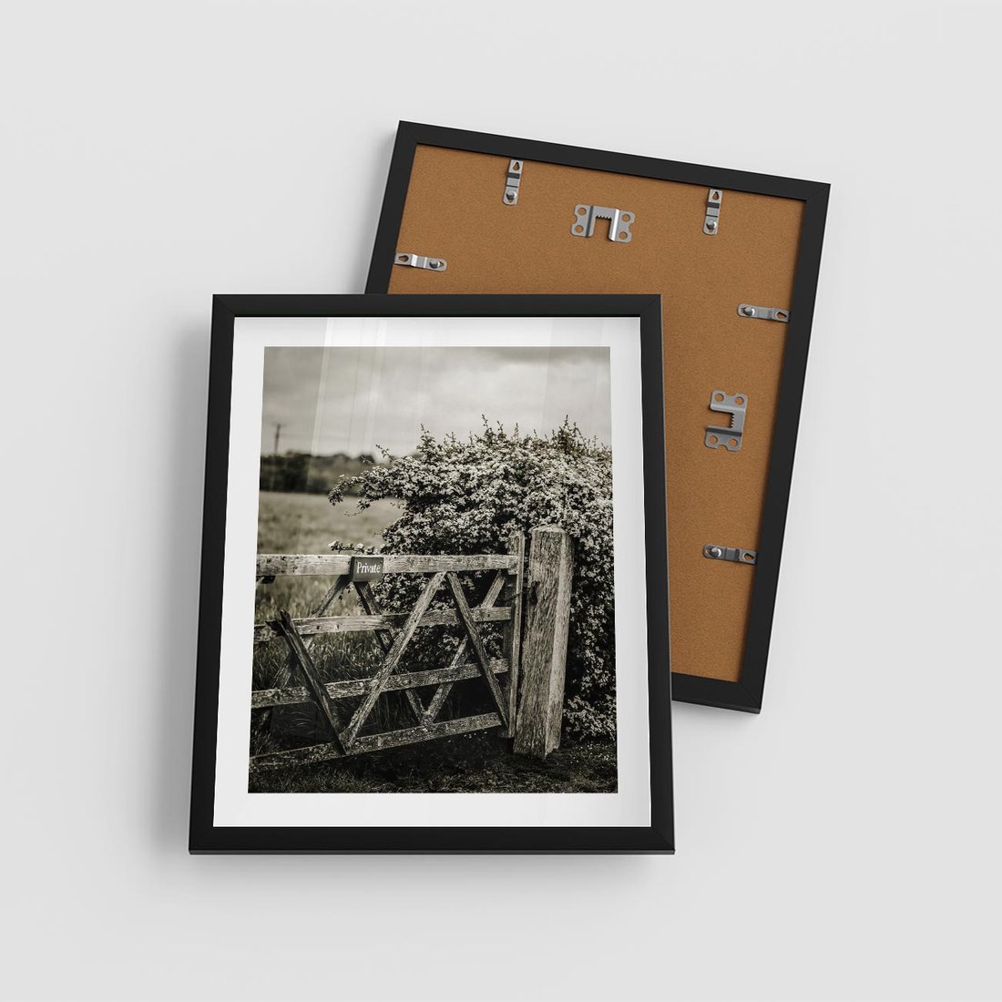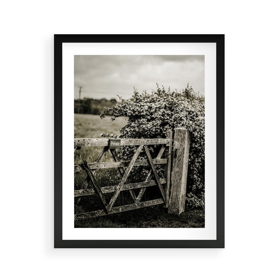 Plakat w ramie 40x50 - Wiejski Urok: Stary Płot i Kwitnący Krzew - rustykalne zdjęcie, stary płot - rama czarna