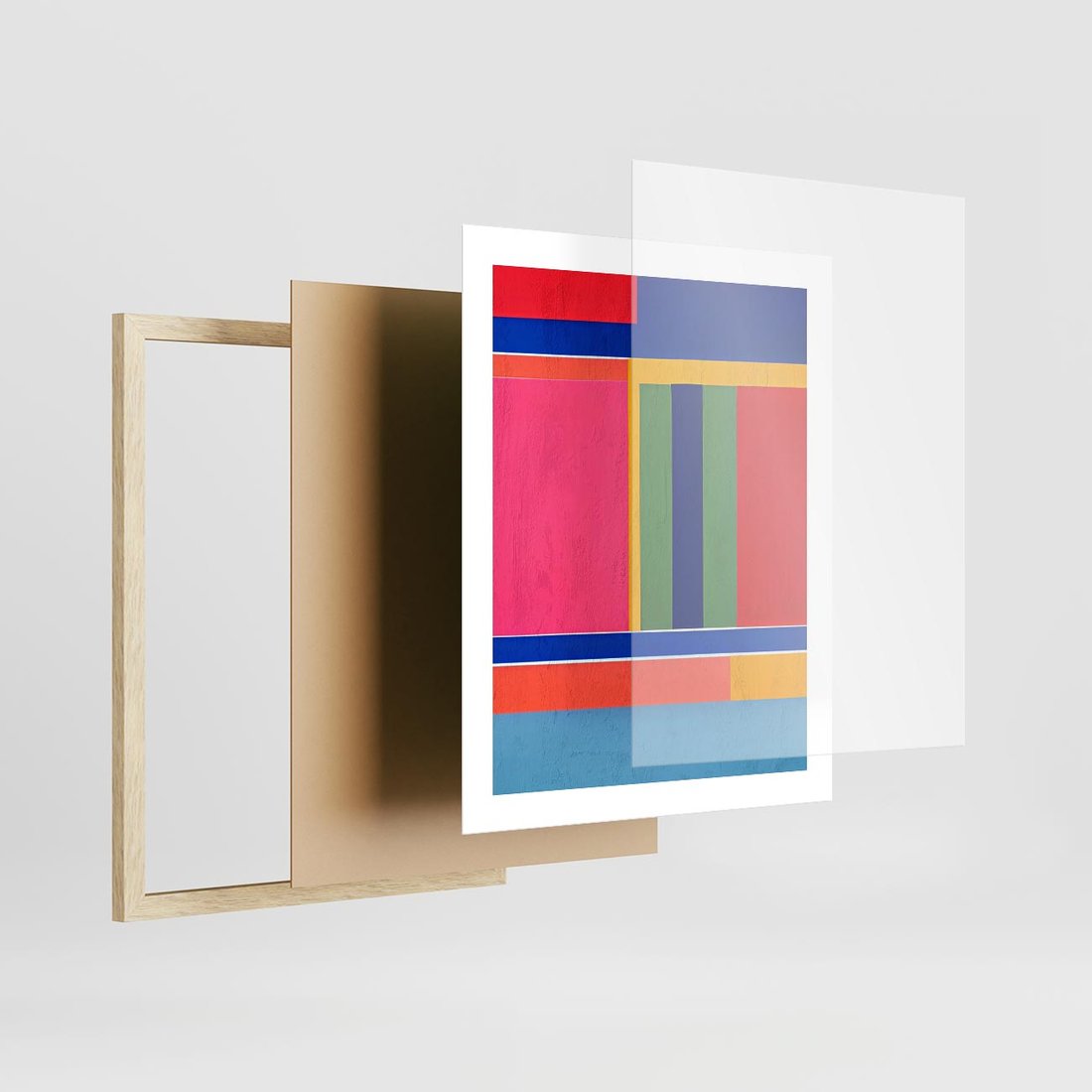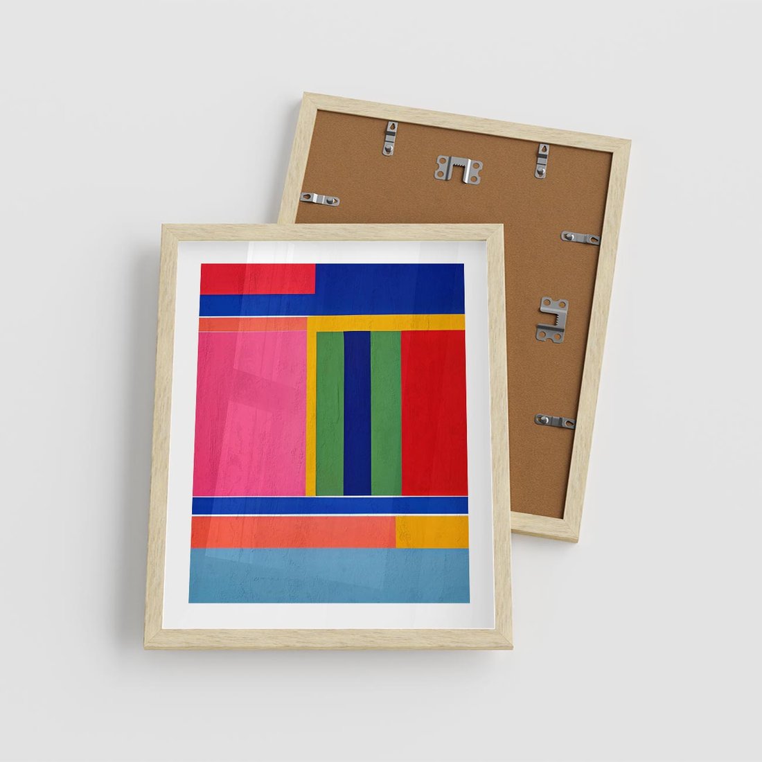 Plakat w ramie 40x50 - Wnętrza Rozplątanych Barw - abstrakcyjny geometryczny obraz olejny, kolorowe pasy - rama drewno