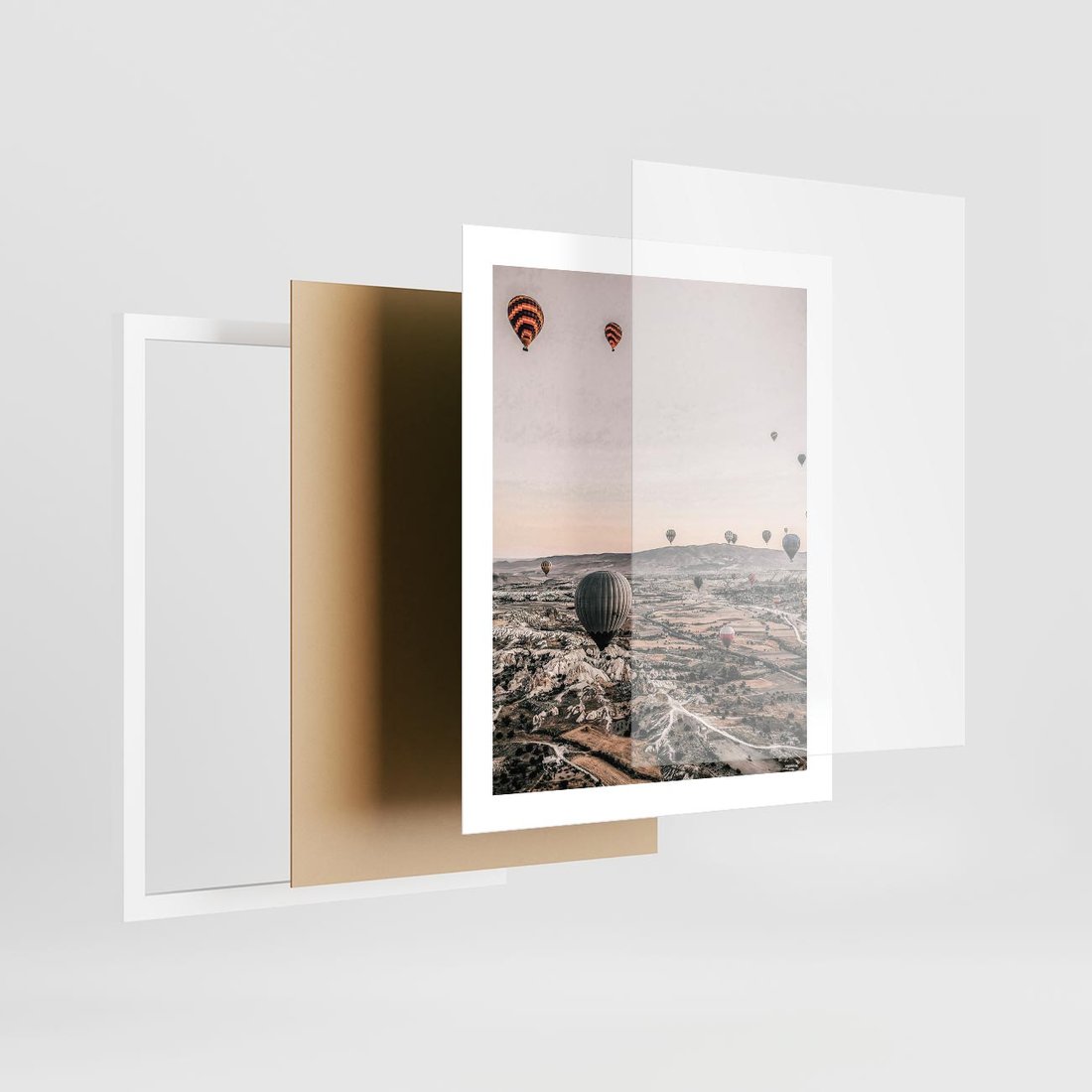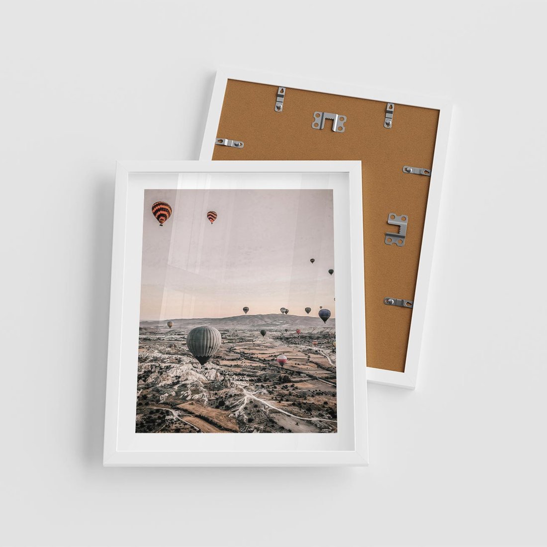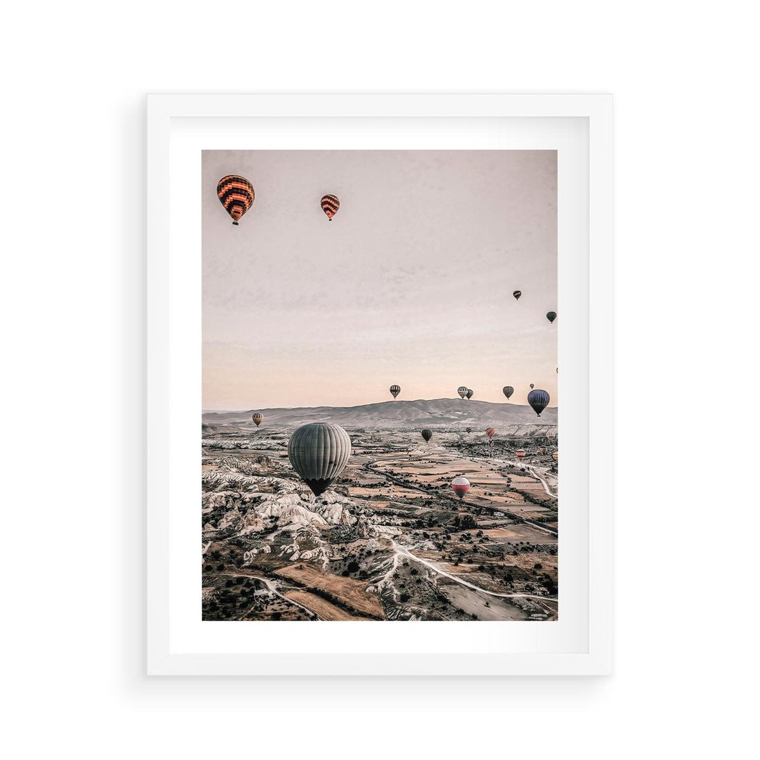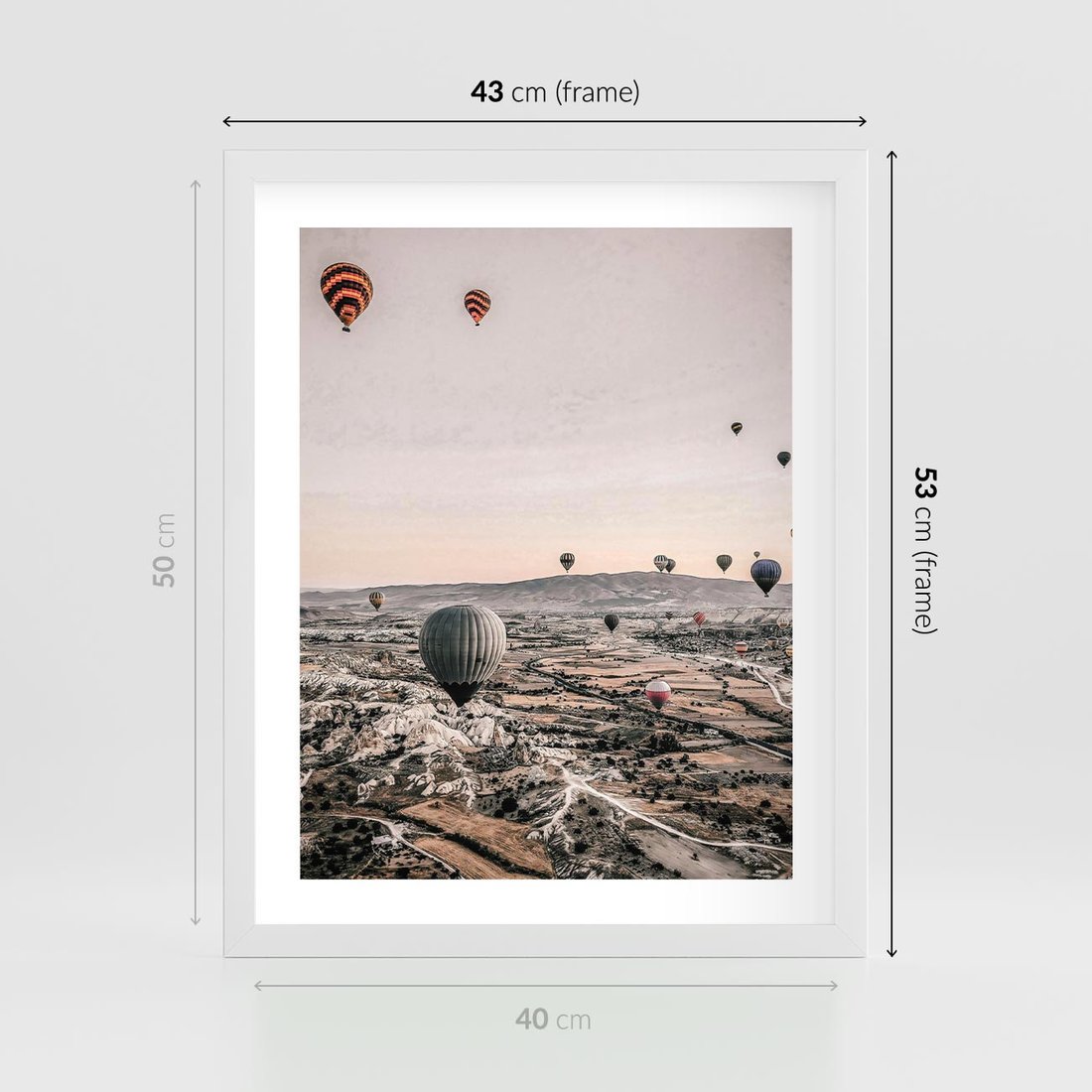 Plakat w ramie 40x50 - Wolność w Powietrzu - balony latające nas pustynnym krajbrazem, balony do latania - rama biała
