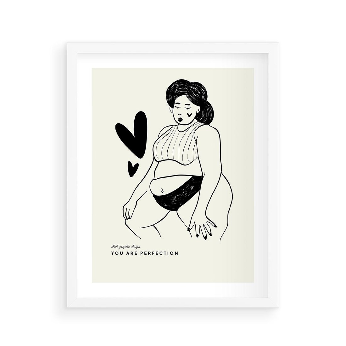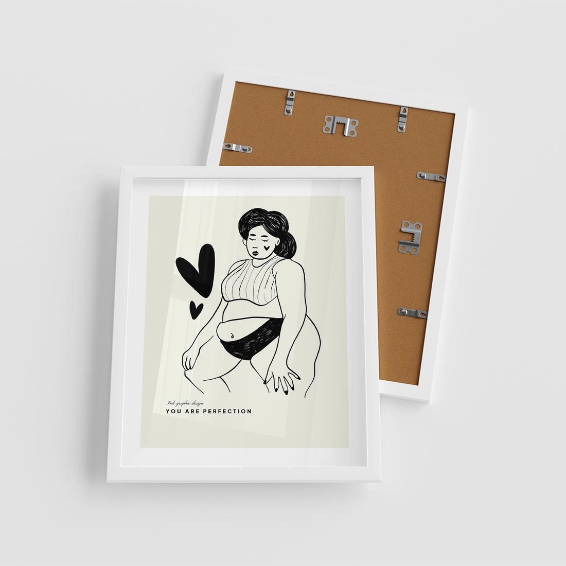 Ta sztuka rysunkowa ukazuje piękno kobiecej sylwetki w bieliźnie. Wzbogacona wyrazistą typografią, przypomina o sile wyrażania indywidualnego piękna i pewności siebie.