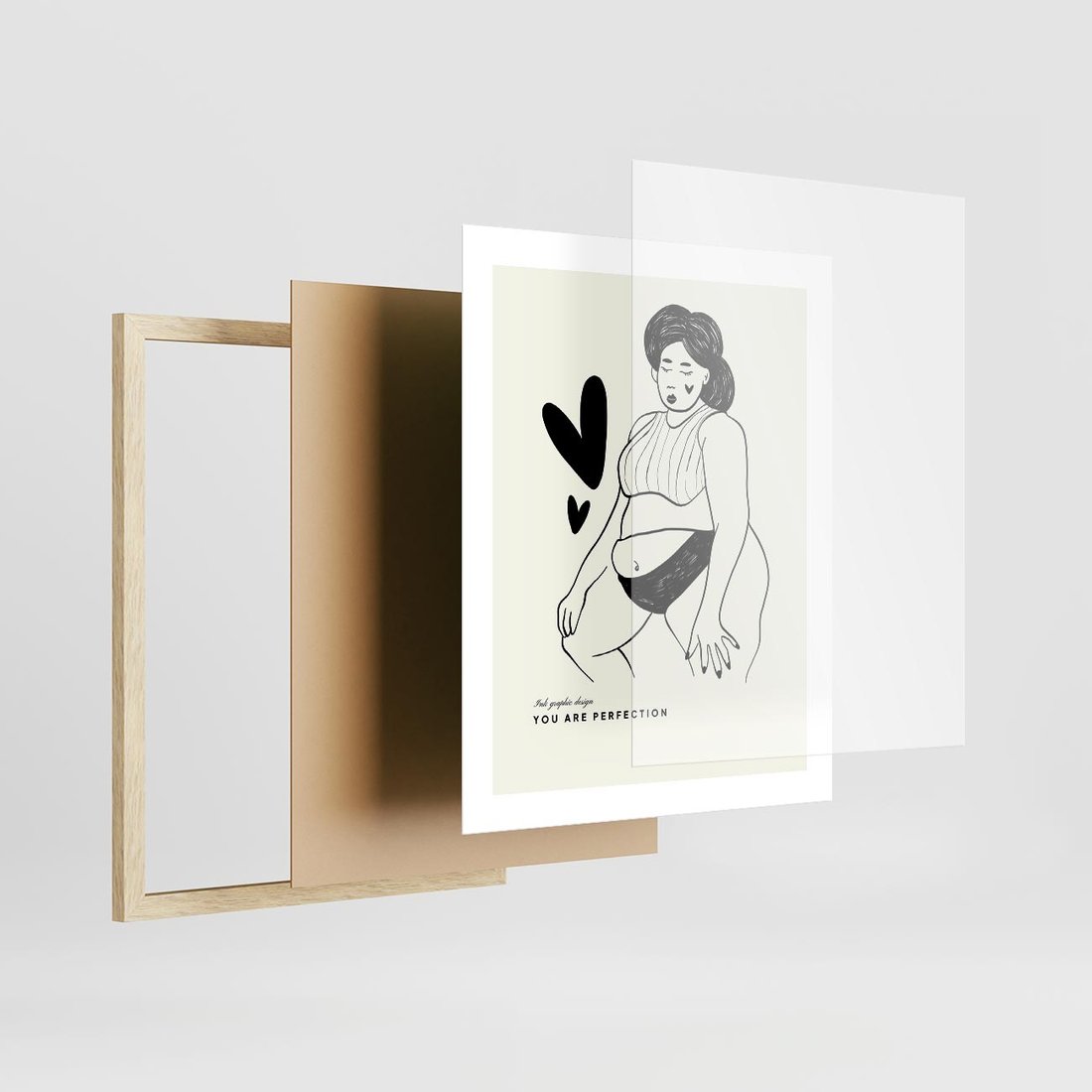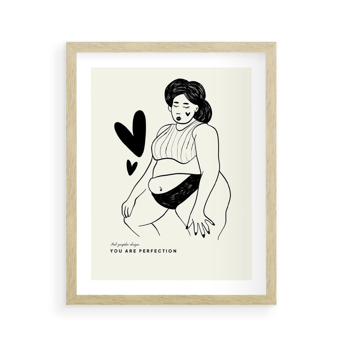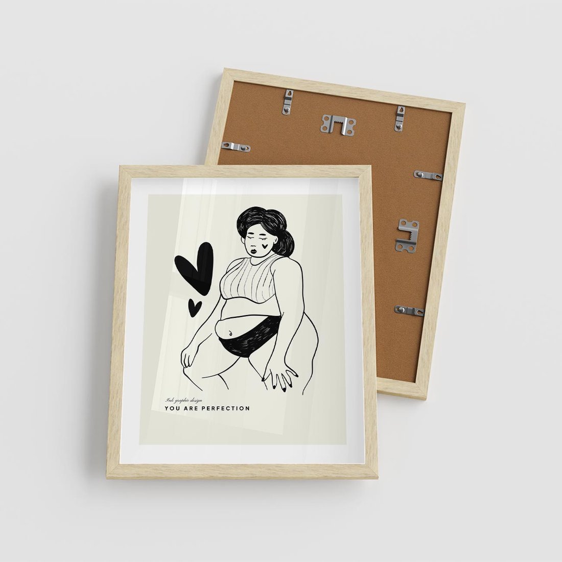 Ta sztuka rysunkowa ukazuje piękno kobiecej sylwetki w bieliźnie. Wzbogacona wyrazistą typografią, przypomina o sile wyrażania indywidualnego piękna i pewności siebie.