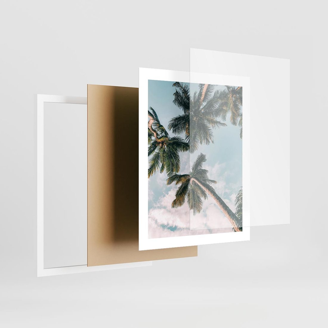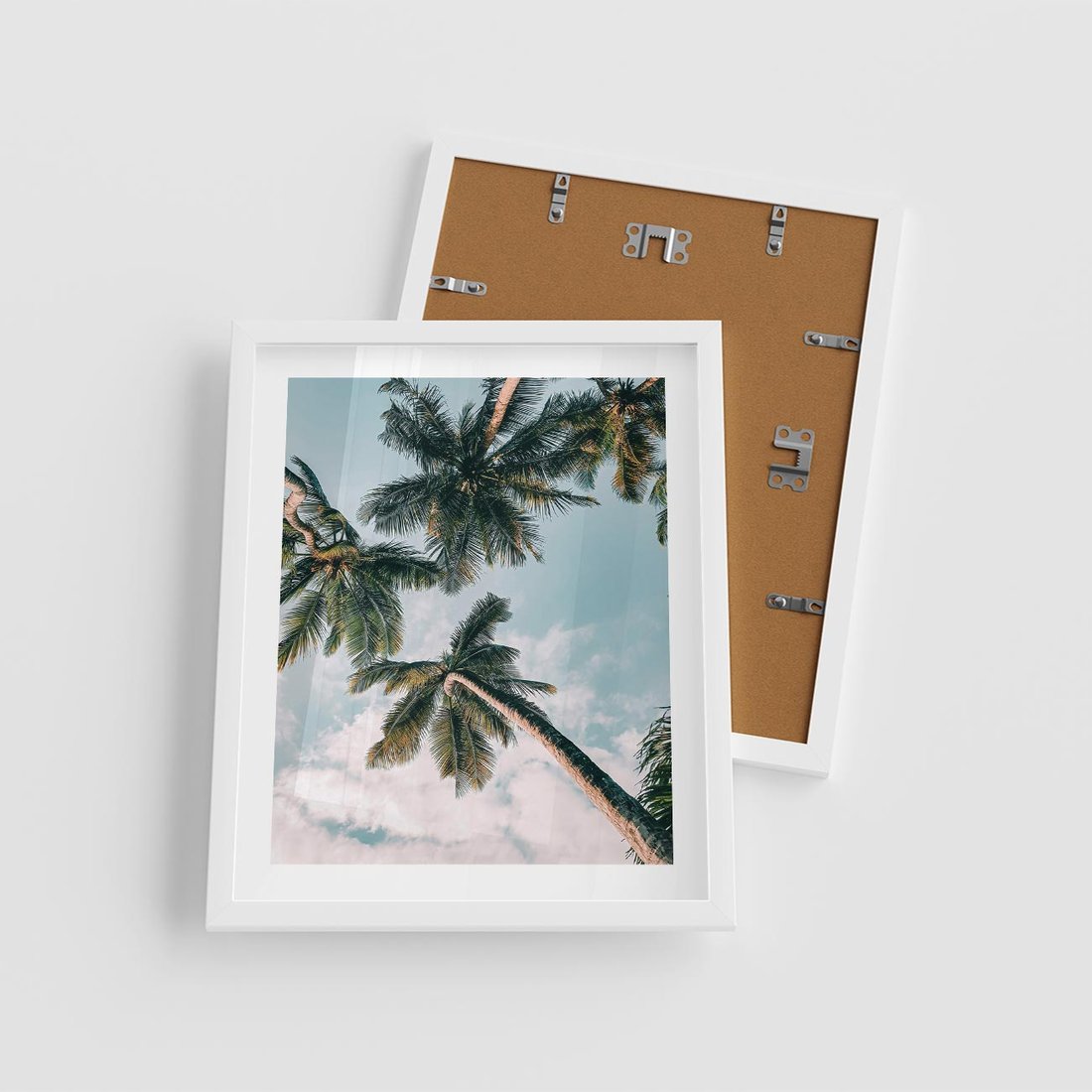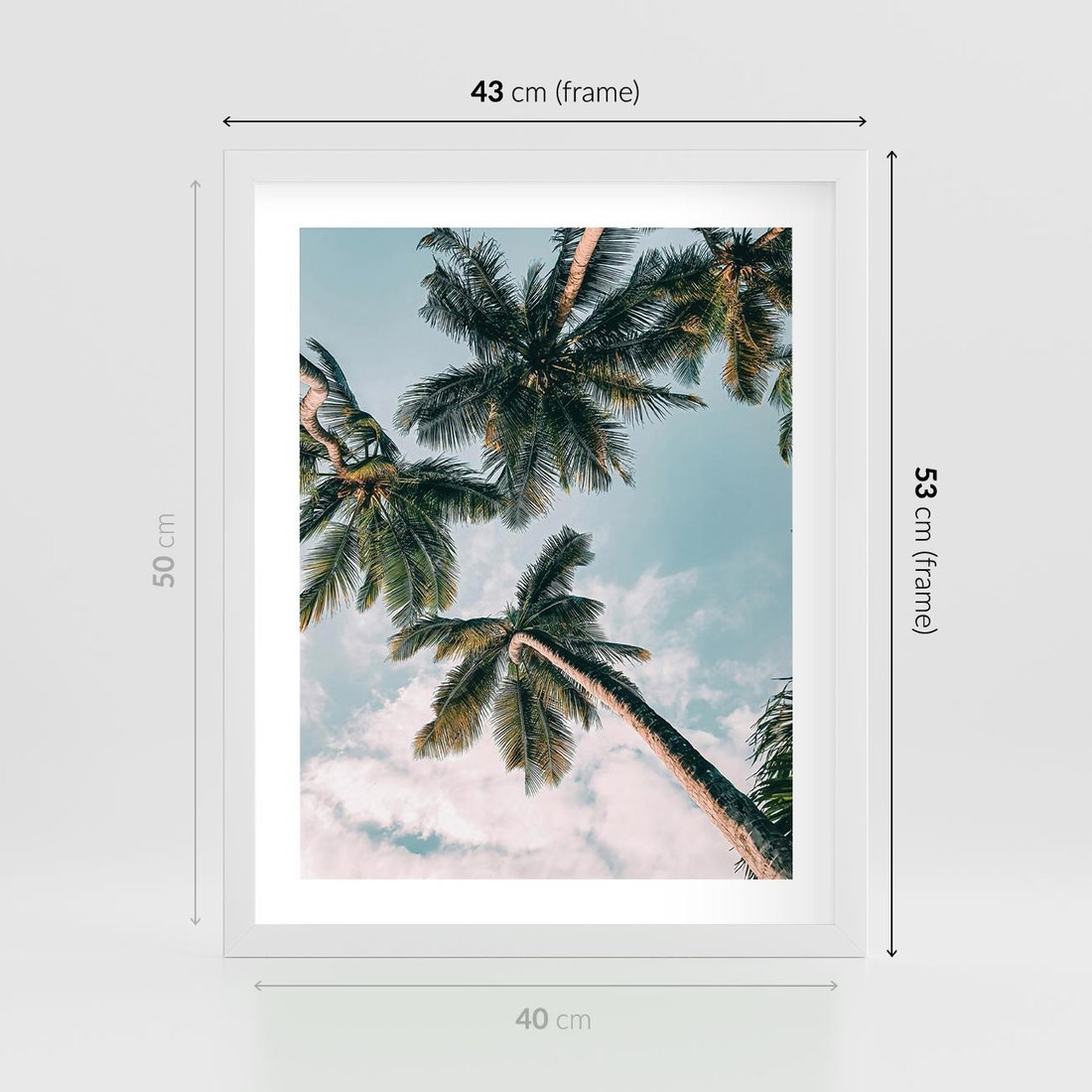 Plakat w ramie 40x50 - Wzrok ku Niebu - palmy na tle nieba, ujęcie z dołu - rama biała