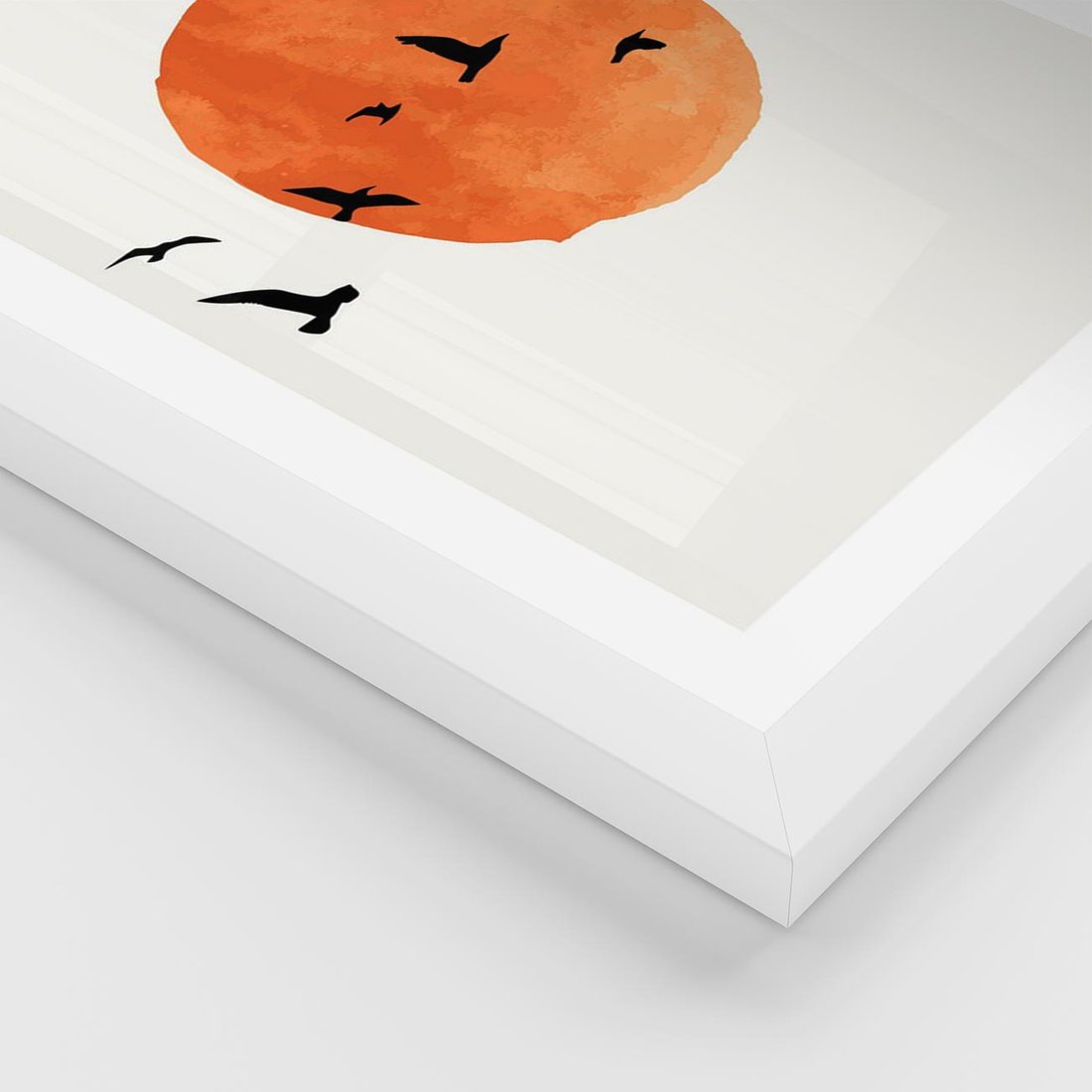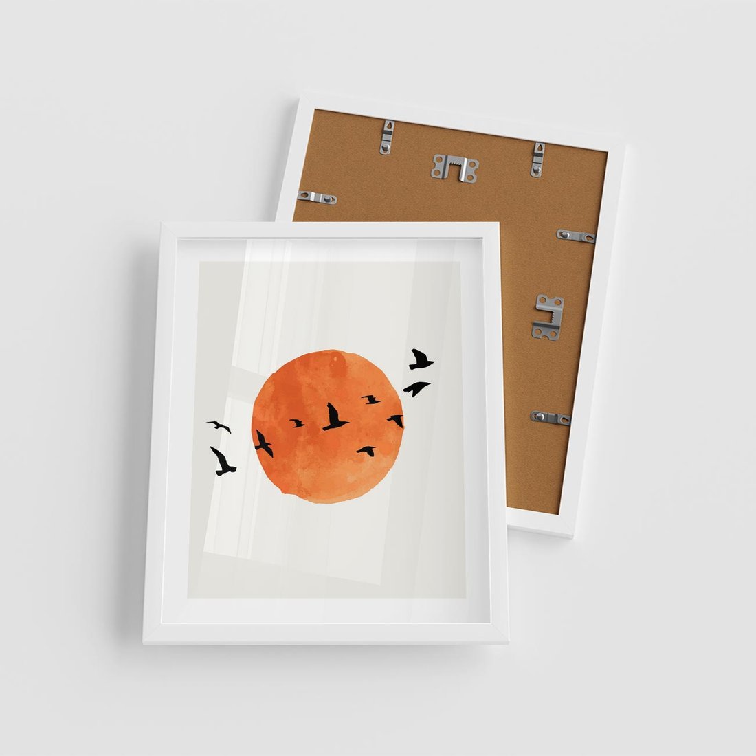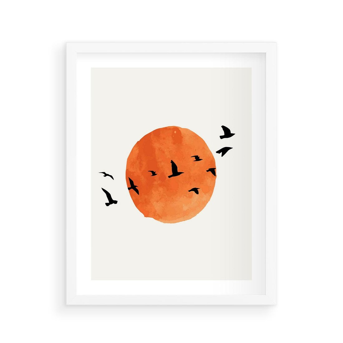 Plakat w ramie 40x50 - Zachód Słońca i Ptaki - grafika akwarela, czarne ptaki na tle zachodu słońca - rama biała