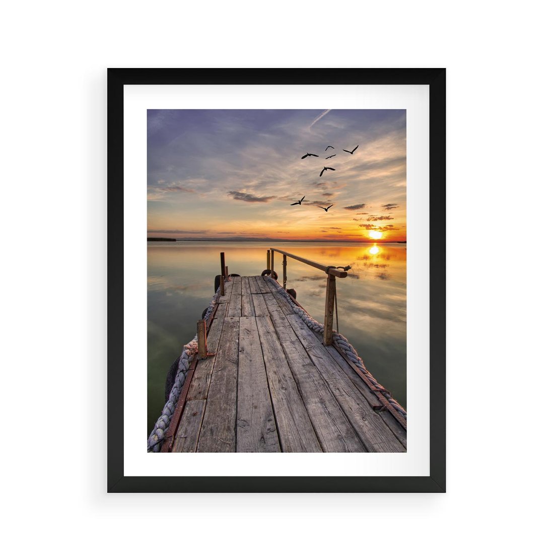 Obejrzyj spektakularny zachód słońca na malowniczym pomostcie dzięki temu urokliwemu obrazowi. Kolorowe niebo, odbicia w wodzie i romantyczna atmosfera tworzą aurę magicznego momentu i spokoju. Ta kompozycja dodaje piękna i chwili zadumy, idealna dla miłośników zachodów słońca i nadmorskich krajobrazów.