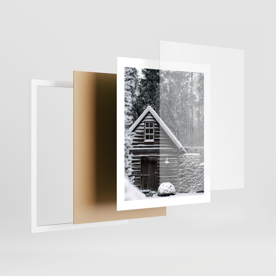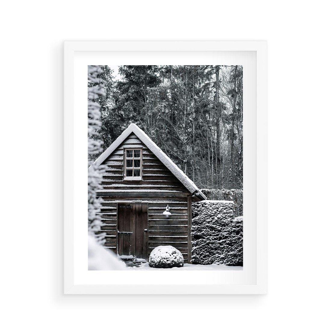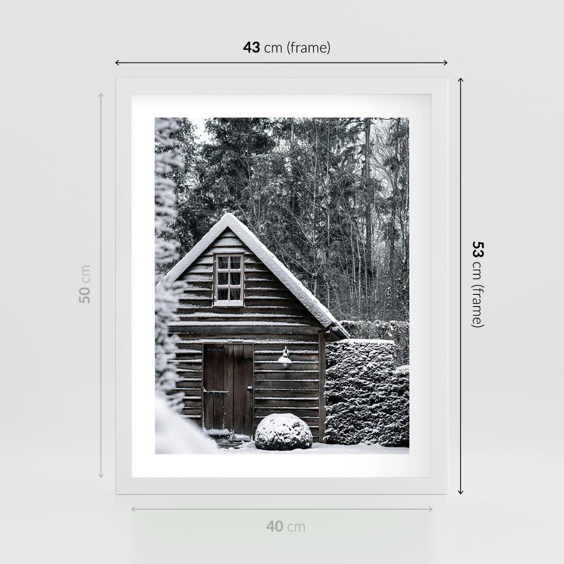 Plakat w ramie 40x50 - Zaklęta Zima - domek w lesie, śnieg - rama biała