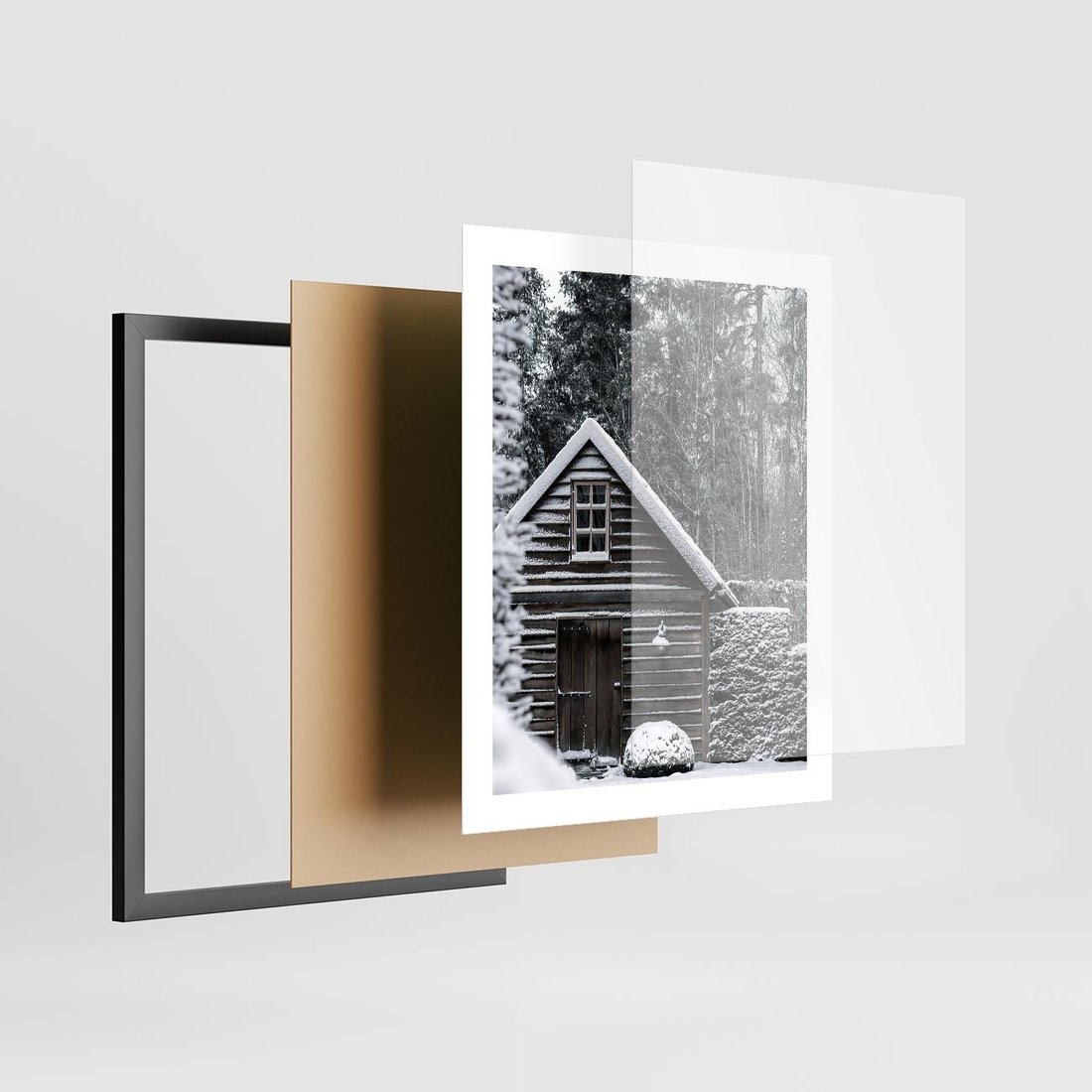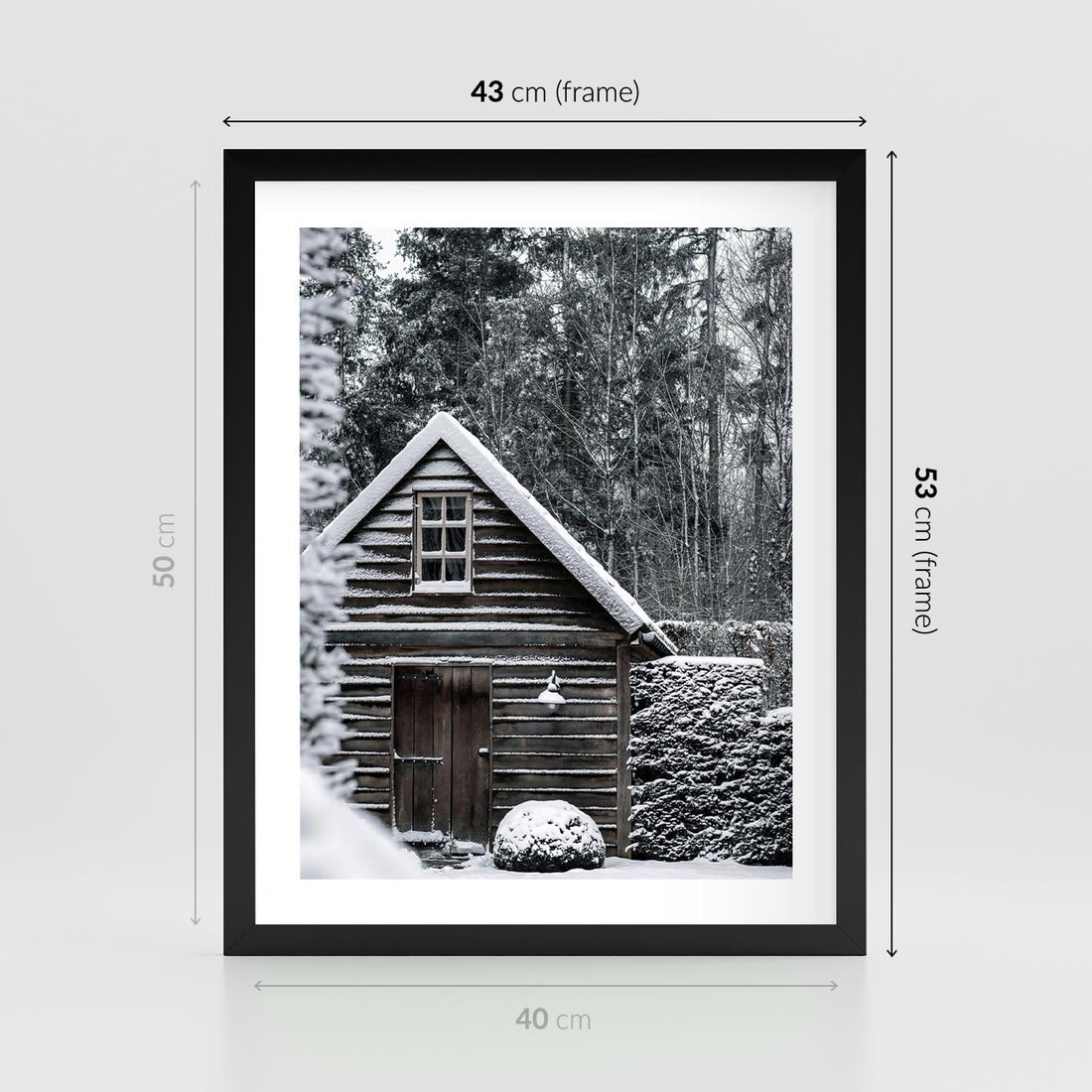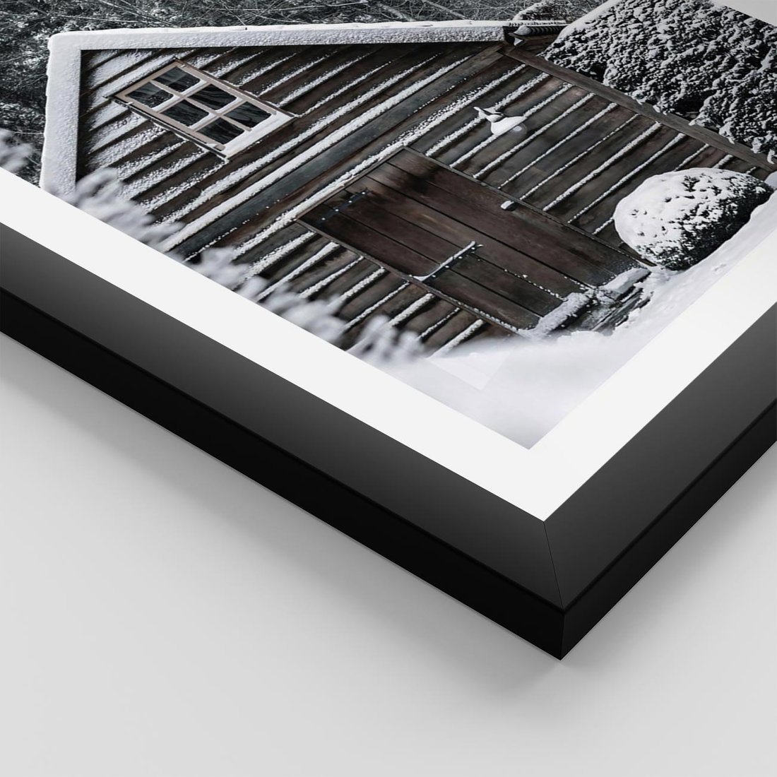 Plakat w ramie 40x50 - Zaklęta Zima - domek w lesie, śnieg - rama czarna