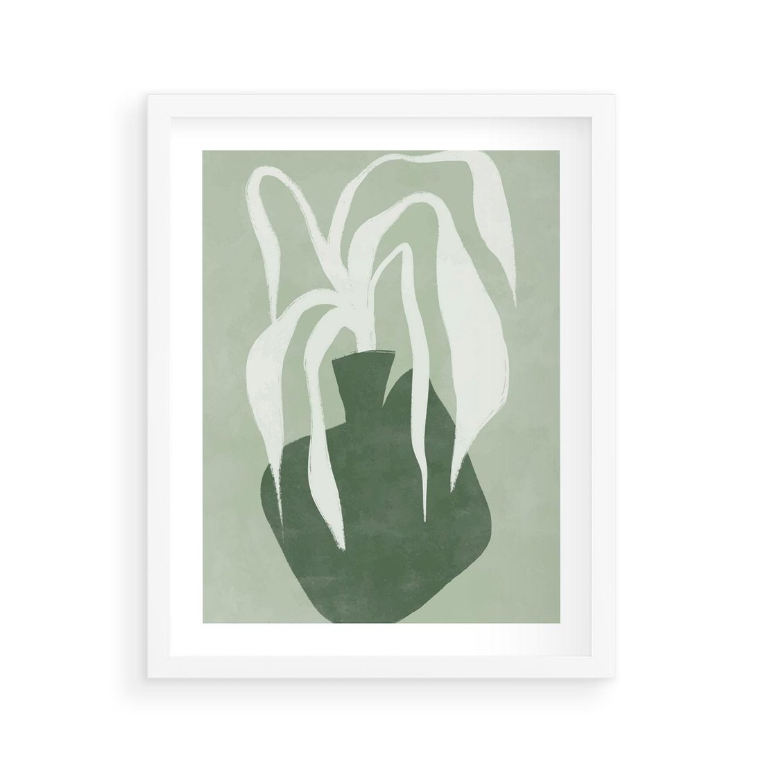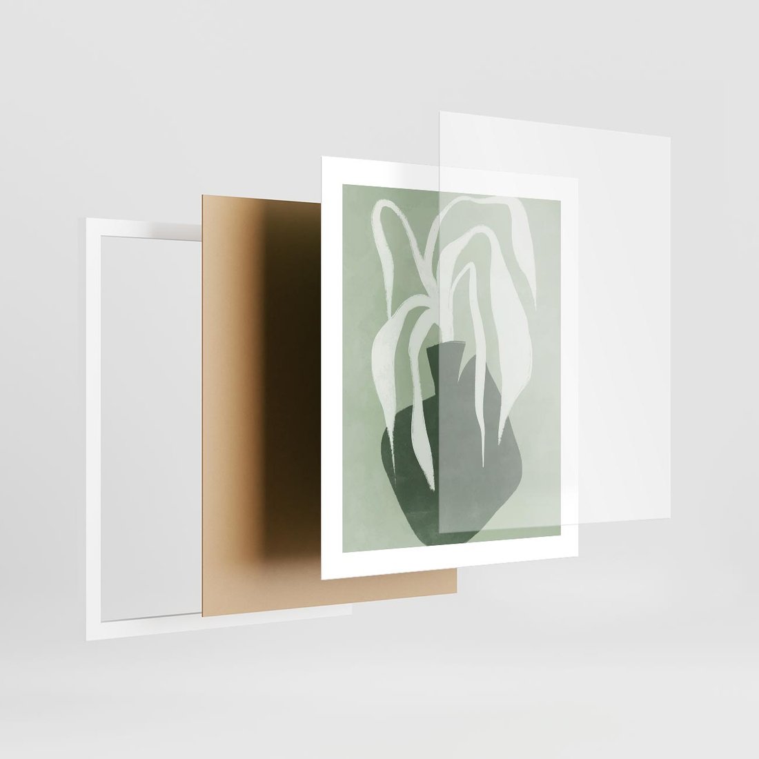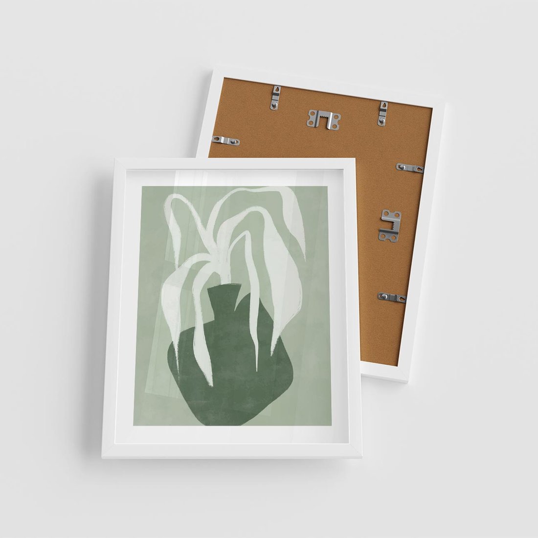Zielona abstrakcja o zgaszonych odcieniach zieleni to minimalistyczny plakat idealny do wnętrz w stylu skandynawskim. Kwiat w doniczce dodaje subtelności i harmonii, tworząc spokojną i przyjemną atmosferę.