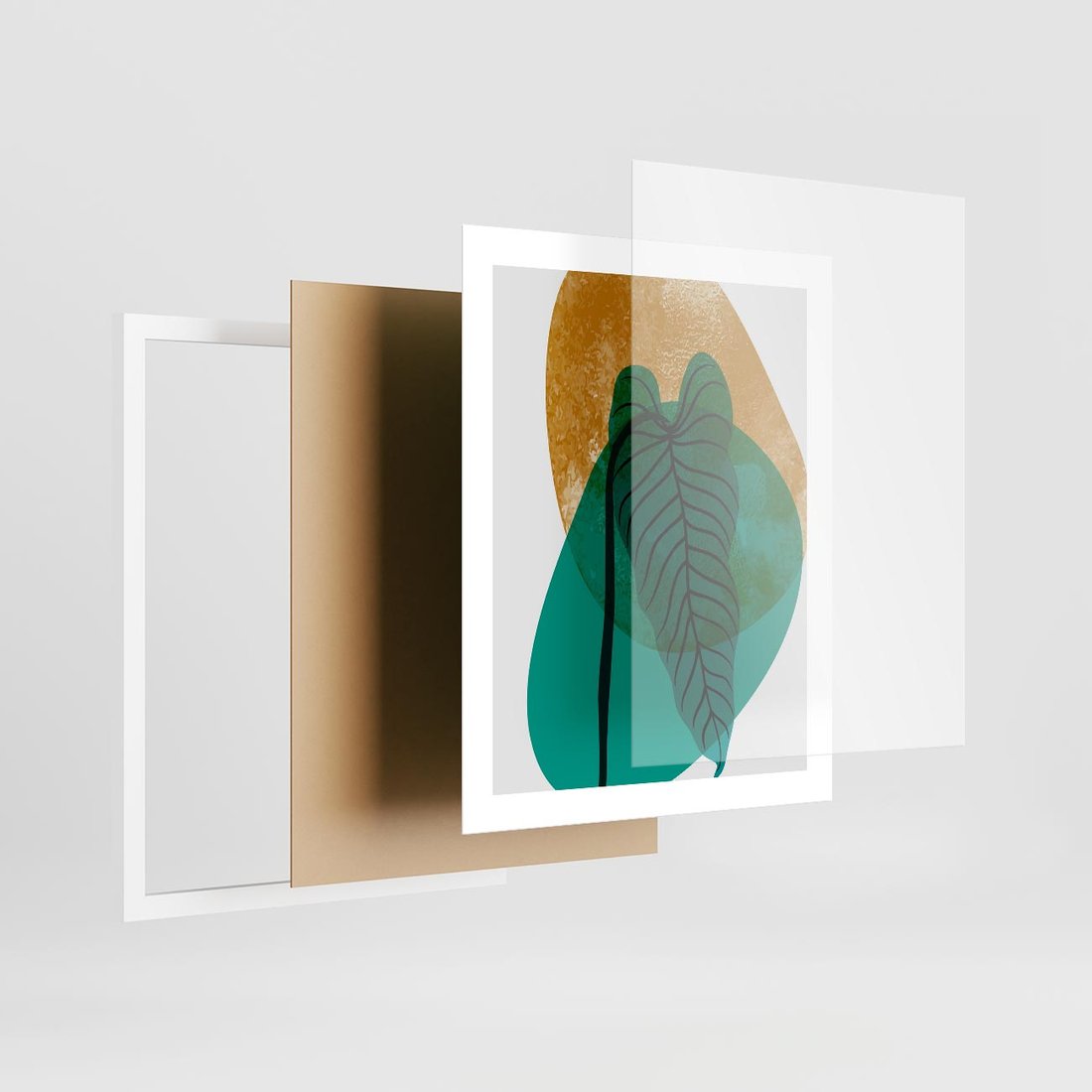 Obraz przedstawia grafikę z zielonym liściem i złotą plamą, tworząc elegancką i harmonijną kompozycję.