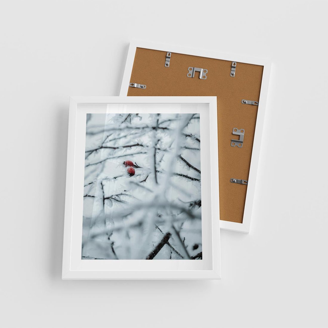 Plakat w ramie 40x50 - Zima w Detalu: Gałęzie ze Szronem i Śniegiem - śnieg, zima - rama biała
