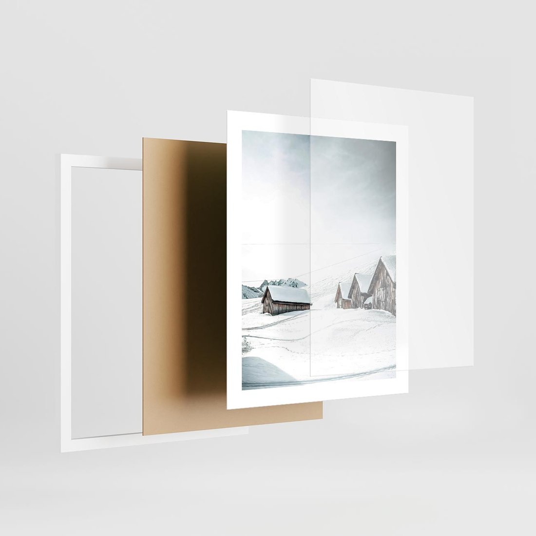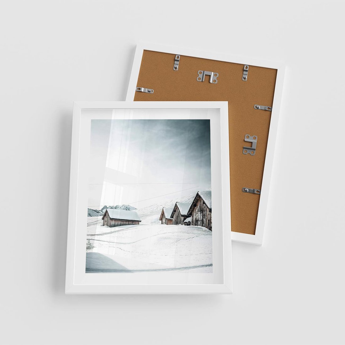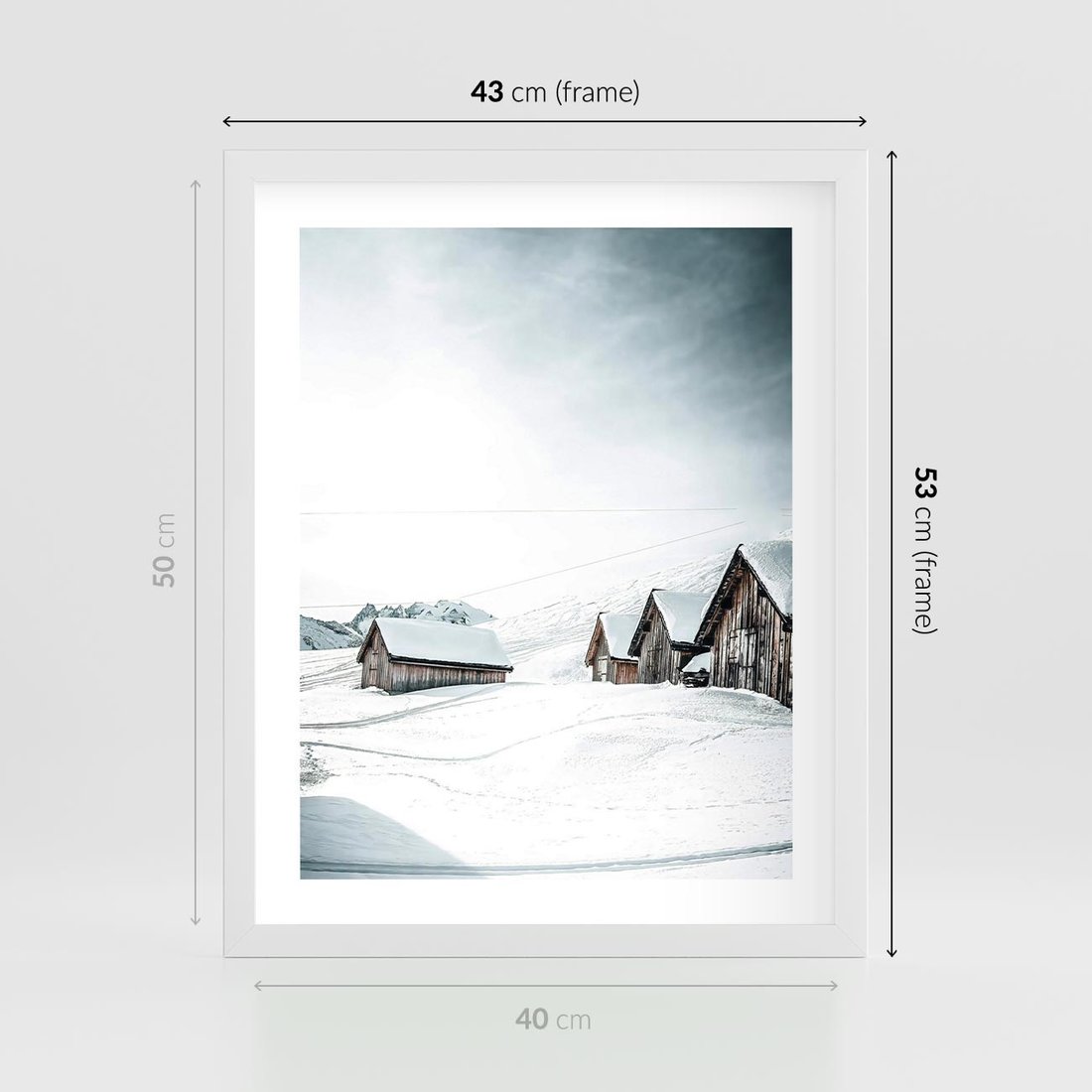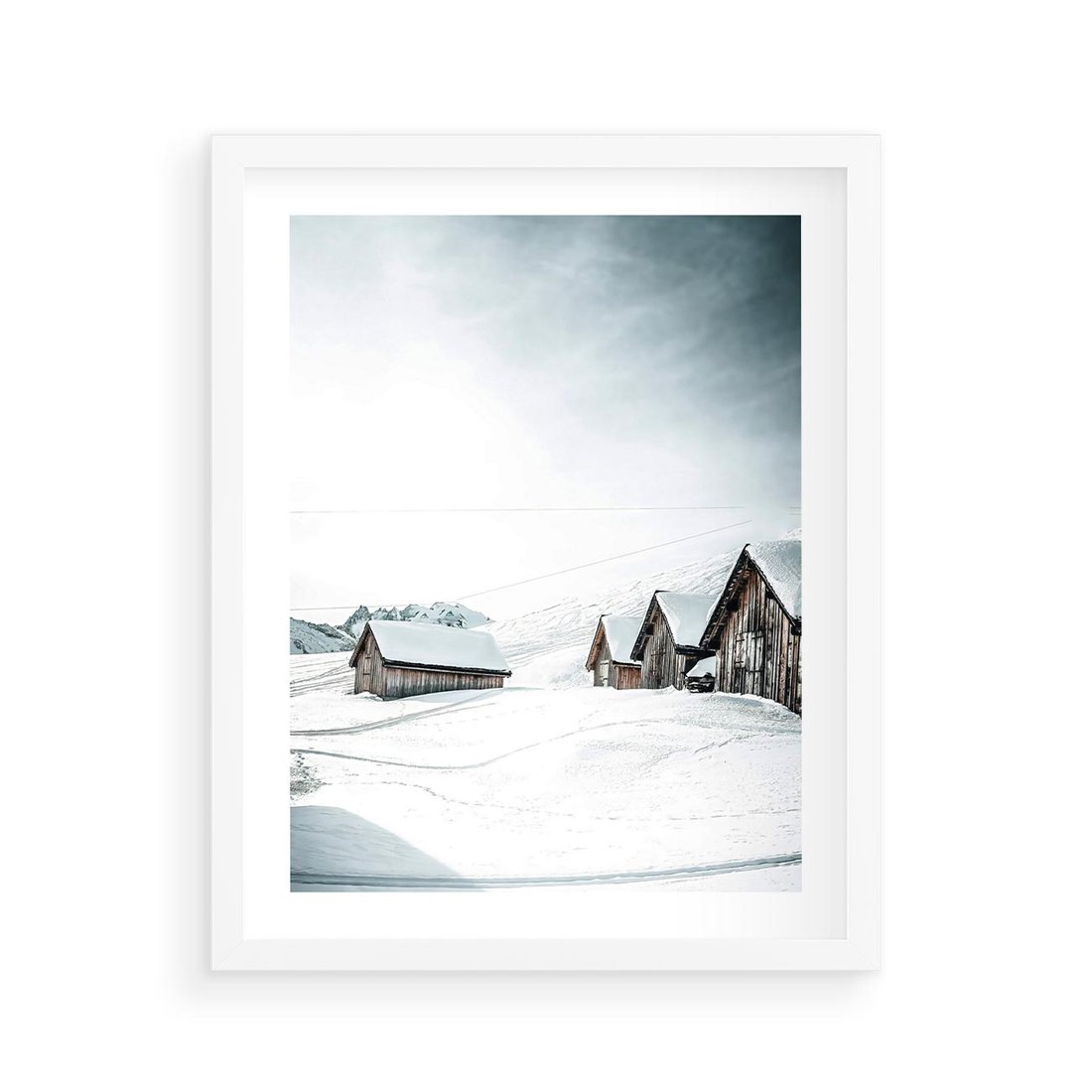Plakat w ramie 40x50 - Zima w Domkach: Urok Śnieżnej Scenerii - domki w śnieżnym krajobrazie - rama biała