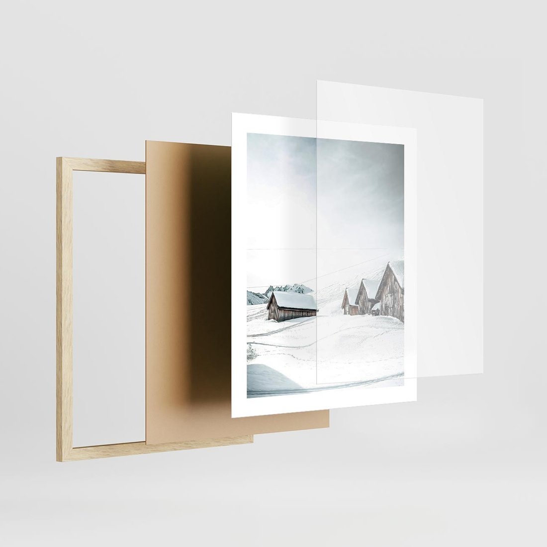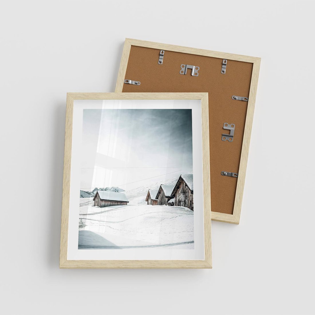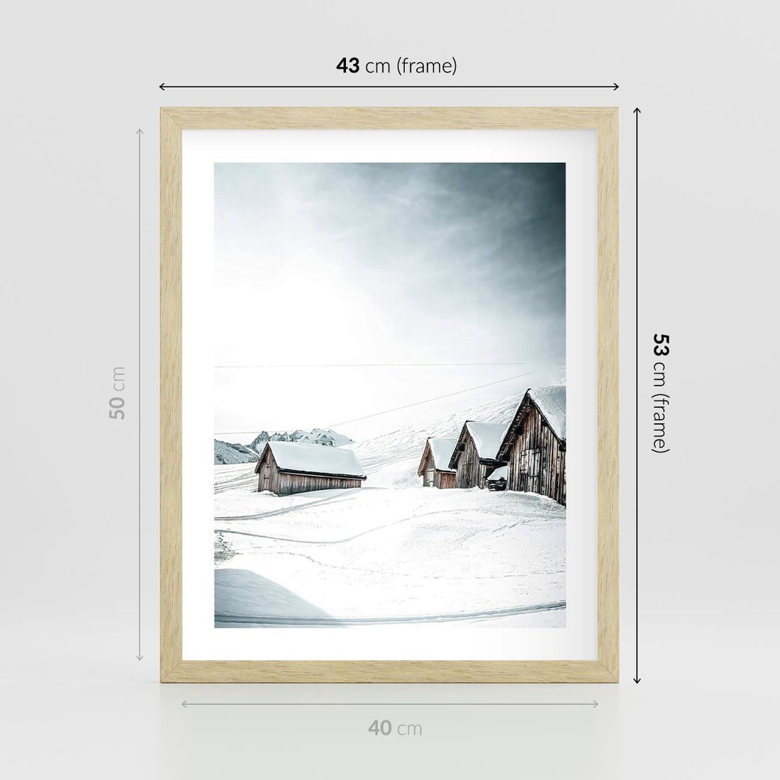 Plakat w ramie 40x50 - Zima w Domkach: Urok Śnieżnej Scenerii - domki w śnieżnym krajobrazie - rama drewno