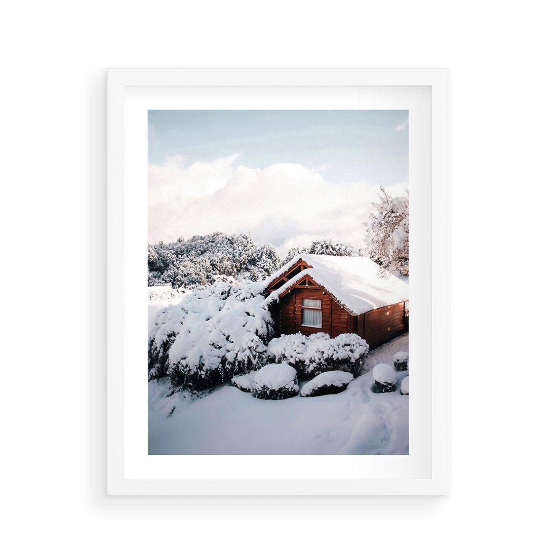 Obraz przedstawia zimowy pejzaż górski z ośnieżonymi szczytami i uroczą chatką w górach. Ta malownicza kompozycja doskonale pasuje do wnętrz, które pragną wprowadzić atmosferę zimowej scenerii i przytulności.