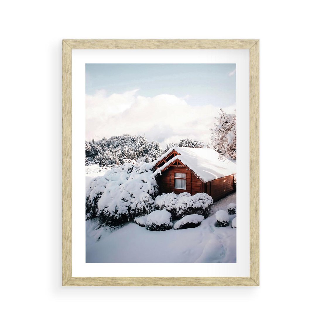 Obraz przedstawia zimowy pejzaż górski z ośnieżonymi szczytami i uroczą chatką w górach. Ta malownicza kompozycja doskonale pasuje do wnętrz, które pragną wprowadzić atmosferę zimowej scenerii i przytulności.