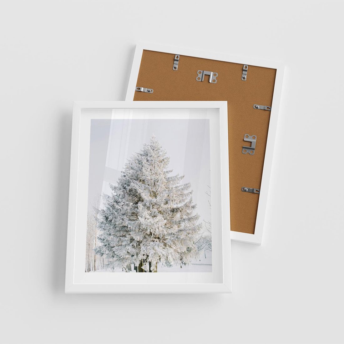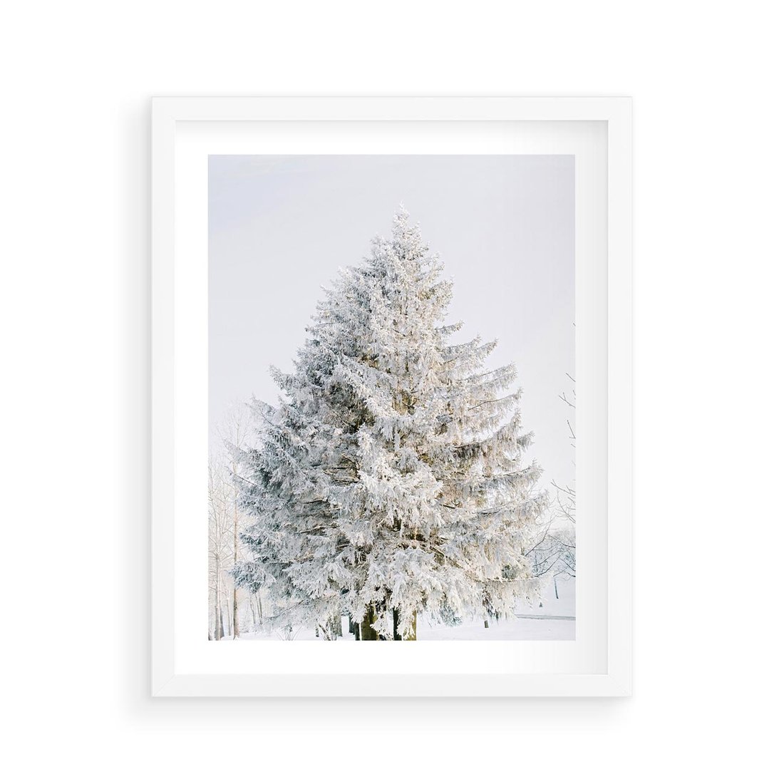 Plakat w ramie 40x50 - Zimowa Poezja w Ośnieżonym Drzewie - ośnieżone drzewo, zima - rama biała