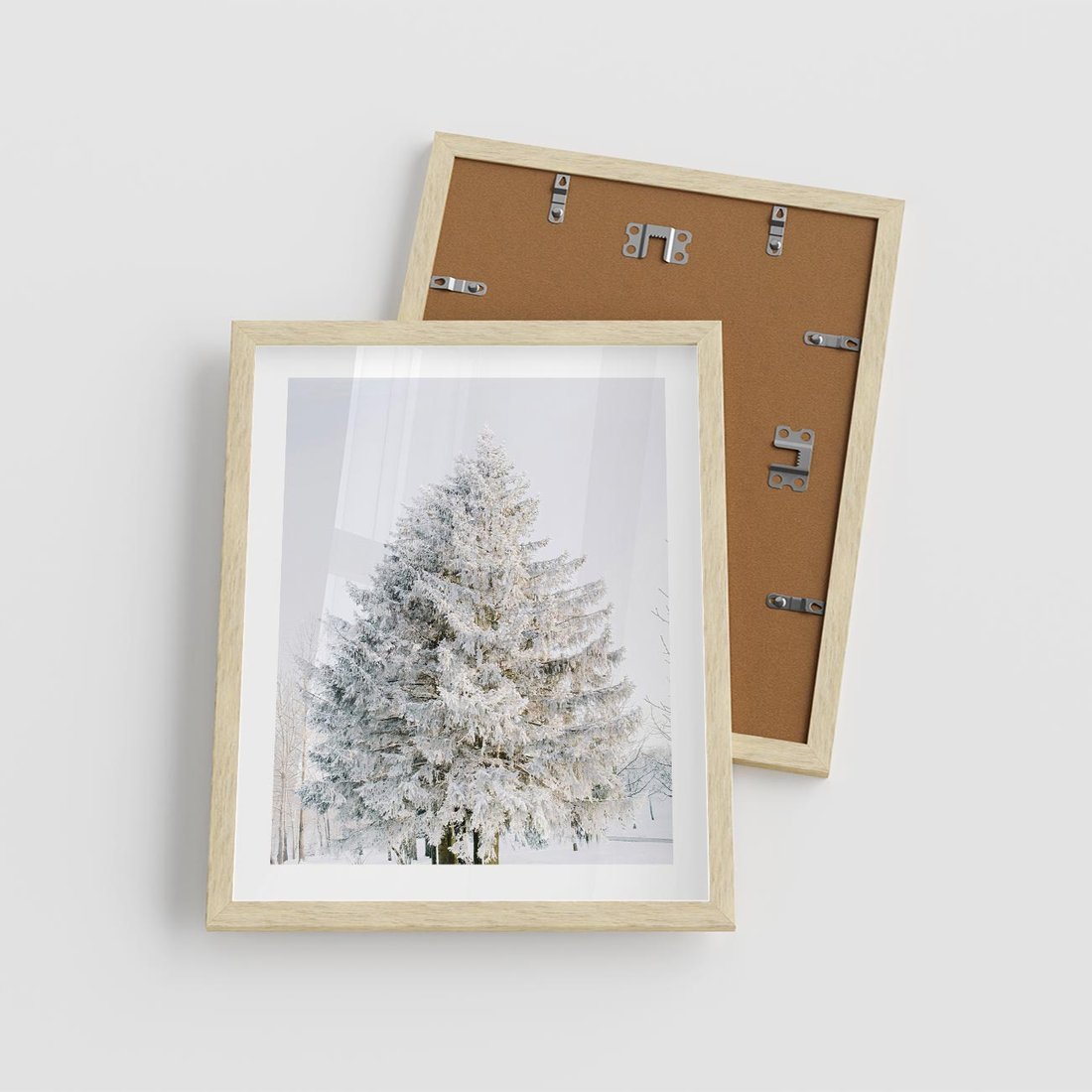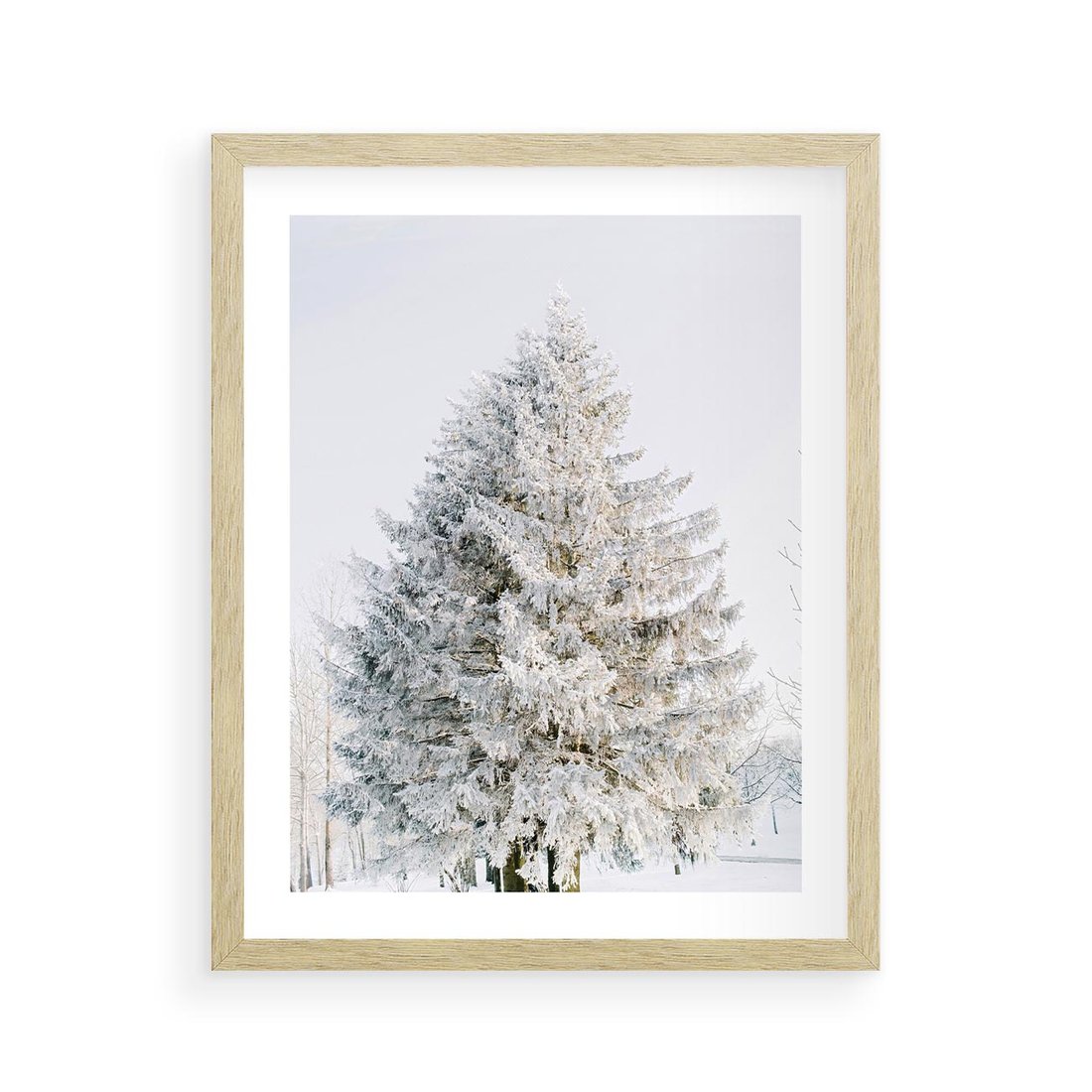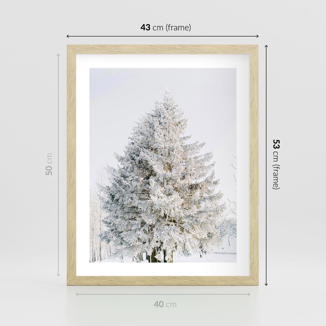 Plakat w ramie 40x50 - Zimowa Poezja w Ośnieżonym Drzewie - ośnieżone drzewo, zima - rama drewno