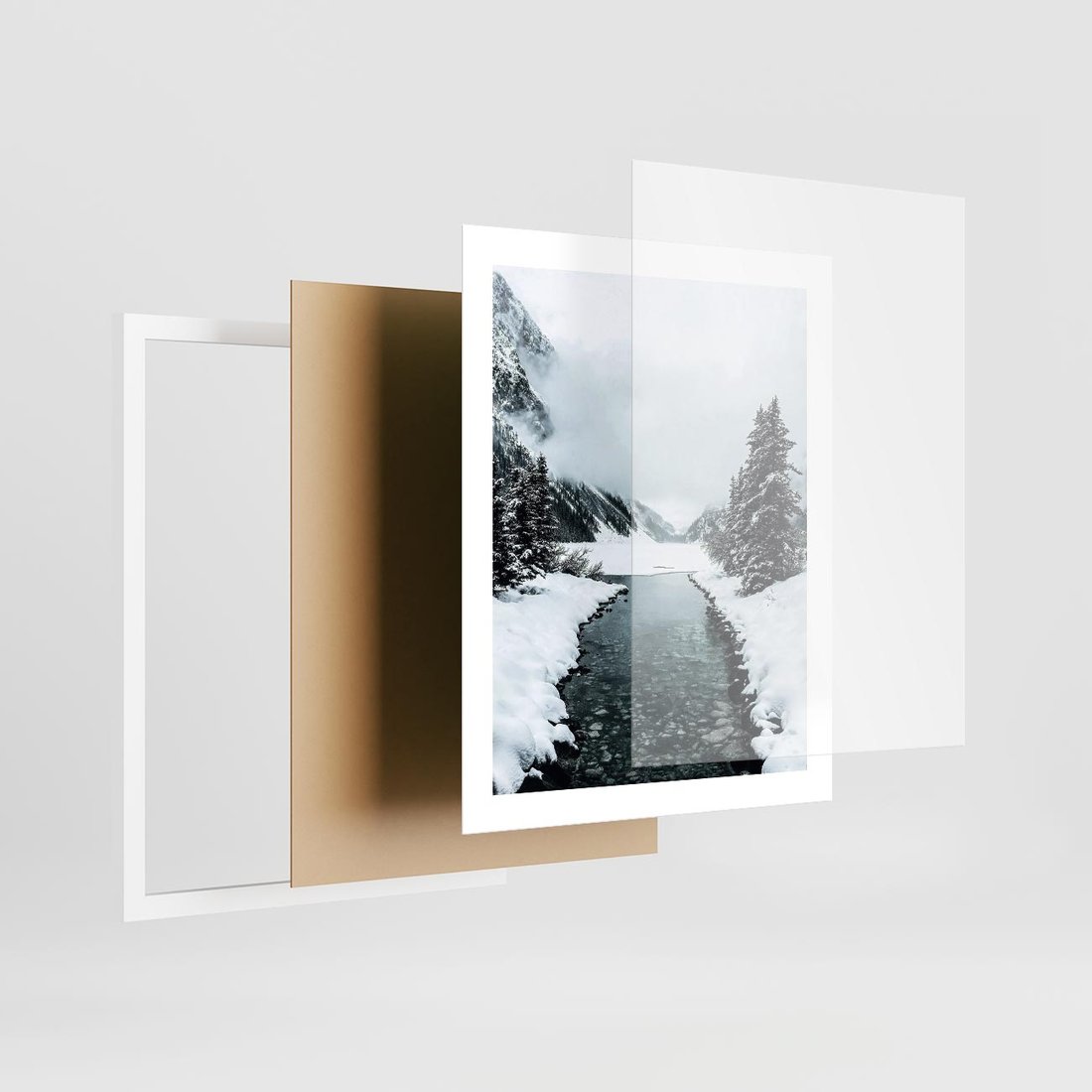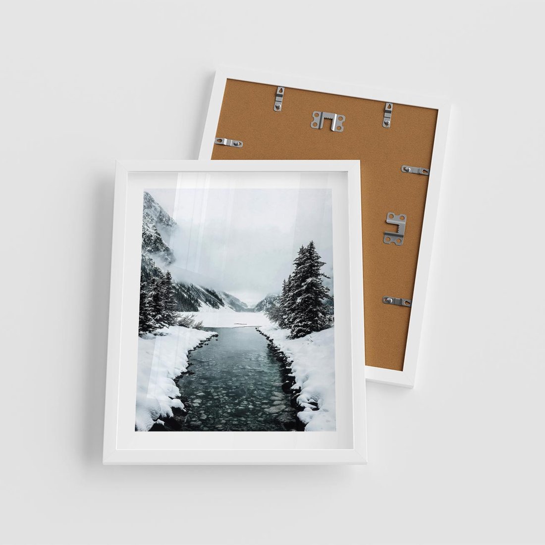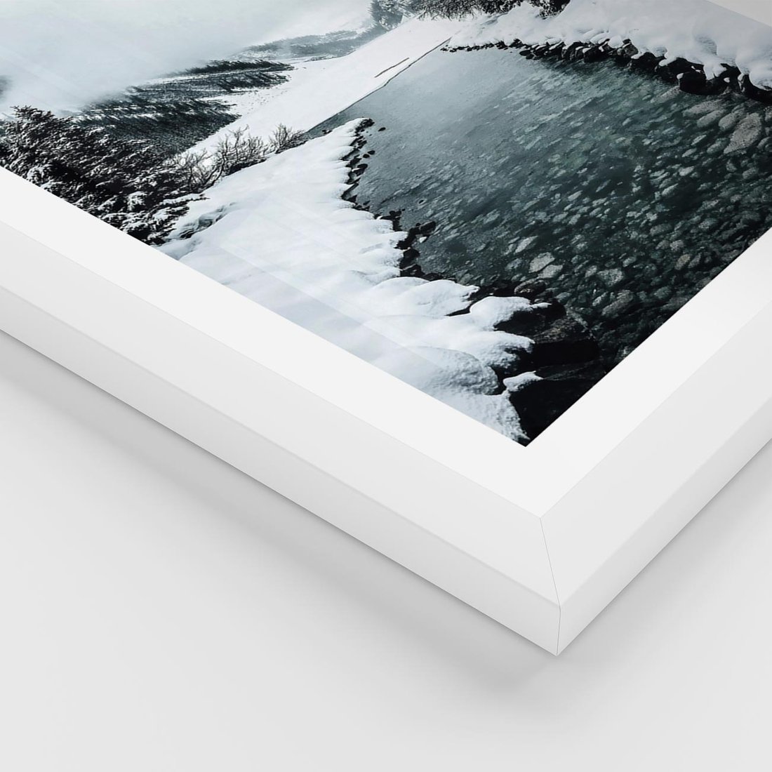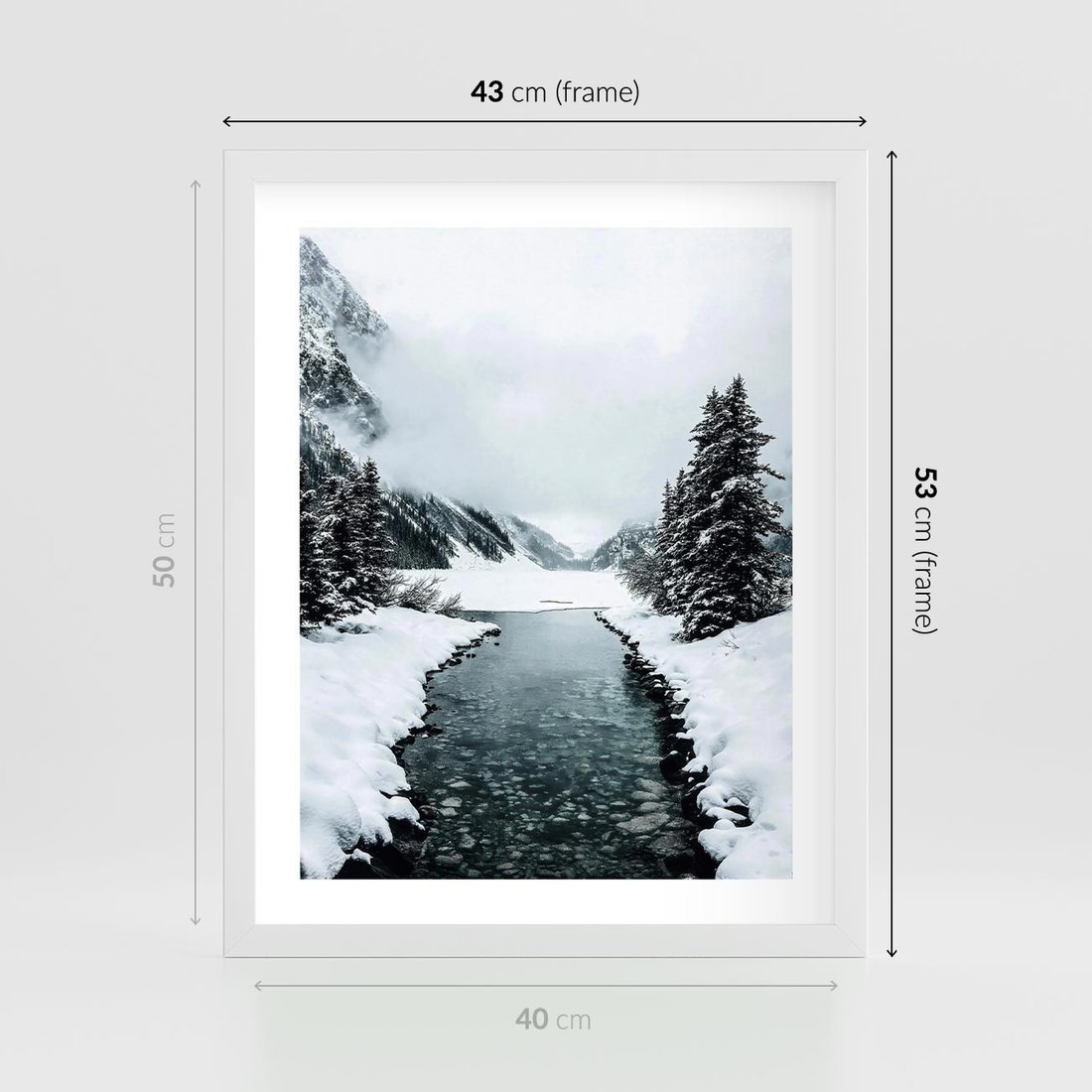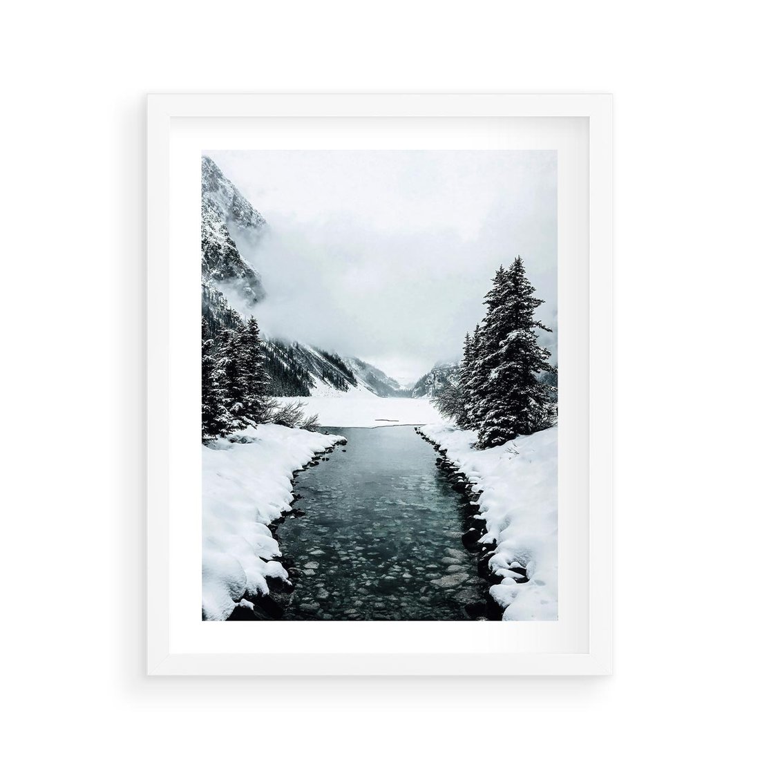 Plakat w ramie 40x50 - Zimowa Przyroda: Rzeka, Góry i Śnieg - zima, rzeka - rama biała