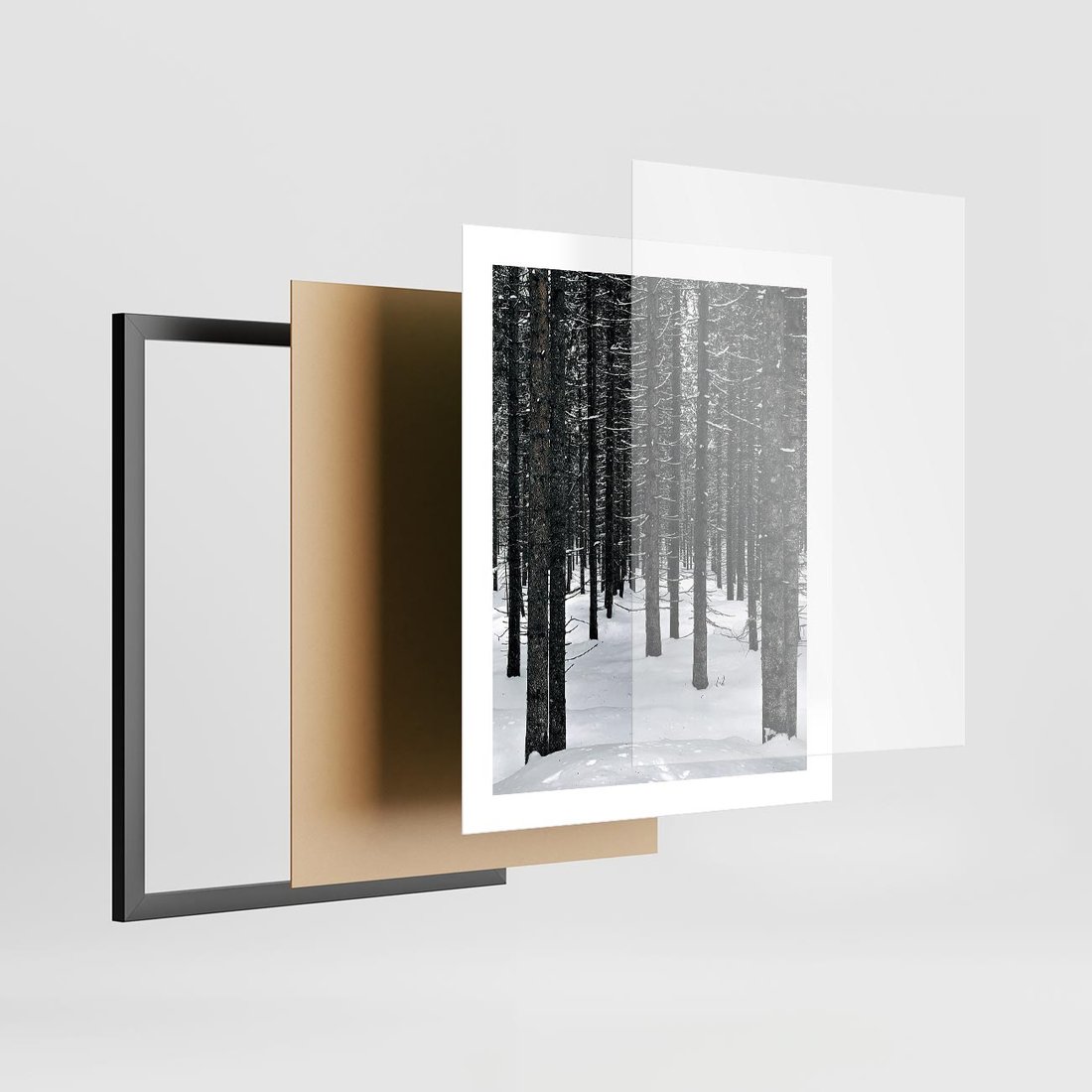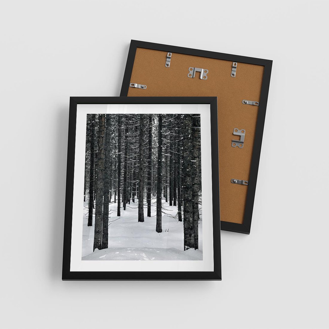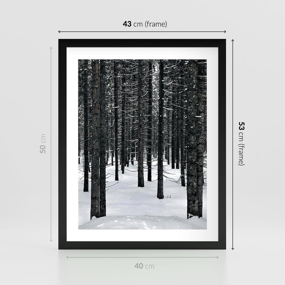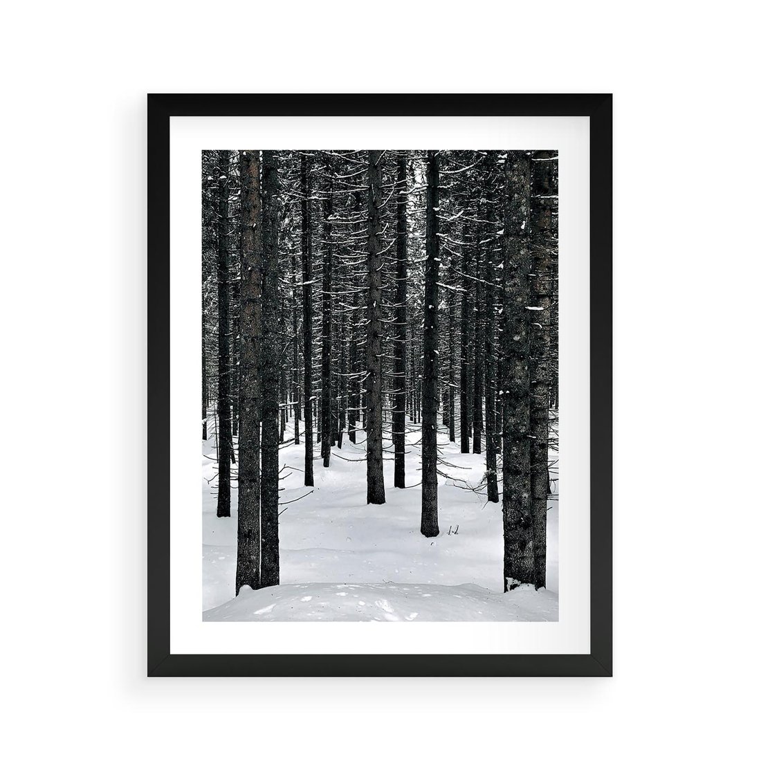 Plakat w ramie 40x50 - Zimowe Drzewa: Śnieg na Pniach - drzew w zimi, pnie drzew - rama czarna