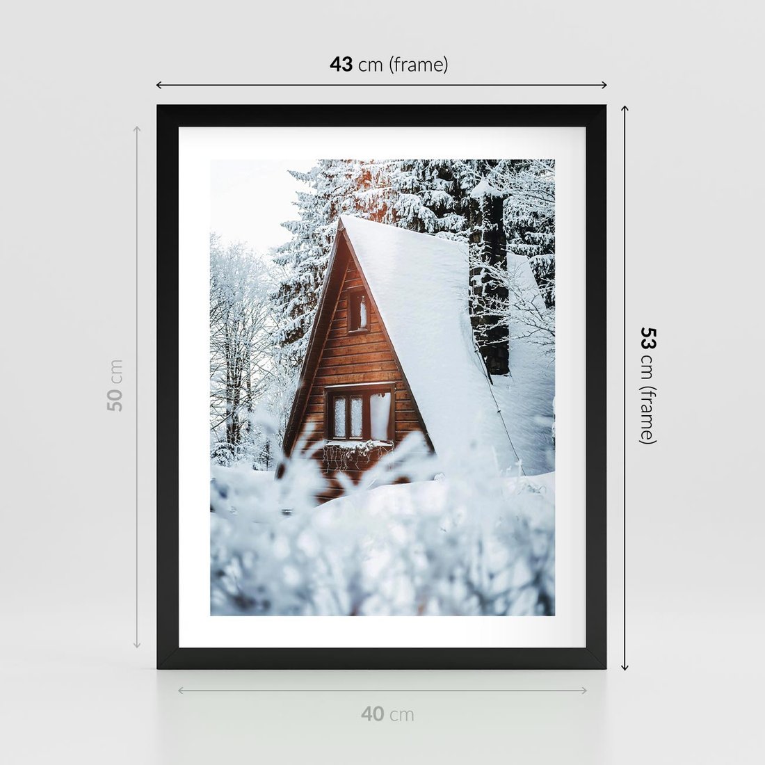 Plakat w ramie 40x50 - Zimowe Ustronie w Lesie - domek w lesie, zimowy las - rama czarna