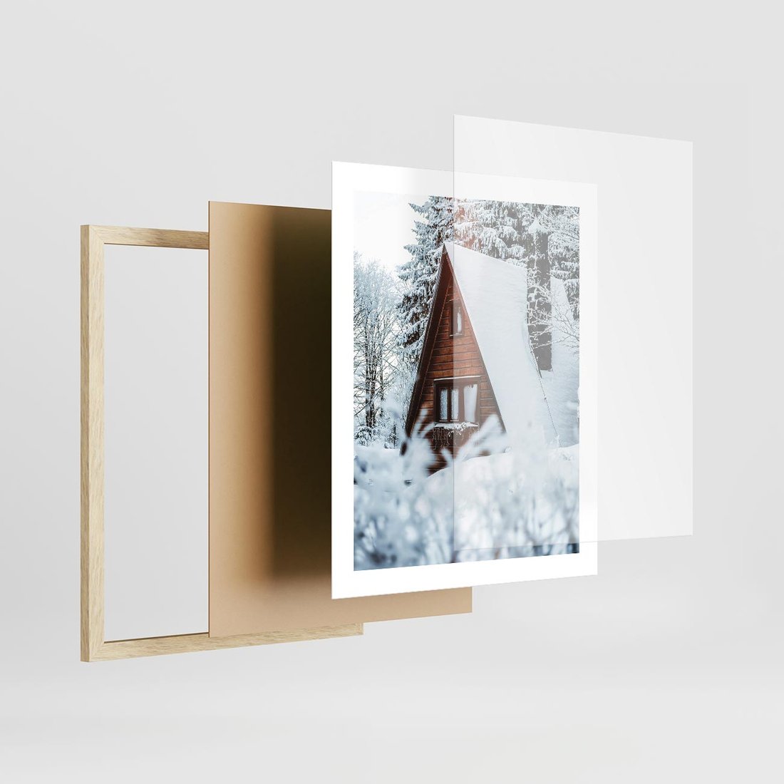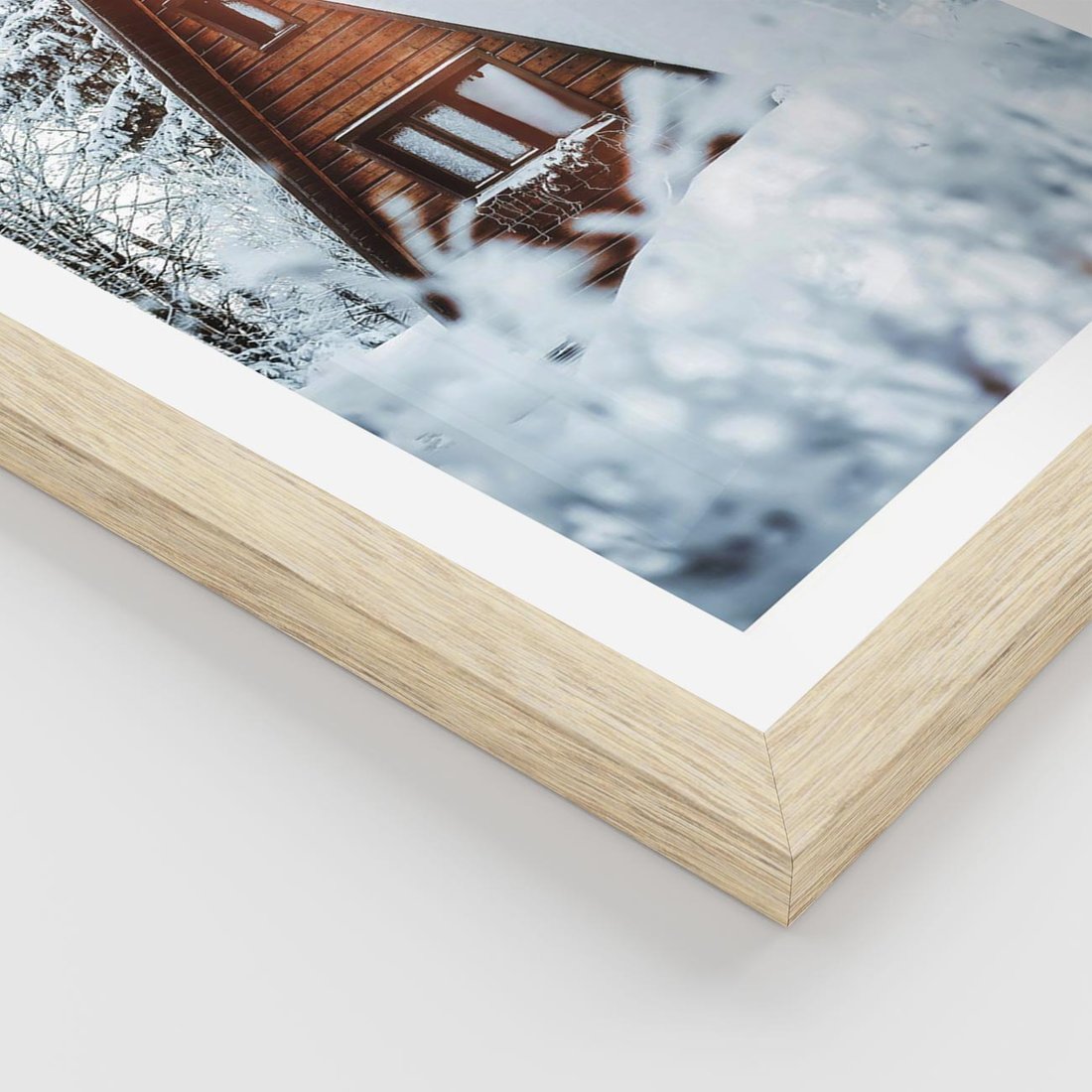 To ujęcie uroczego domku położonego w malowniczym zimowym lesie, gdzie dach budynku jest pokryty śniegiem. Obraz emanuje urokiem zimowego krajobrazu i spokoju. Doskonale pasuje do wnętrz o tematyce zimowej, skandynawskiej lub wiejskiej, nadając im urok i przytulność.