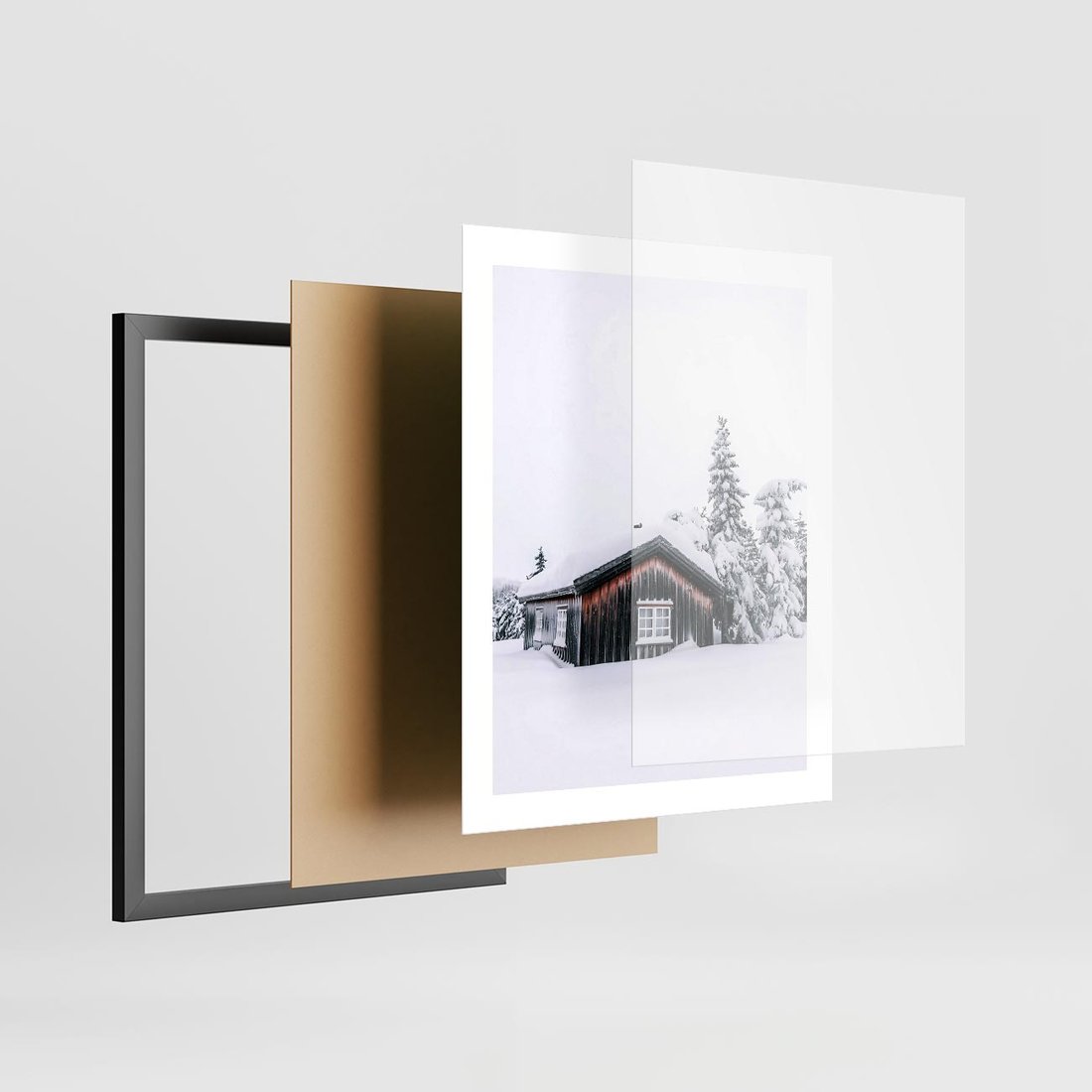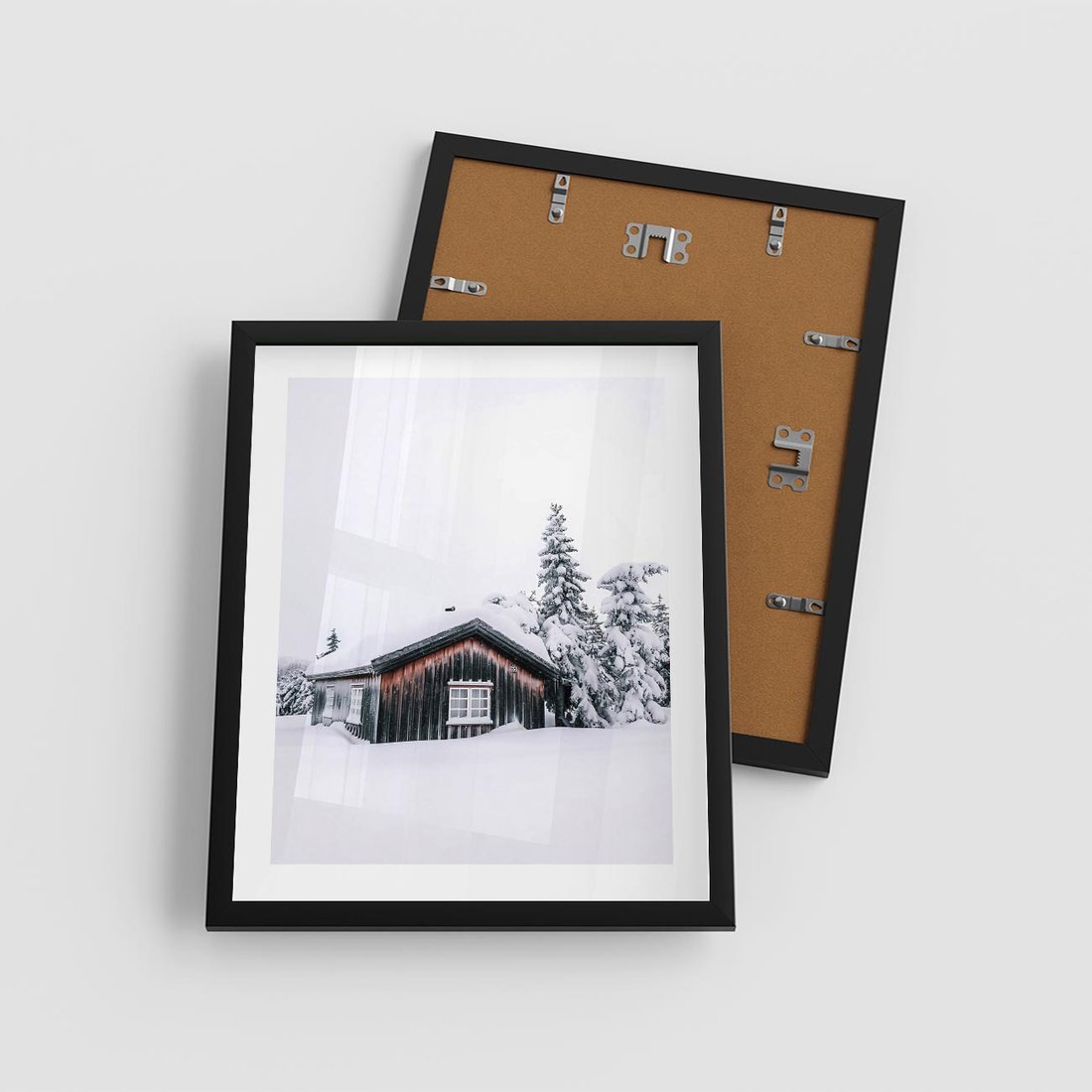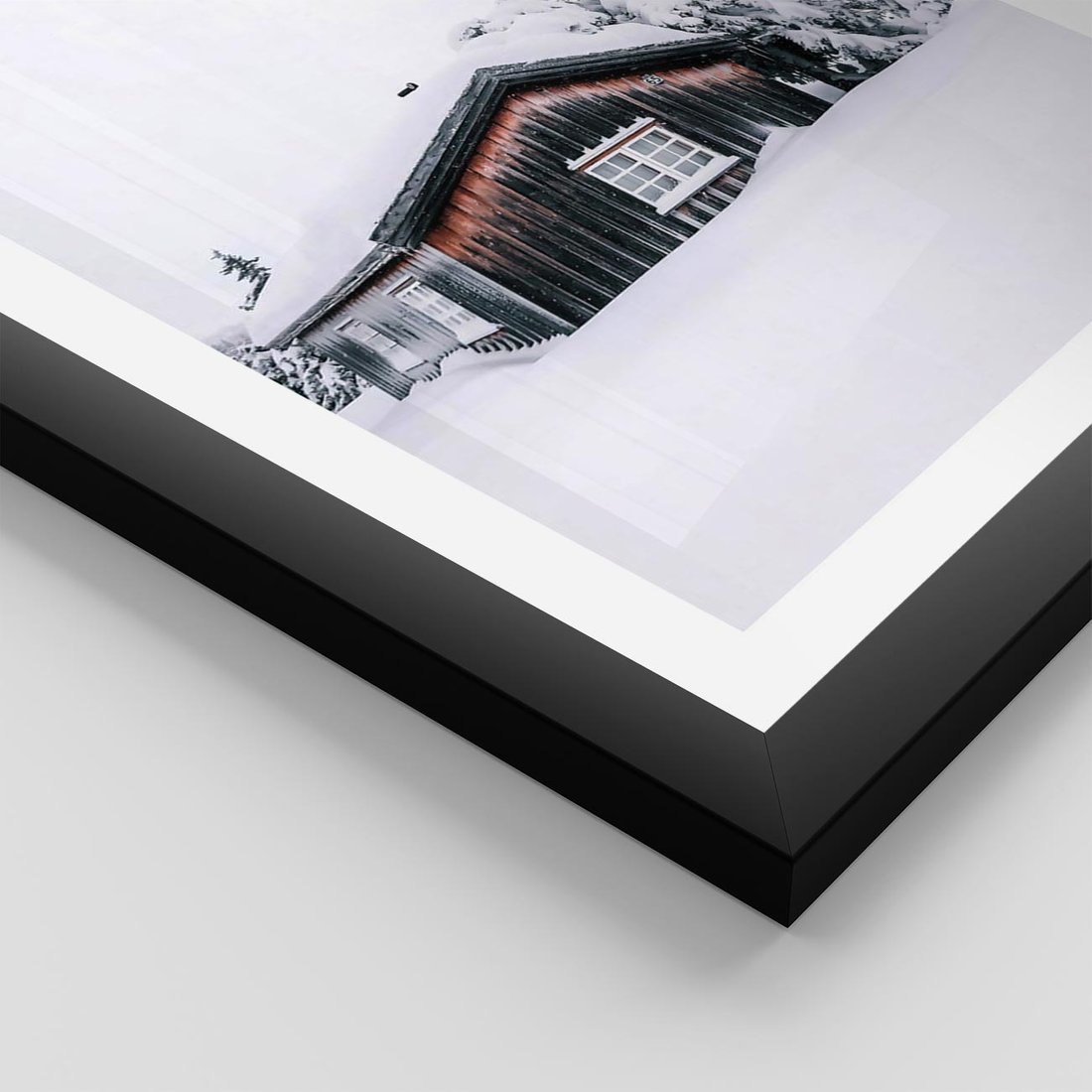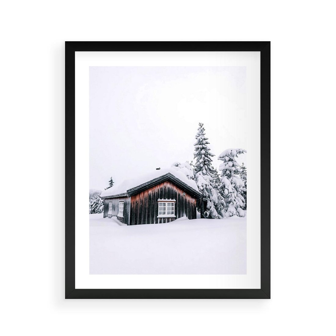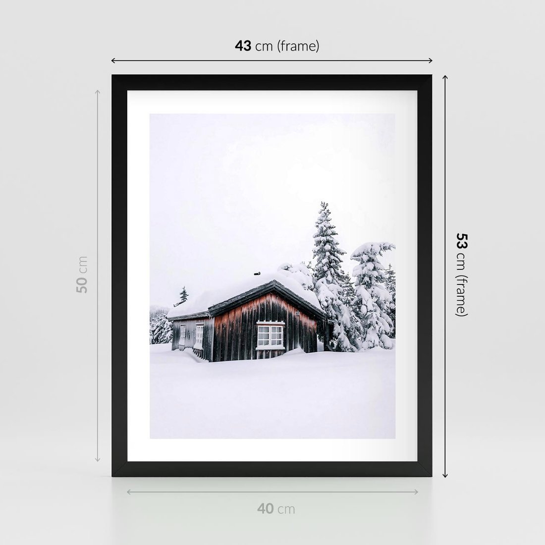 Plakat w ramie 40x50 - Zimowy Azyl: Domek w Górach - domek w górach, śnieg - rama czarna