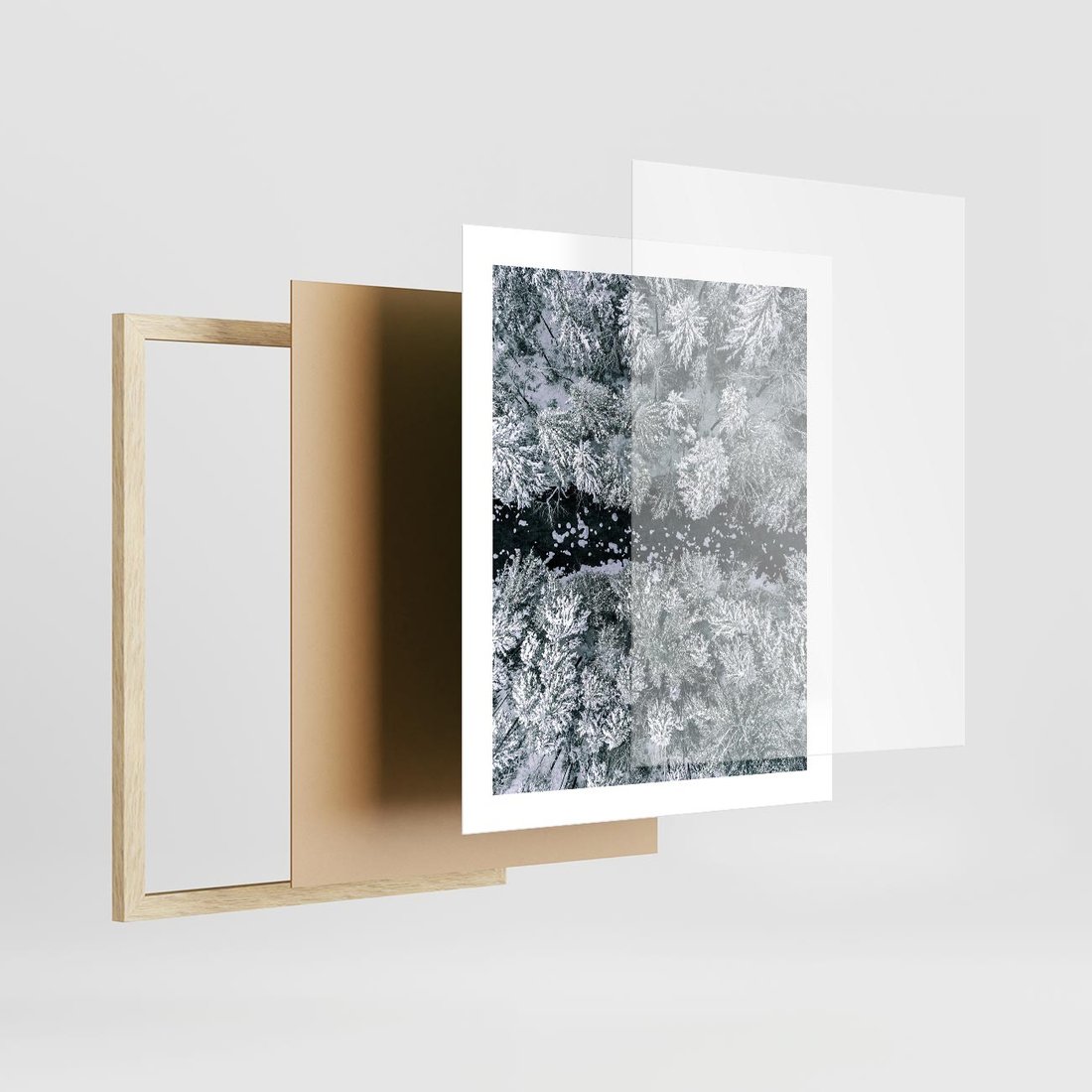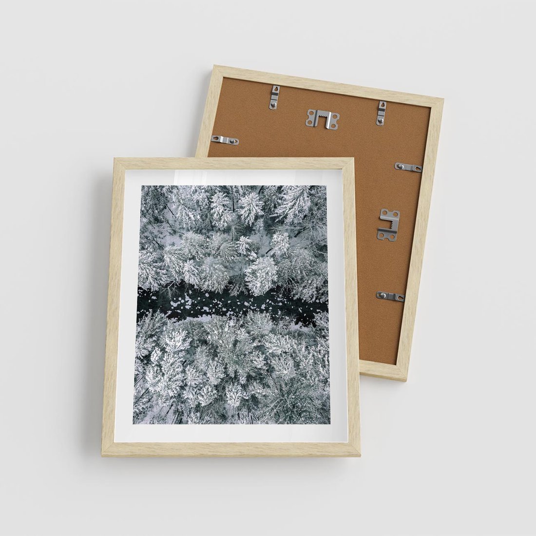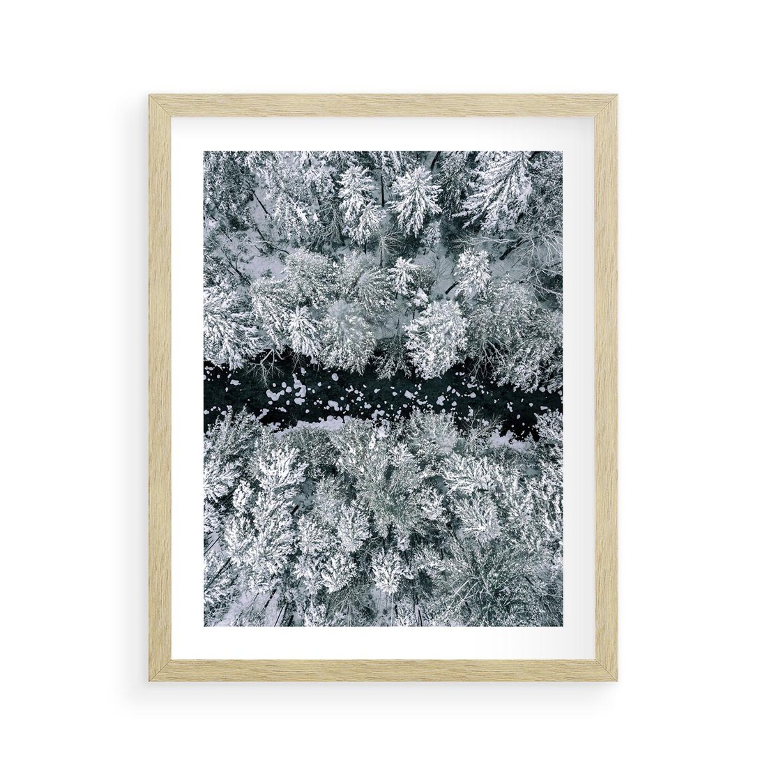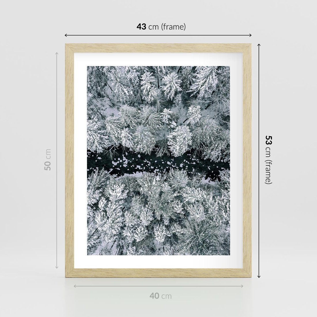 Plakat w ramie 40x50 - Zimowy Krajobraz z Góry - zdjęcie z góry, zaśnieżony las i zamarznięty strumyk - rama drewno