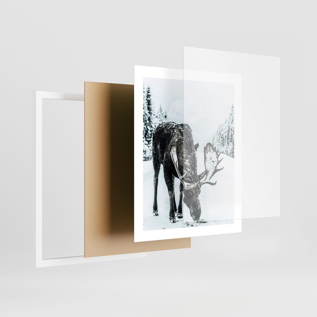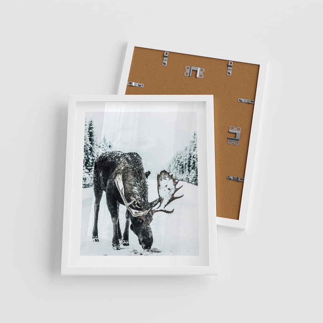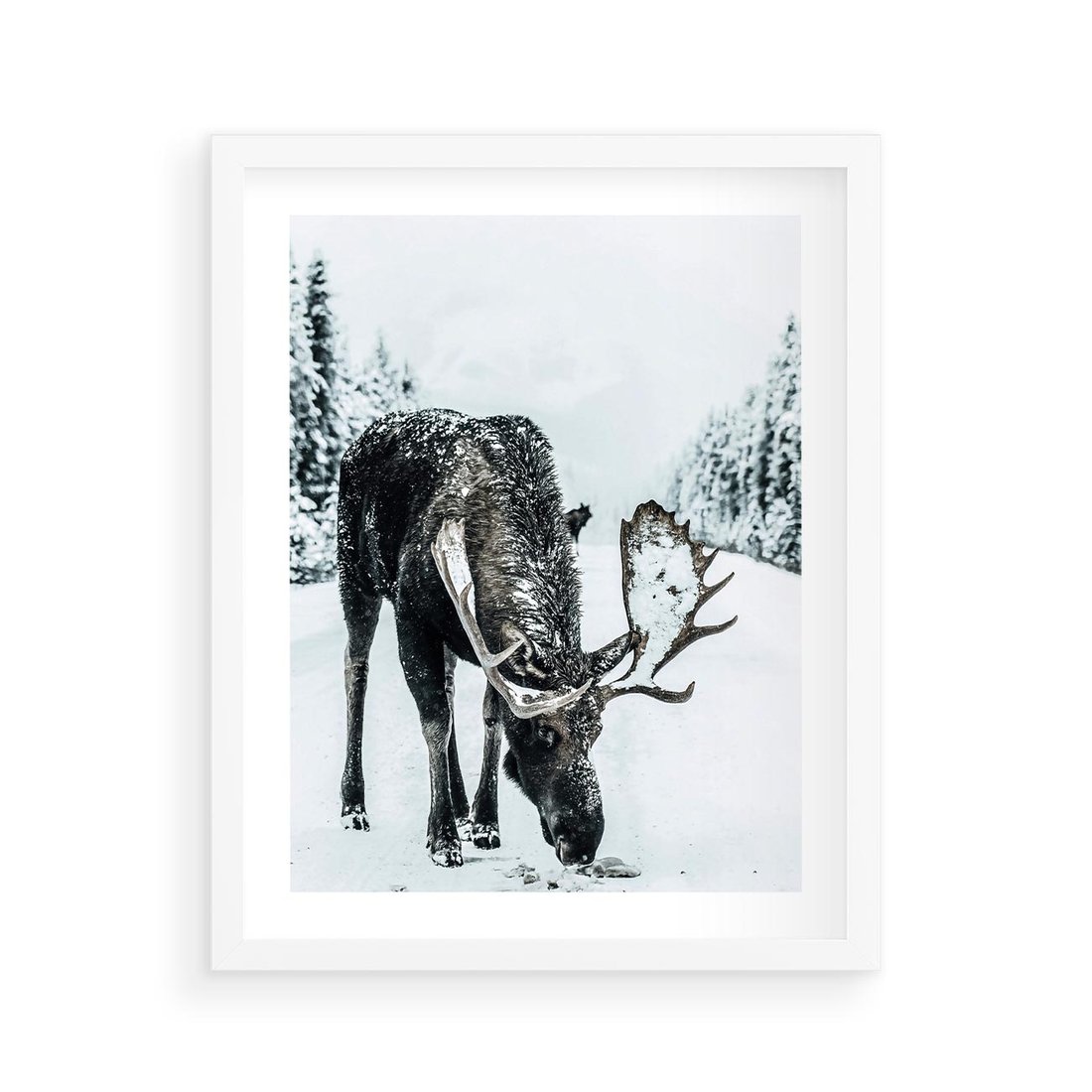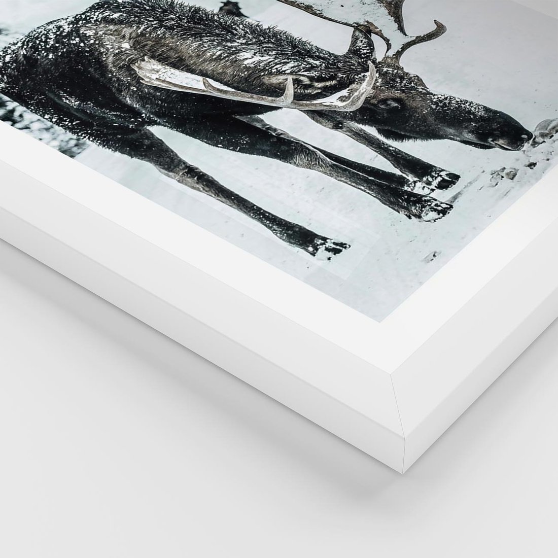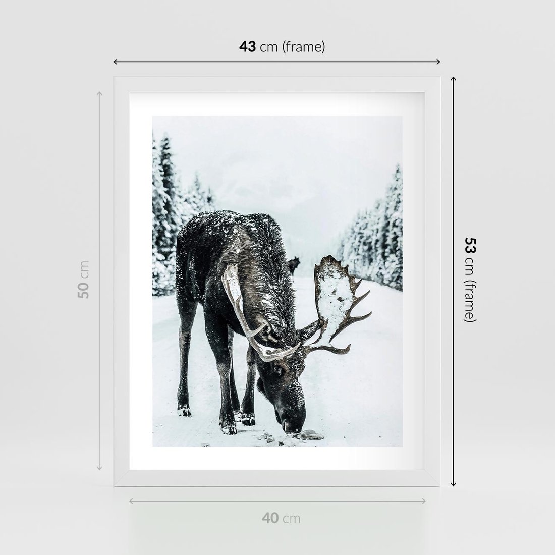 Plakat w ramie 40x50 - Zimowy Portret Łosia - łoś w zimowej scenerii - rama biała