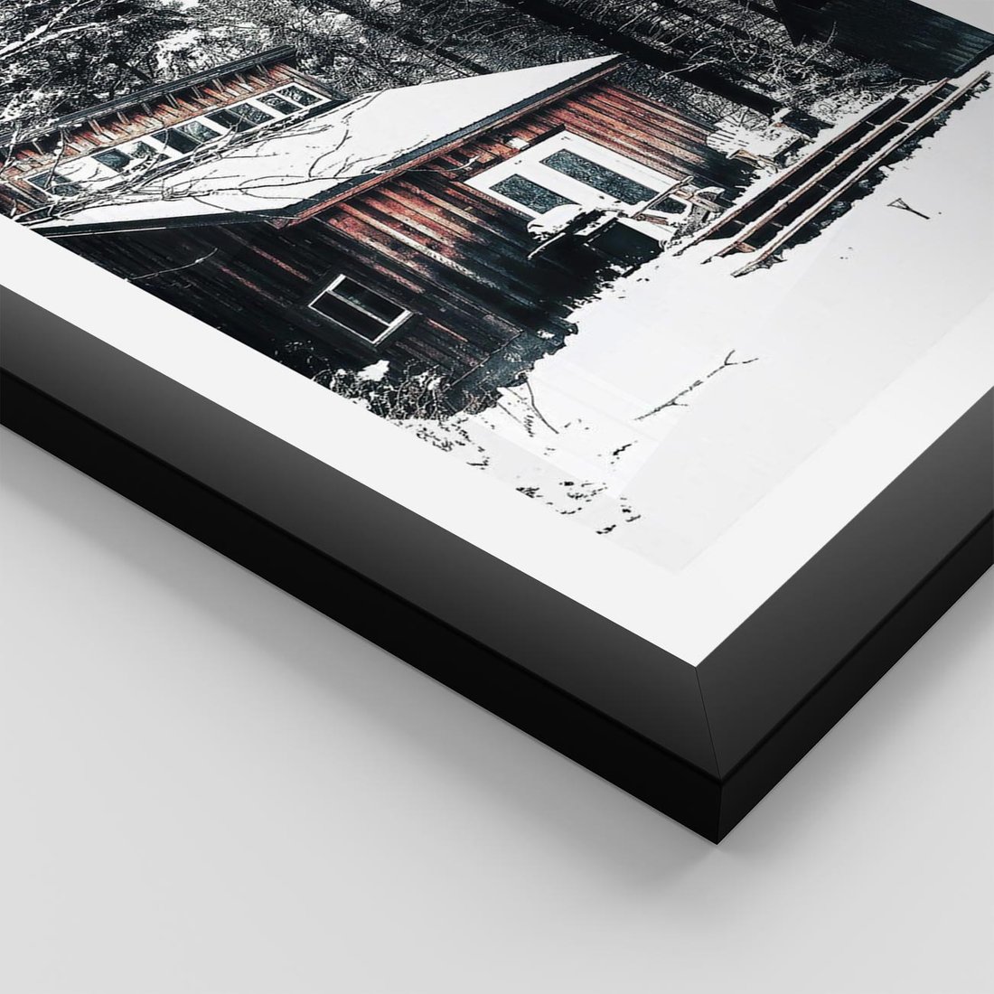 Plakat w ramie 40x50 - Zimowy Urok Drewnianego Domku - zima, drewniany domek - rama czarna