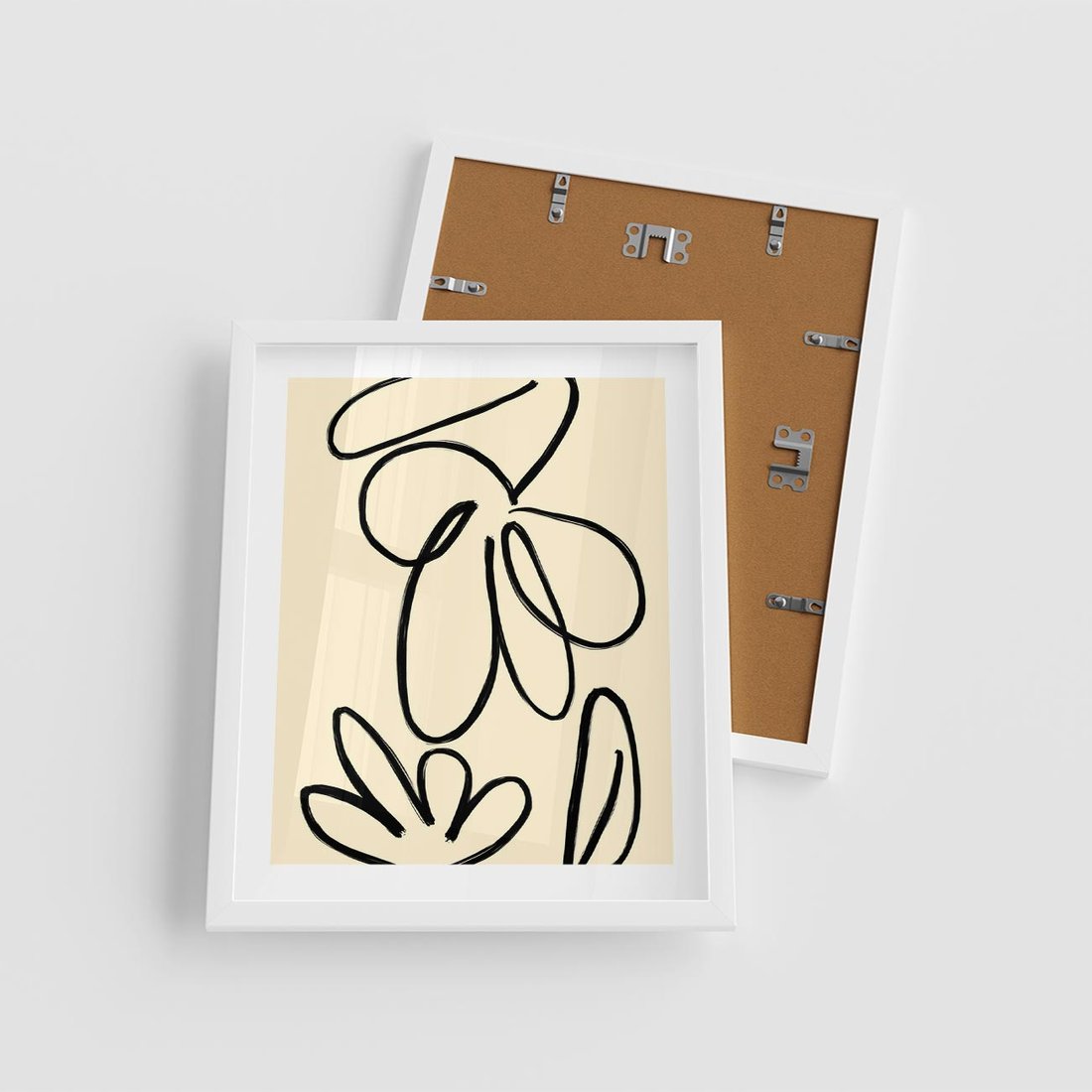 Nasza abstrakcyjna sztuka to delikatna kompozycja przypominająca kształtem kwiat. Wszystko to utrzymane jest w kontrastujących czerń i biel. To minimalizm w swojej najczystszej formie, gdzie subtelne linie tworzą elegancką i spokojną wizję, oddając hołd prostocie i pięknu.