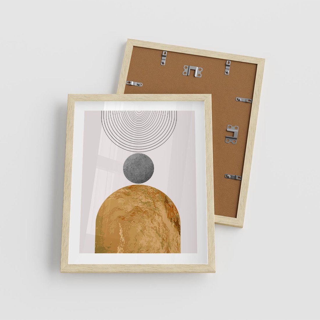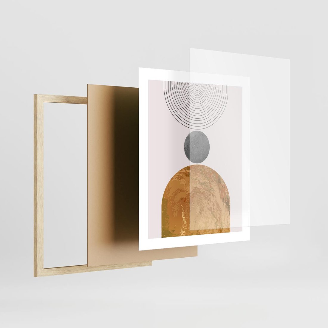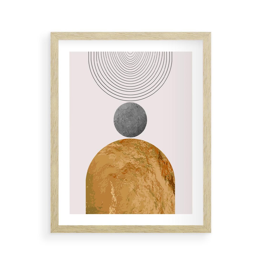 Nasza grafika to hołd dla estetyki i prostoty. To minimalistyczne dzieło sztuki przedstawia złote półkole w środku geometrycznego wzoru, co tworzy wyjątkową i nowoczesną kompozycję. Ta dekoracja jest idealnym dodatkiem do nowoczesnych wnętrz, dodając im elegancji i unikalnego stylu.