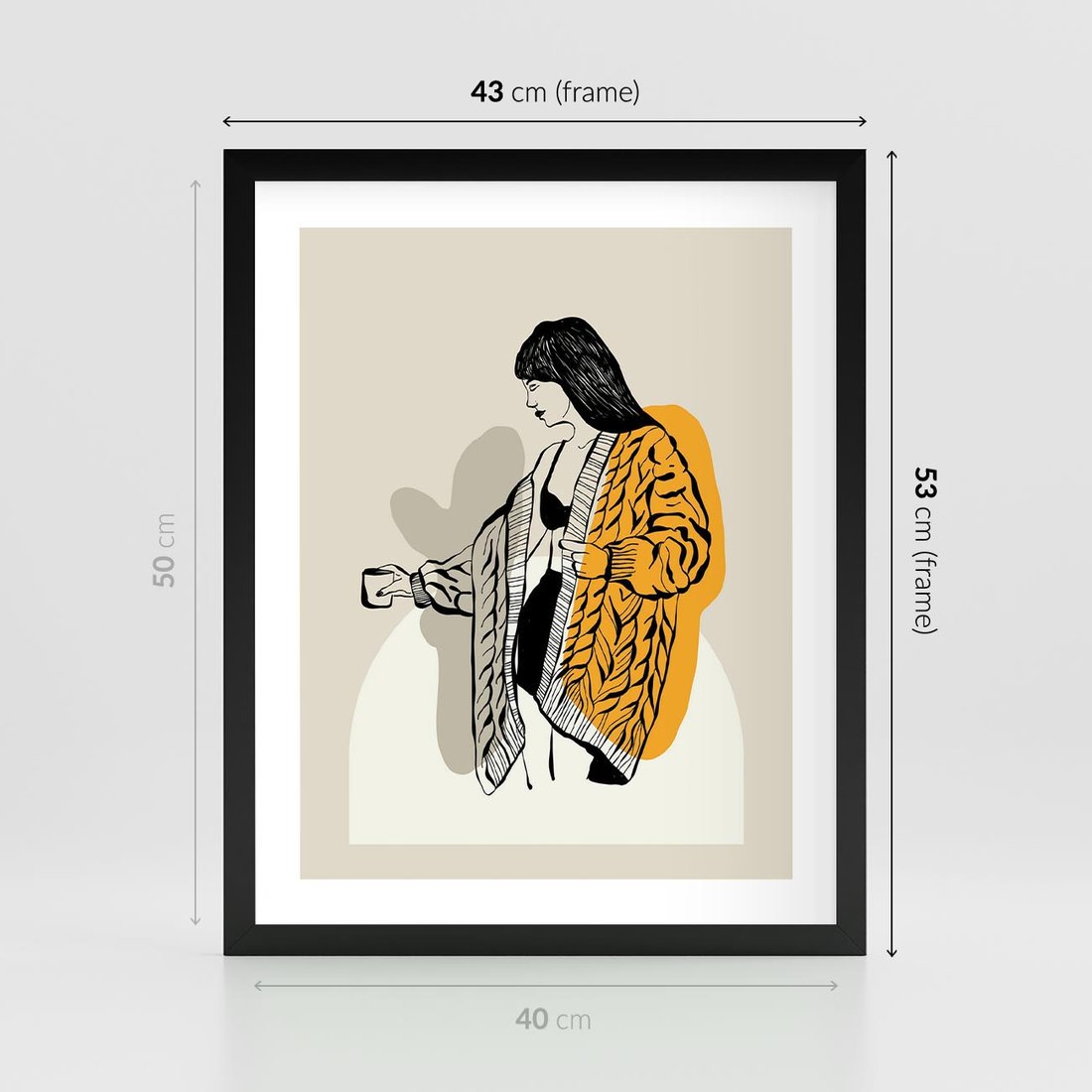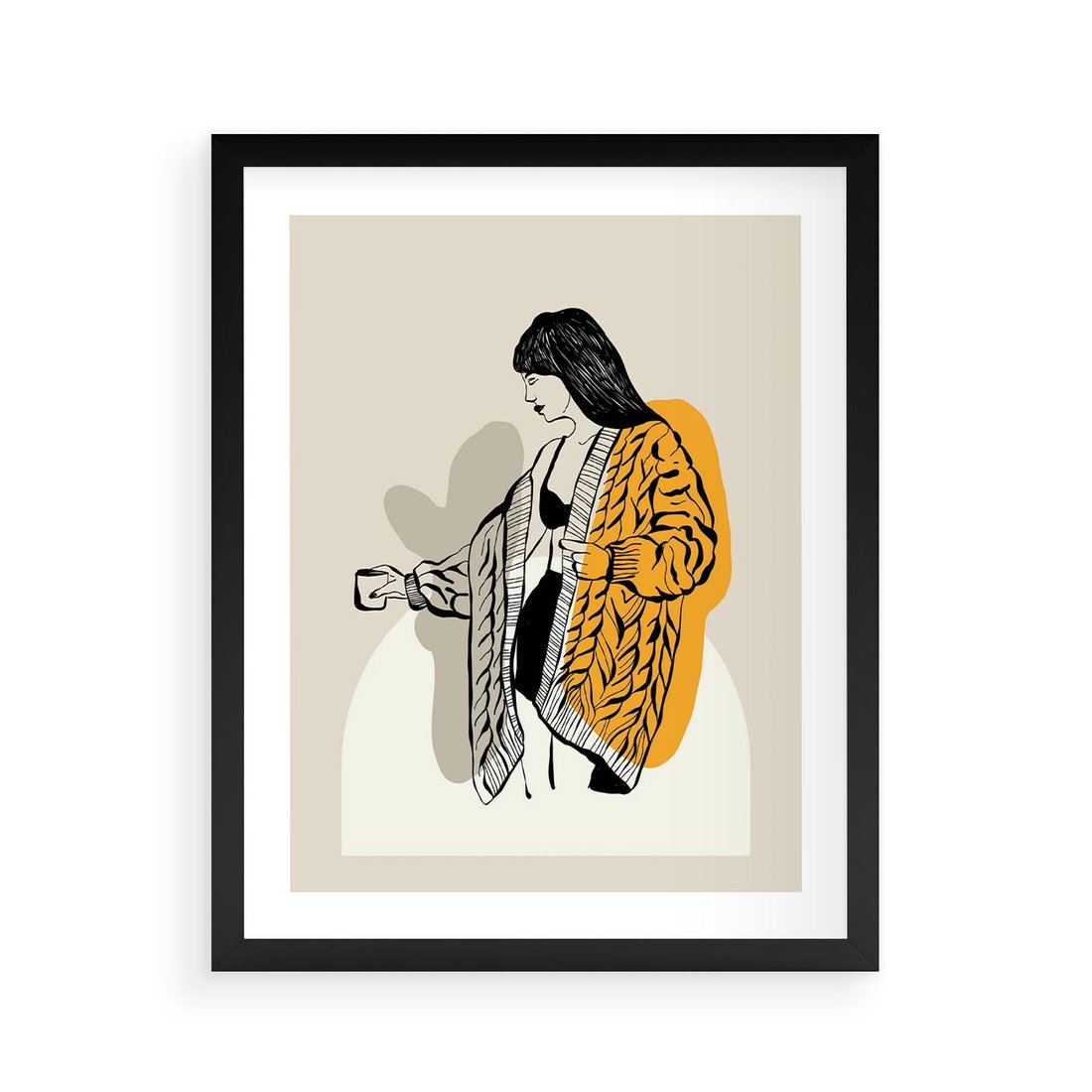 Obraz przedstawia minimalistyczną grafikę w formie szkicu kobiety, utrzymanego w czerni i bieli, z dodatkiem żółtych akcentów. Ta kompozycja doskonale podkreśla prostotę i elegancję, doskonale pasując do nowoczesnych wnętrz.