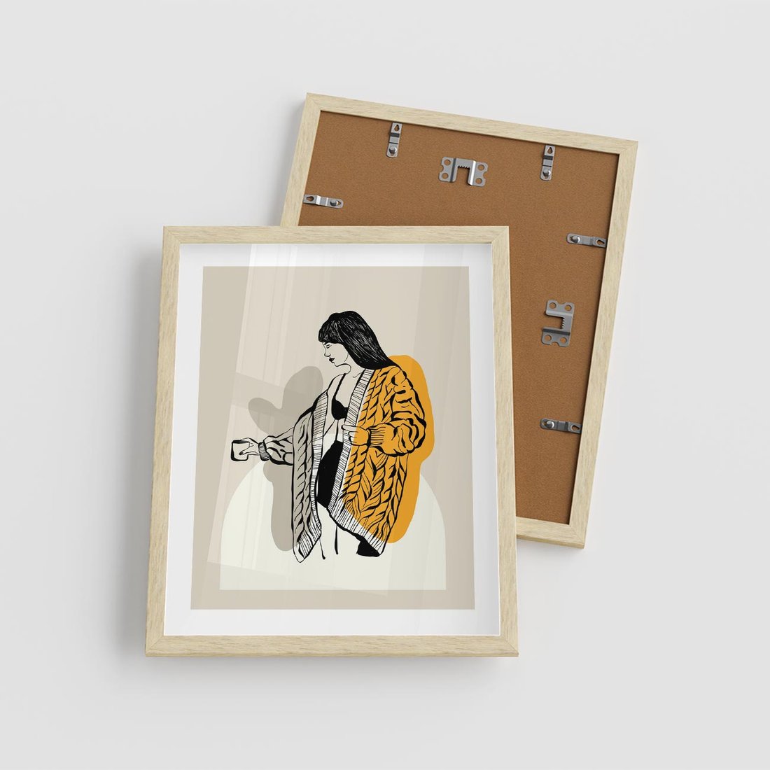Obraz przedstawia minimalistyczną grafikę w formie szkicu kobiety, utrzymanego w czerni i bieli, z dodatkiem żółtych akcentów. Ta kompozycja doskonale podkreśla prostotę i elegancję, doskonale pasując do nowoczesnych wnętrz.
