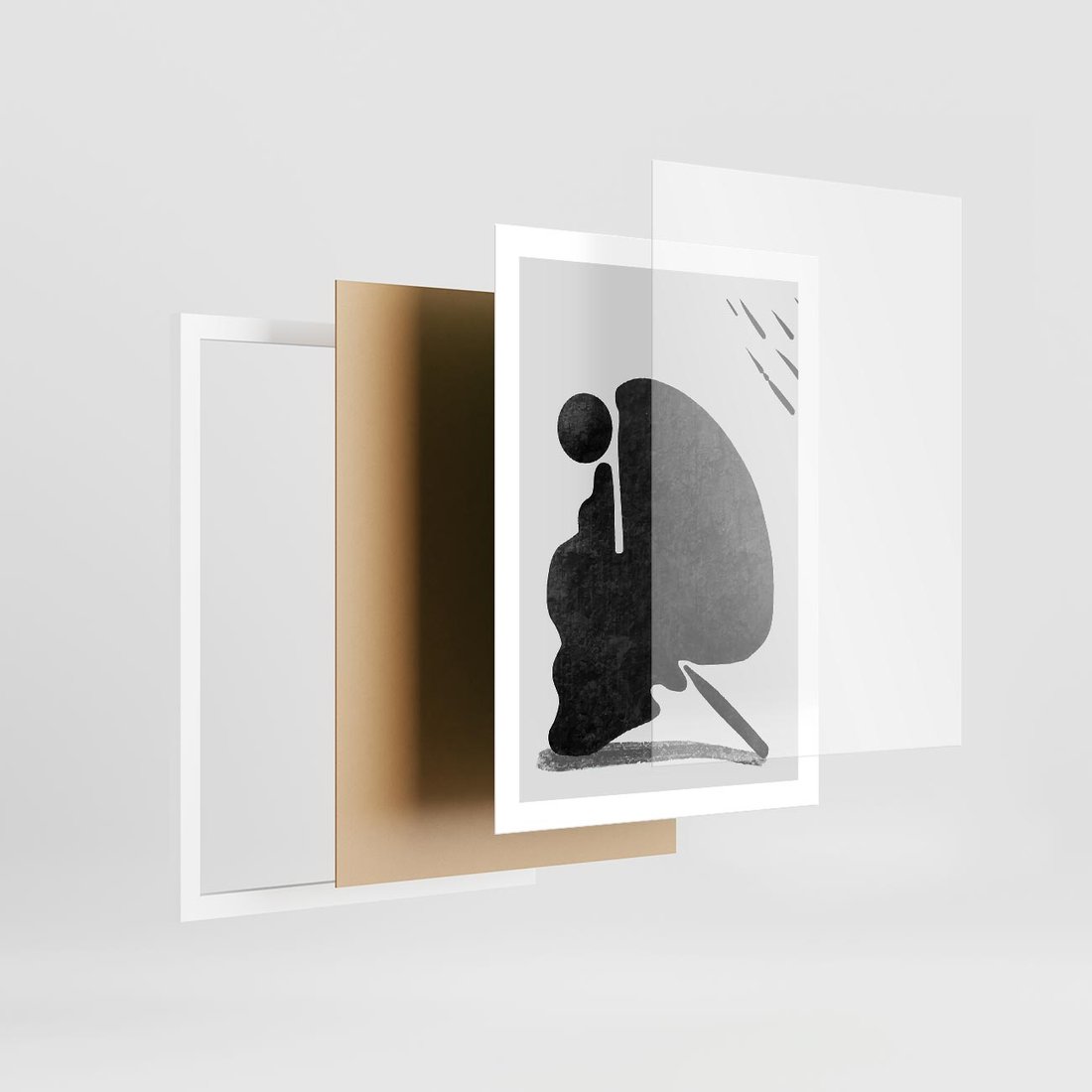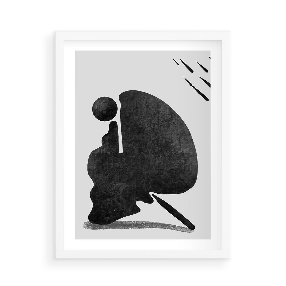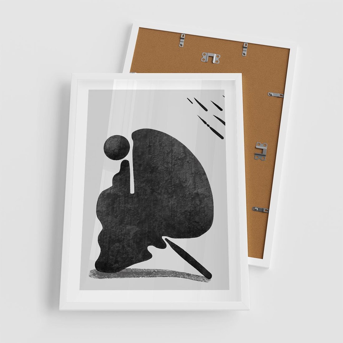 Abstrakcyjny plakat inspirowany japońską sztuką, przedstawiający czarną postać w formie minimalistycznego i artystycznego motywu.