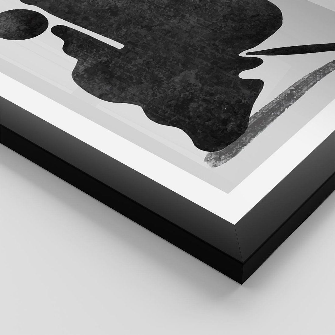 Abstrakcyjny plakat inspirowany japońską sztuką, przedstawiający czarną postać w formie minimalistycznego i artystycznego motywu.