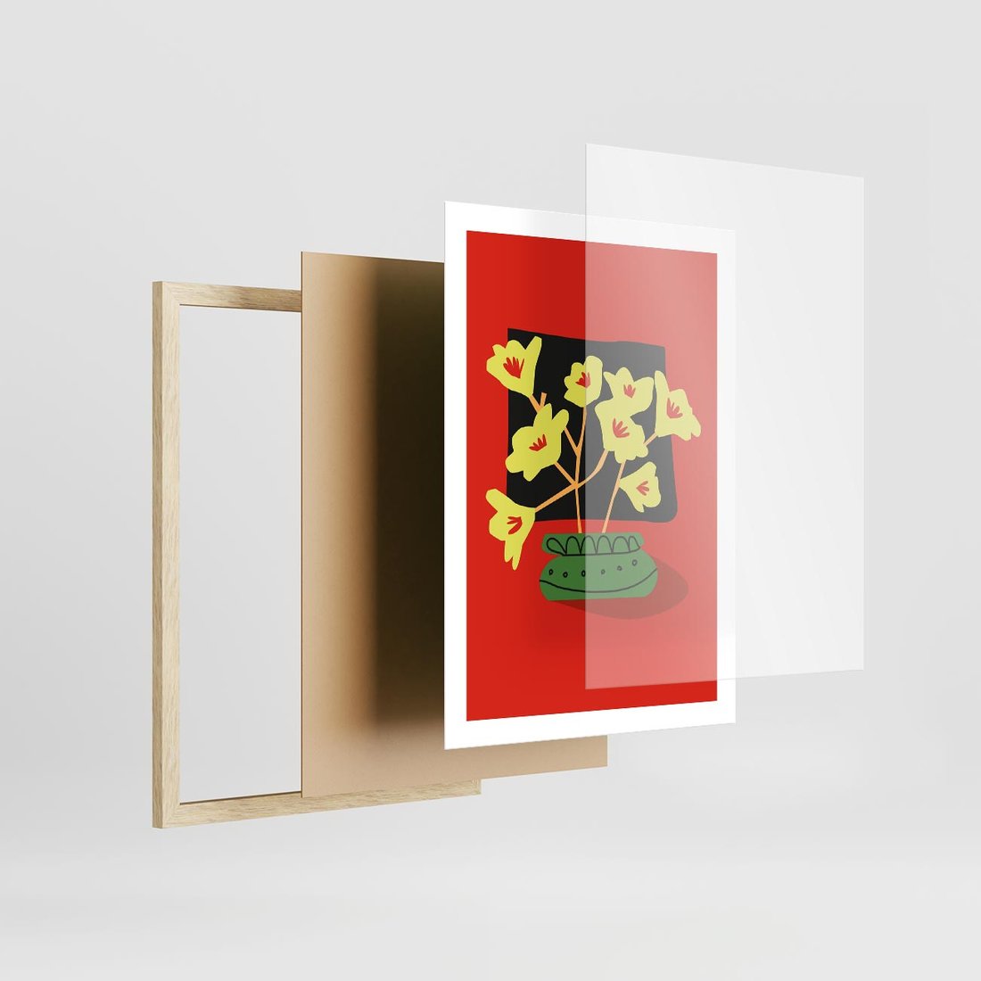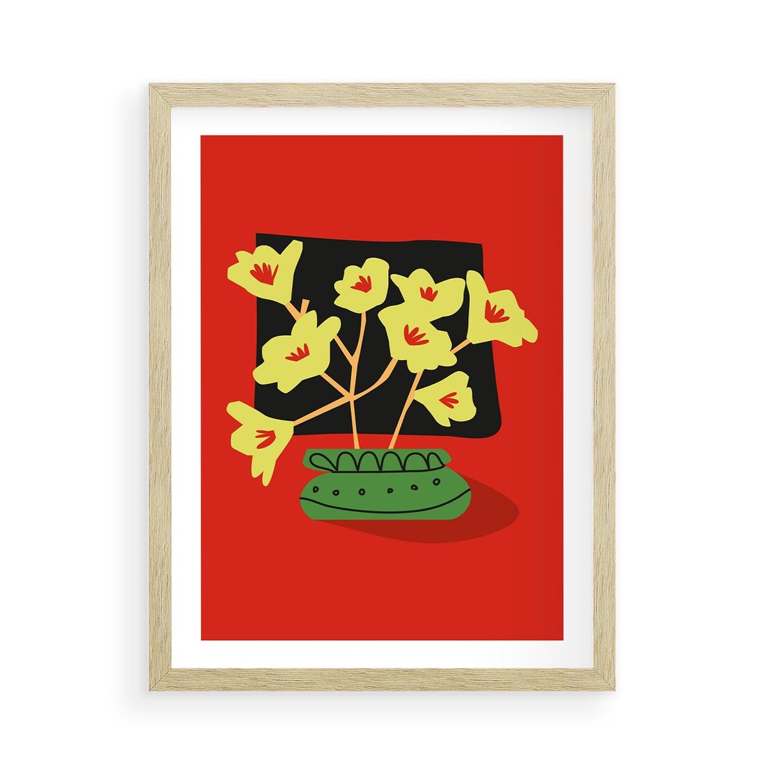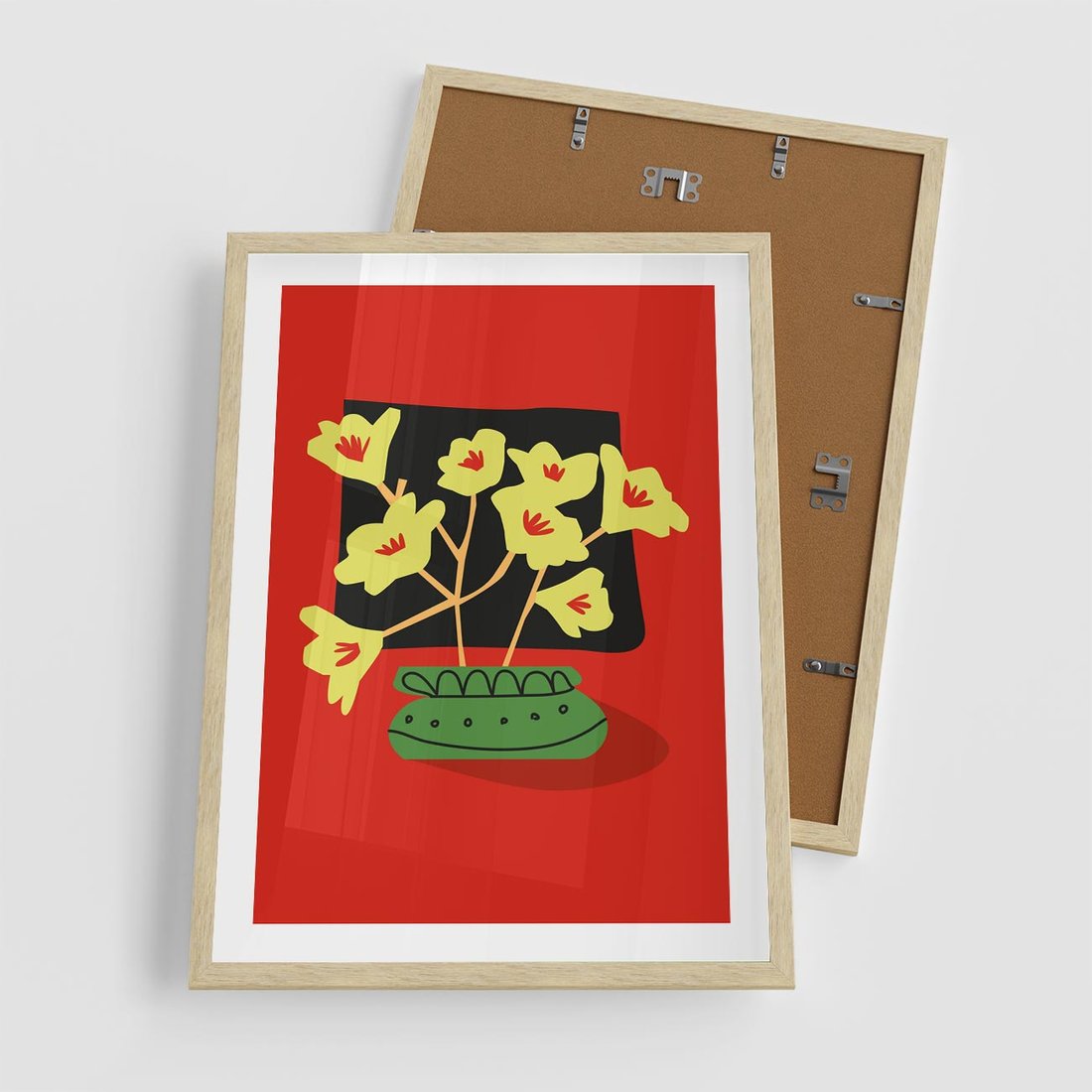 Ten nowoczesny plakat ukazuje abstrakcyjne kwiaty na głębokim czerwonym tle. Sztuka ta wprowadza pasję i wyrazistość do przestrzeni, tworząc zmysłową kompozycję, która przyciąga uwagę i budzi emocje.