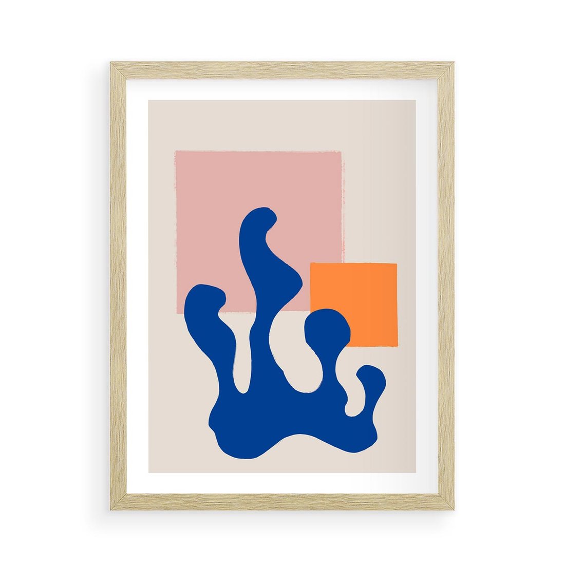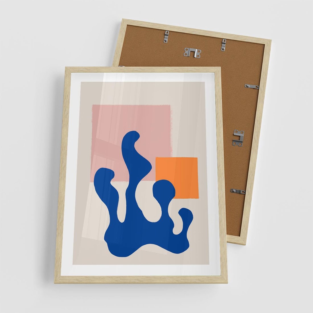 Ten nowoczesny plakat jest prawdziwym dziełem abstrakcyjnej sztuki, w którym dominują geometryczne kształty w intensywnych kolorach: pomarańczowym i granatowym. To dzieło łączy w sobie nowoczesność z abstrakcją, tworząc efektowną i energetyczną kompozycję. Idealny wybór dla miłośników sztuki nowoczesnej i wyrazistych wzorów.
