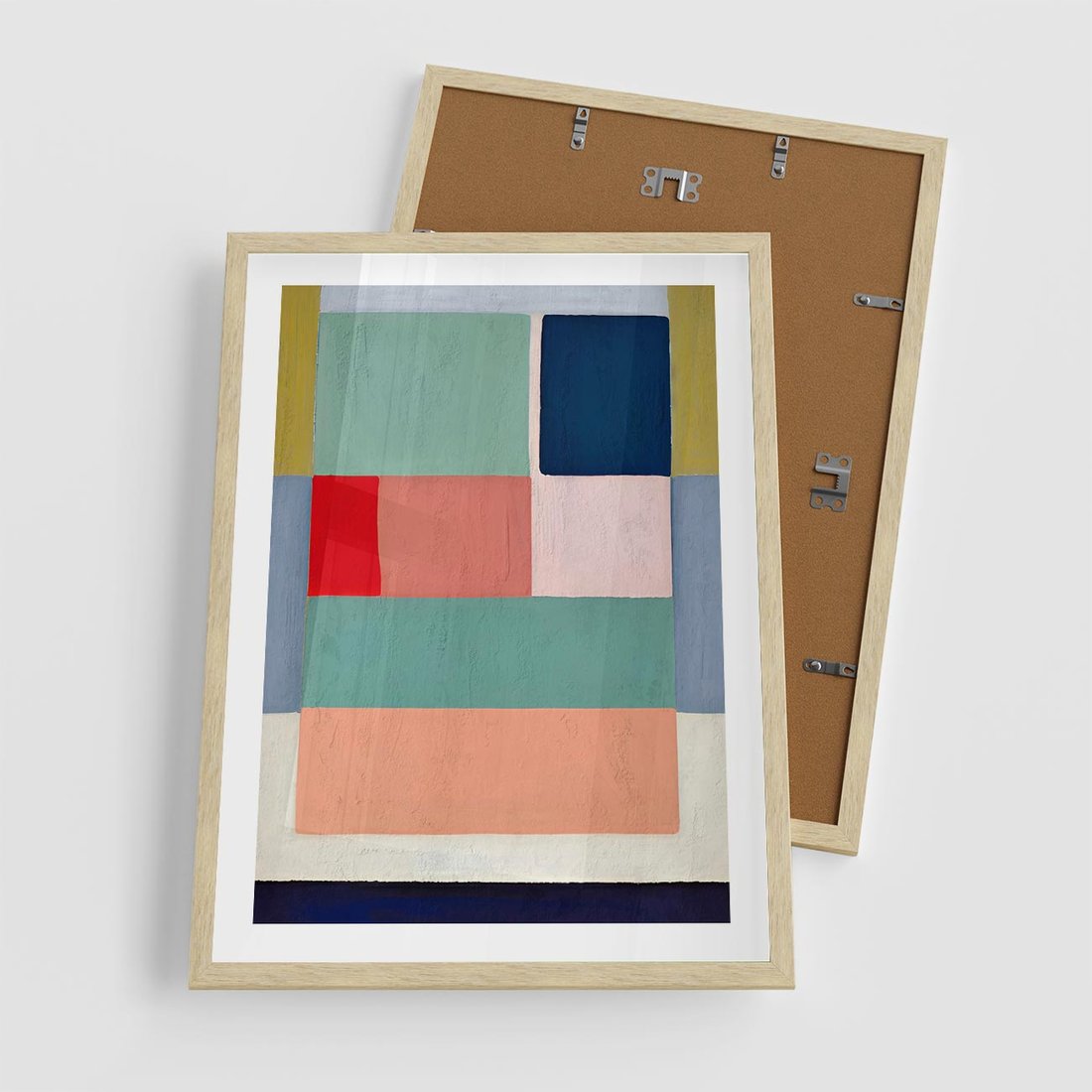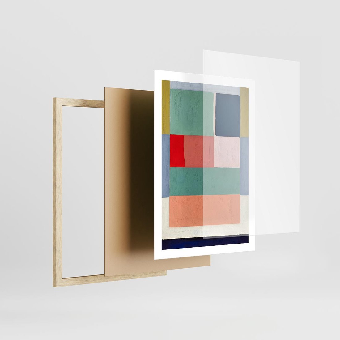 To olejny obraz o abstrakcyjnych geometrycznych kształtach, w których dominują pastelowe kolory. Prostokąty i kwadraty tworzą harmonijną kompozycję, która zachwyca swoją subtelnością i równowagą.