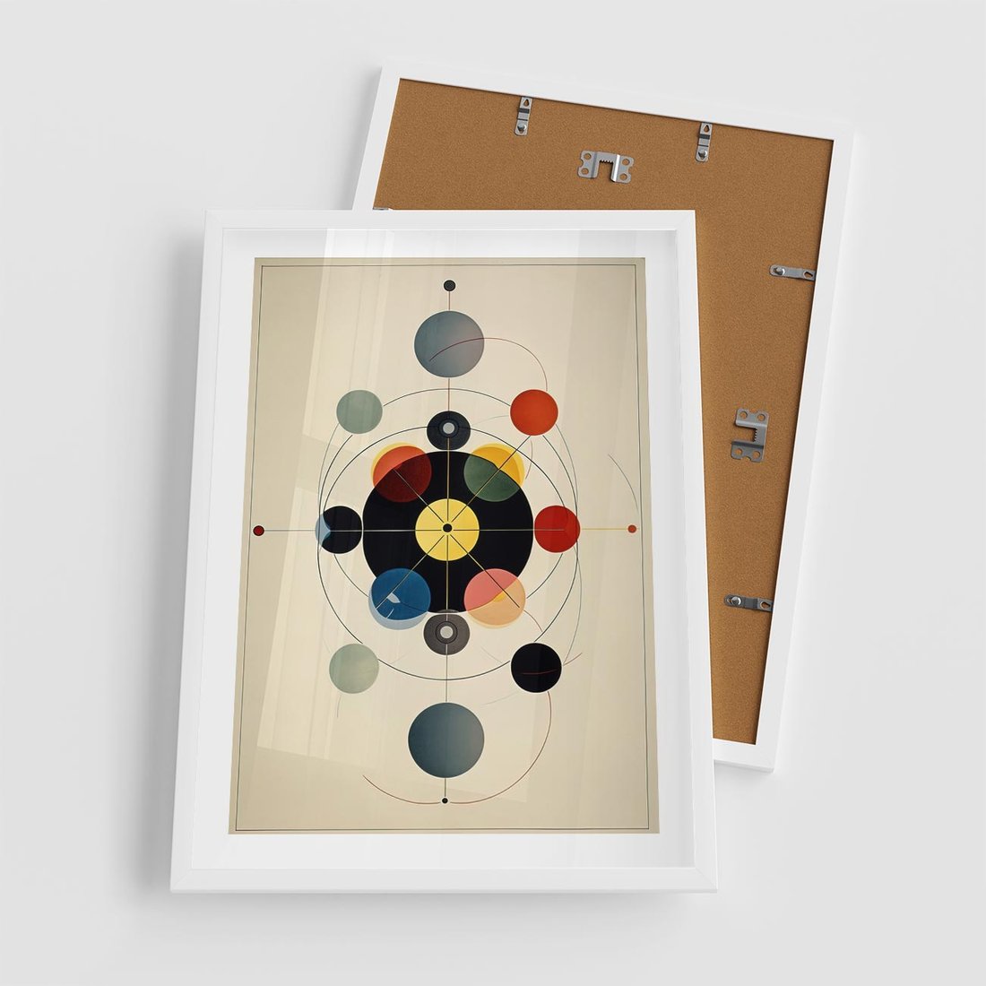 Ta abstrakcyjna geometryczna kompozycja zachwyca wyrazistymi kołami, dynamicznymi liniami i żywymi kolorami, nawiązującymi do charakterystycznego stylu Wassily'ego Kandinsky'ego. To wizualna podróż w świat abstrakcji i emocji.