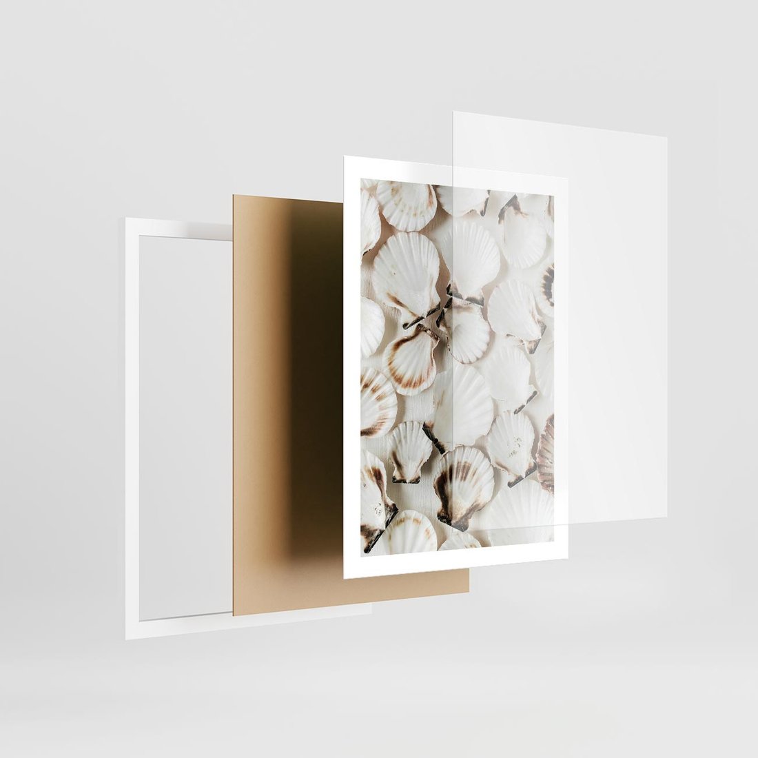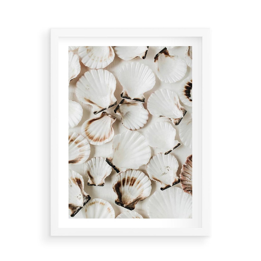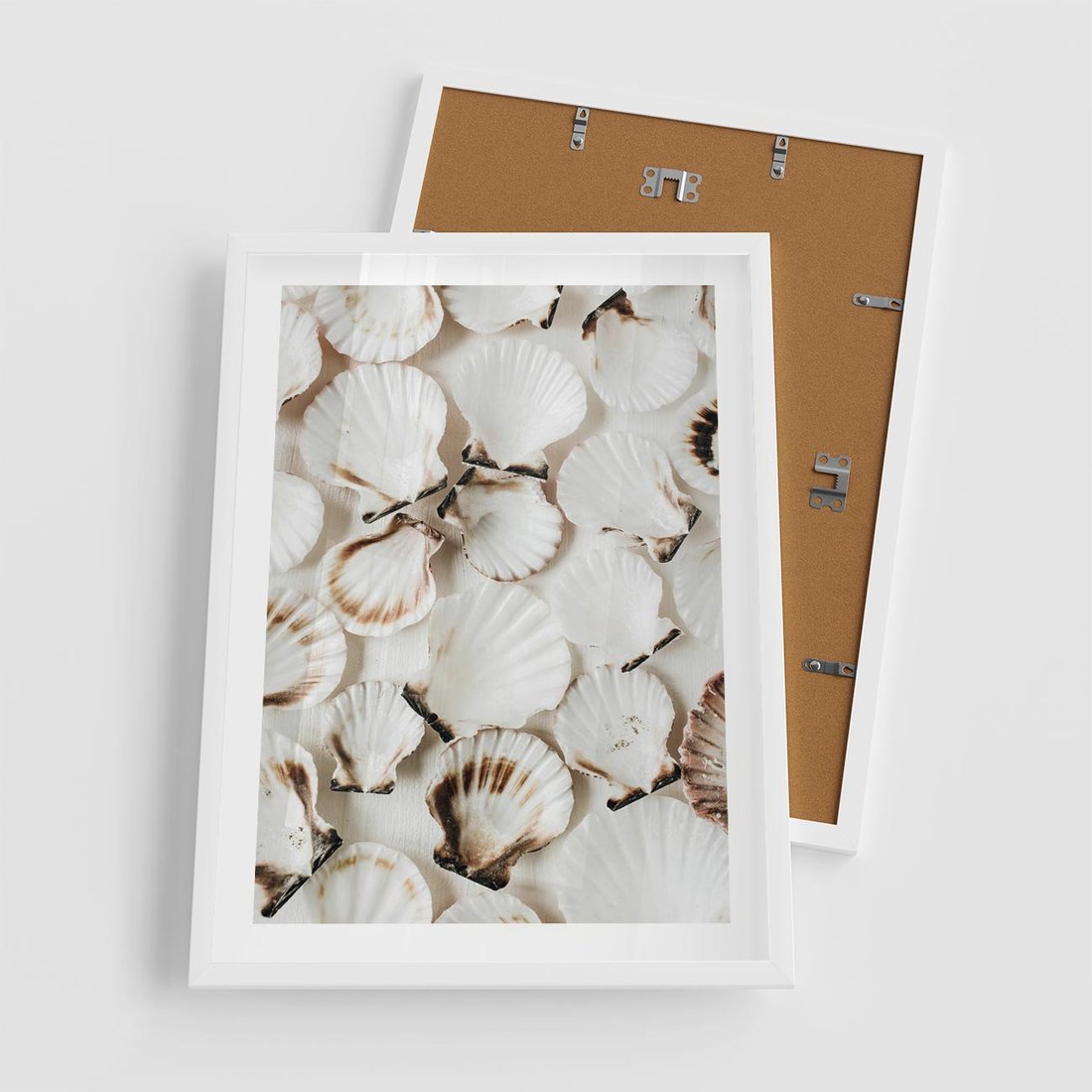 Plakat w ramie 50x70 - Białe Muszle - białe muszle, ujęcie z góry - rama biała
