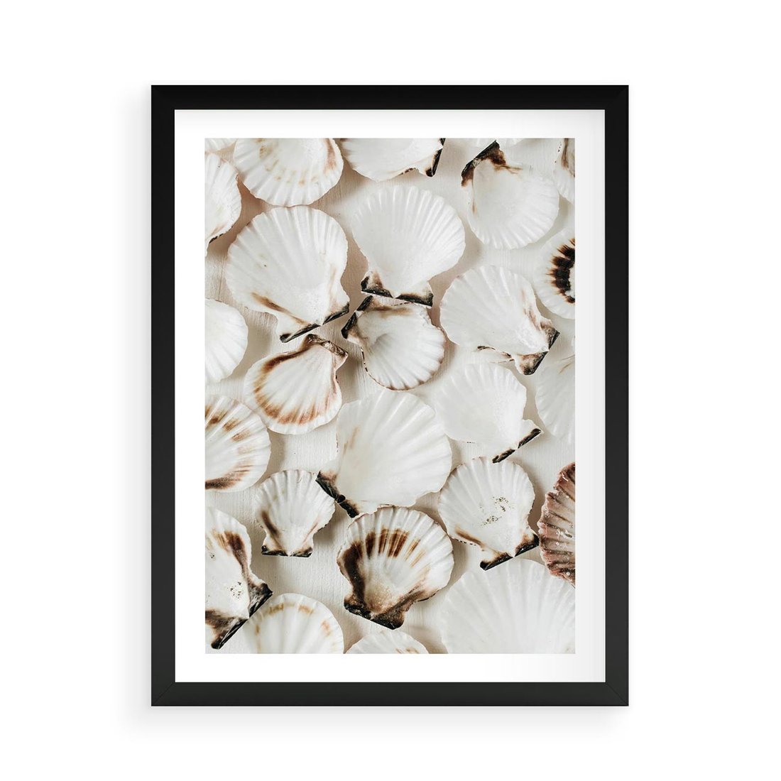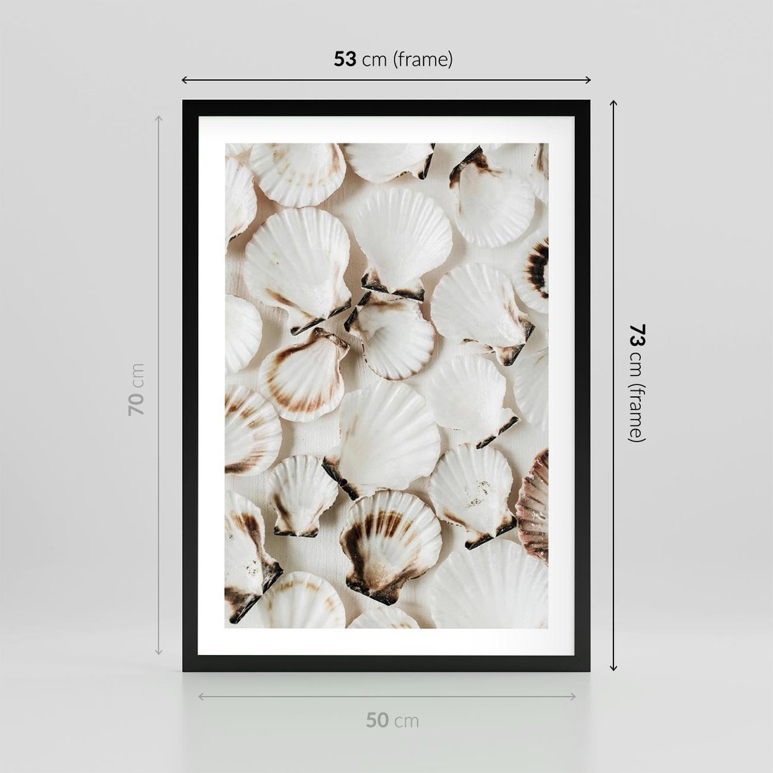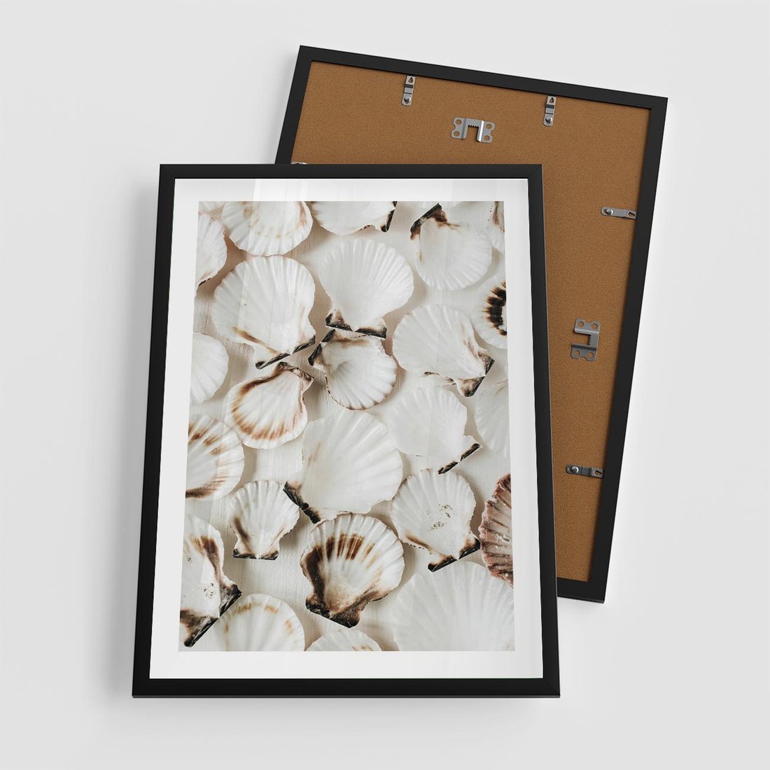 Plakat w ramie 50x70 - Białe Muszle - białe muszle, ujęcie z góry - rama czarna