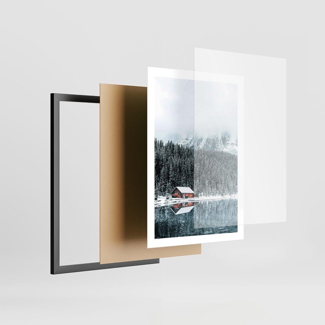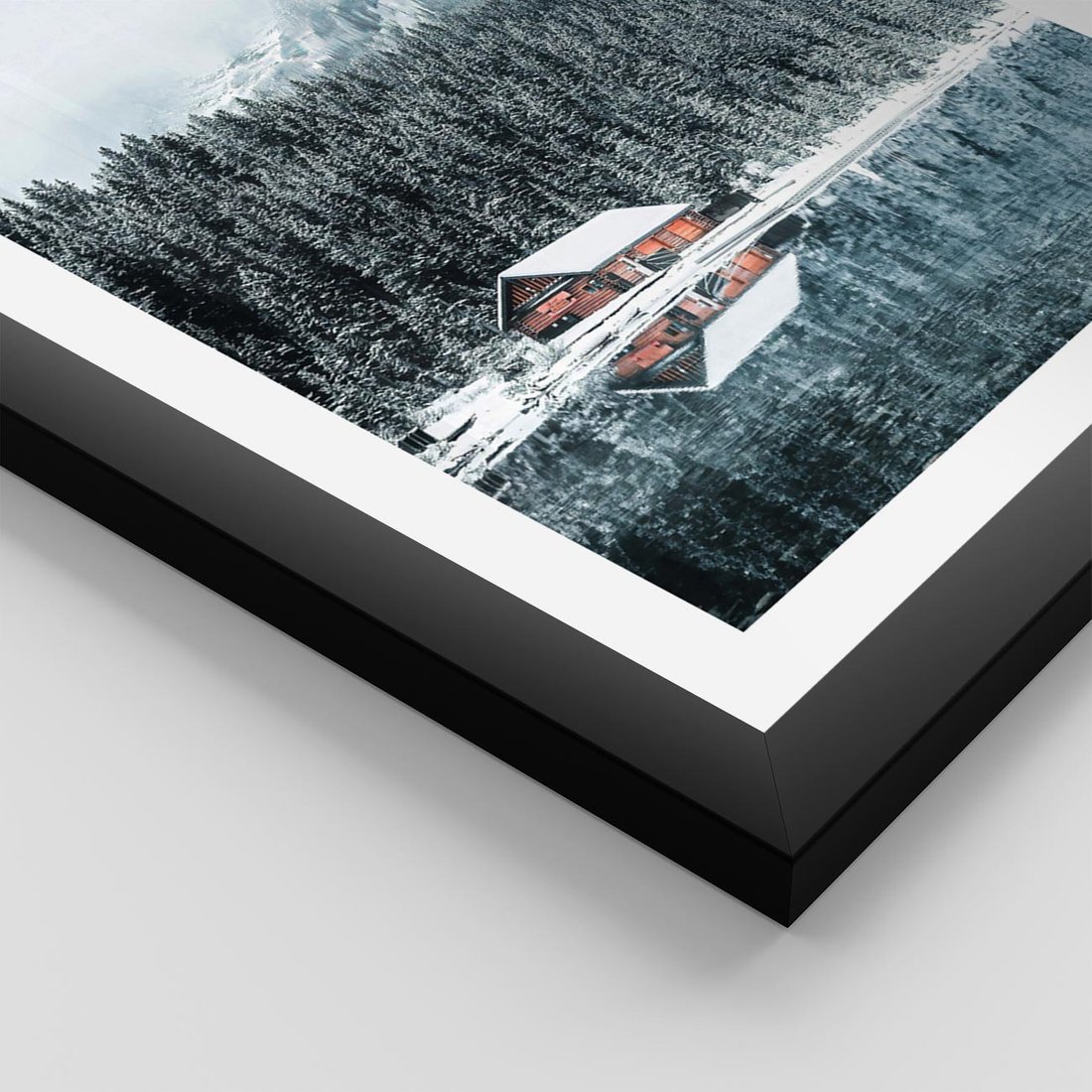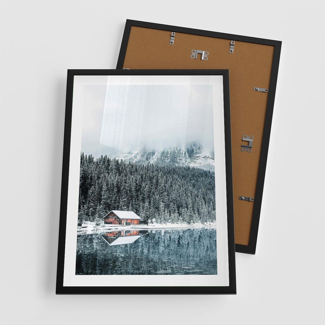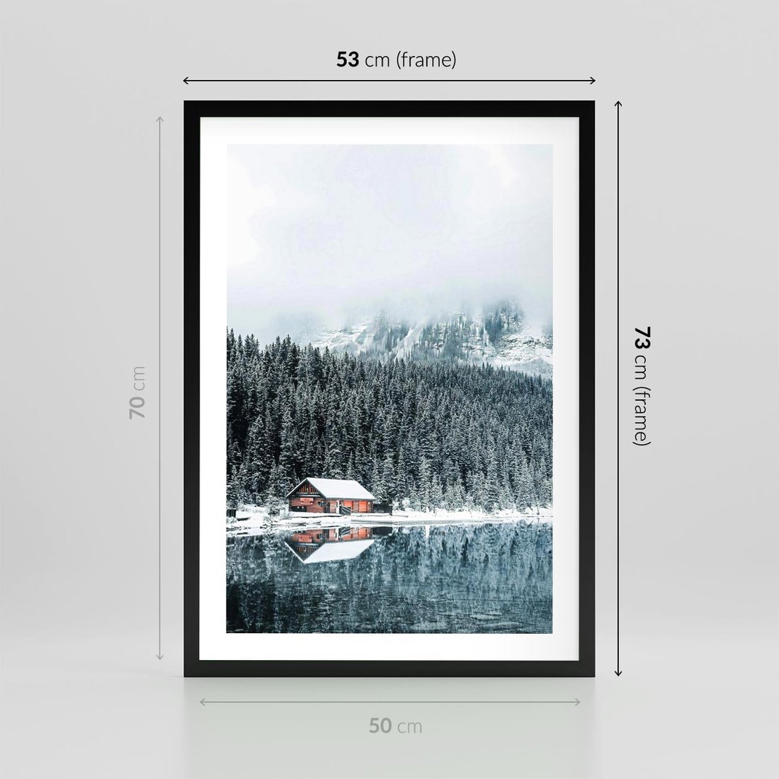 Plakat w ramie 50x70 - Biały Domek - domek w górach, zima - rama czarna